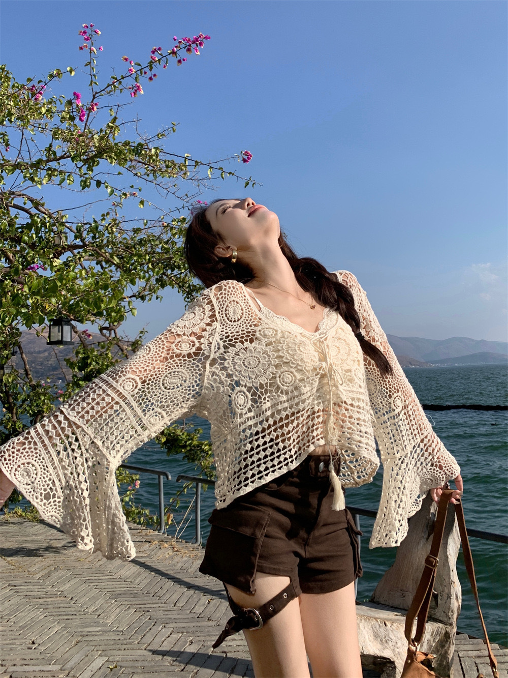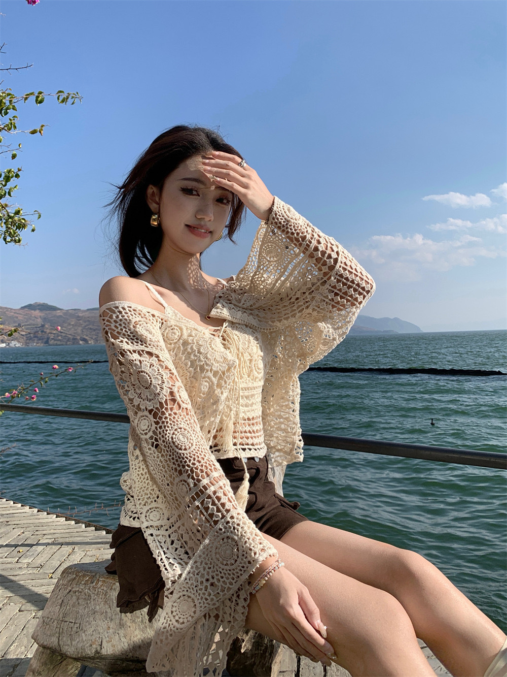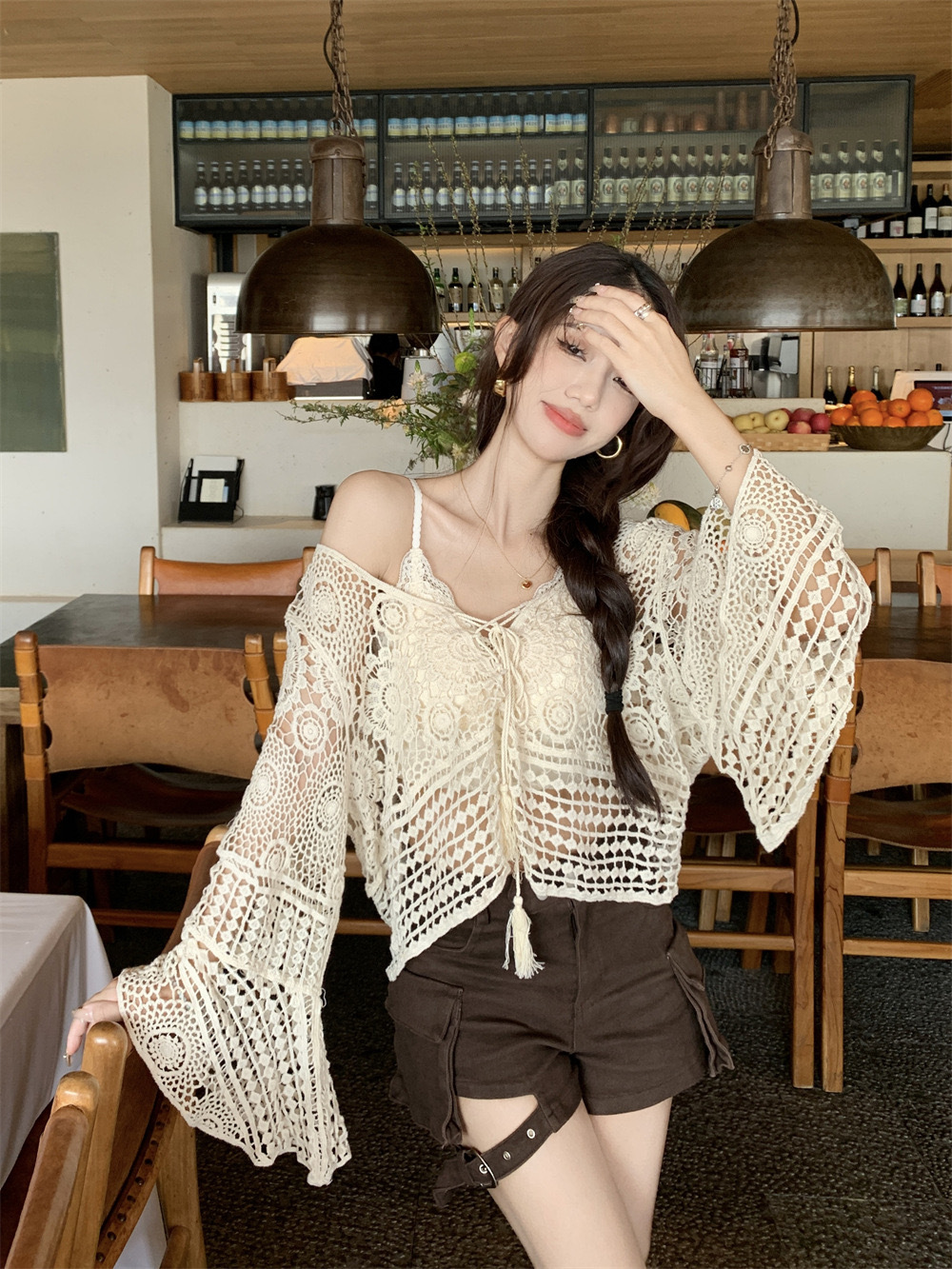 샤넬 스타일 빈 V-넥 니트 스웨터 여성용 여름 얇은 느슨한 드로우 선 스크린 블라우스 디자인 센스 쇼트 탑