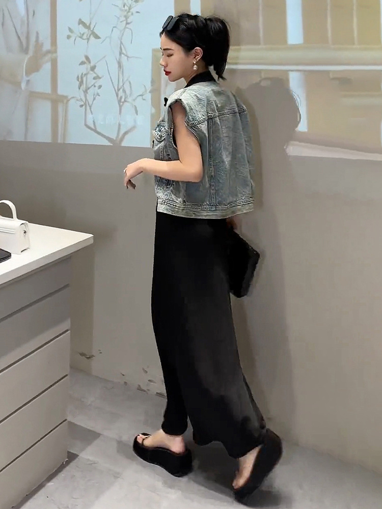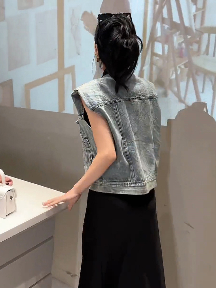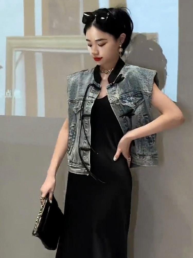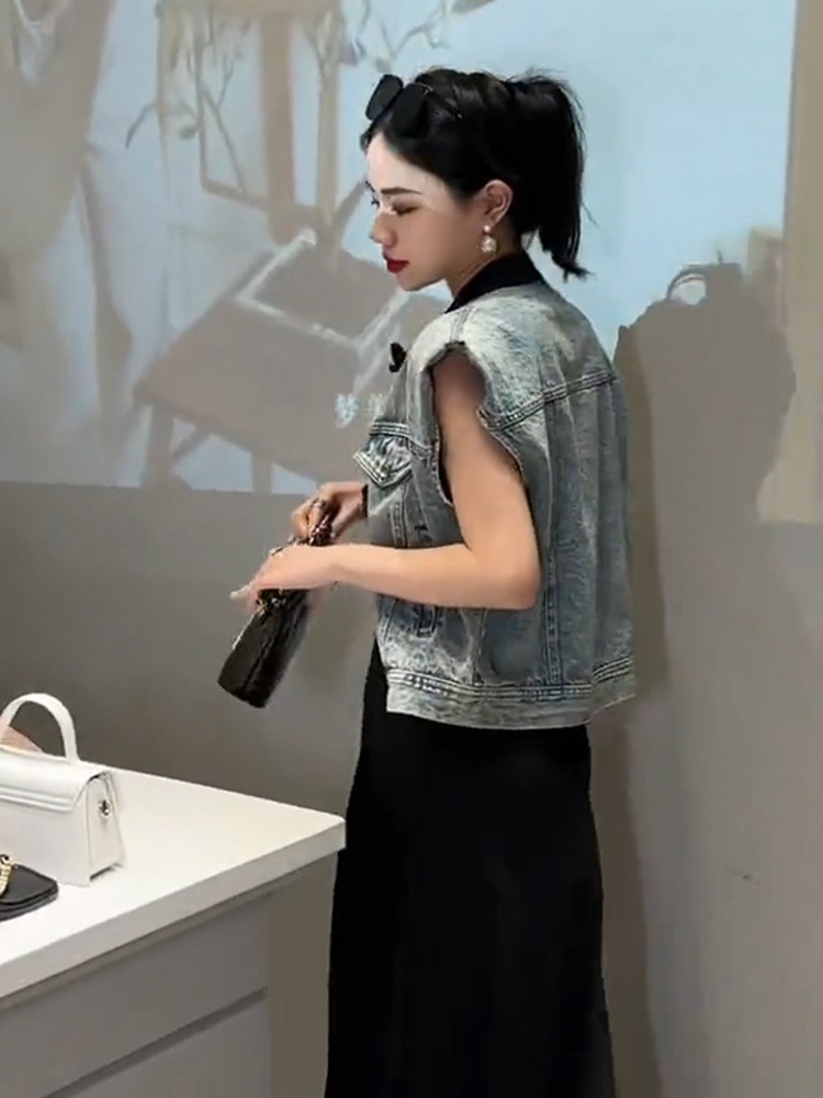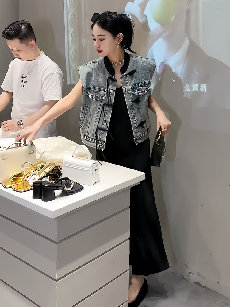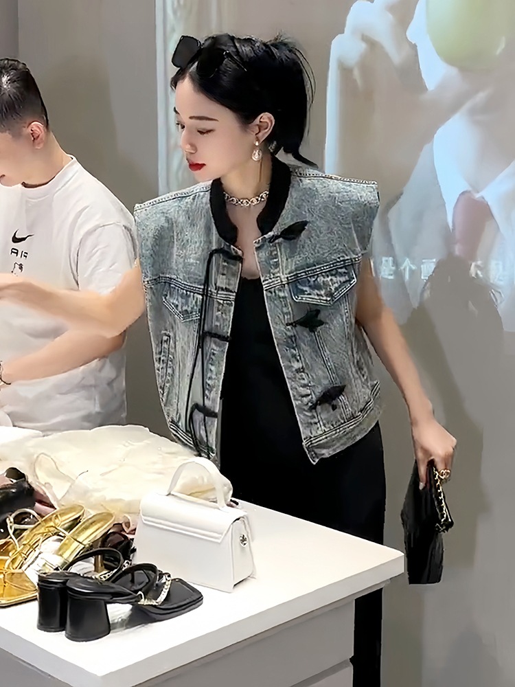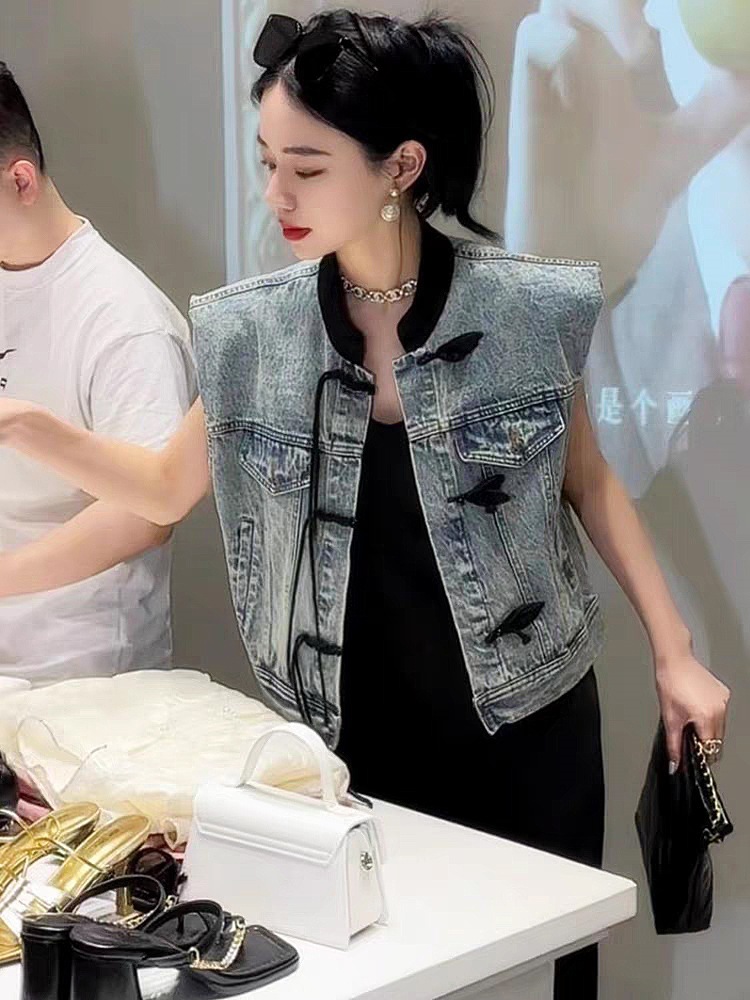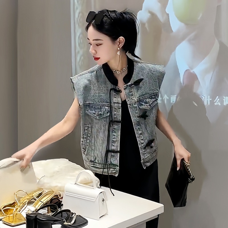 이른 봄 가을 중국 데님 조끼 여자 여름 2024 작은 남자를위한 새로운 스타일 짧은 정상스토어 가기