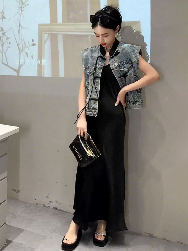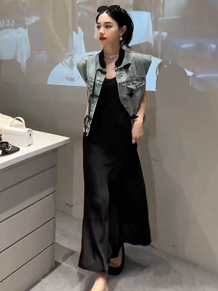 이른 봄 가을 중국 데님 조끼 여자 여름 2024 작은 남자를위한 새로운 스타일 짧은 정상