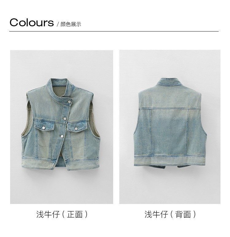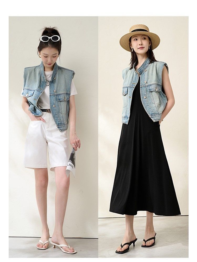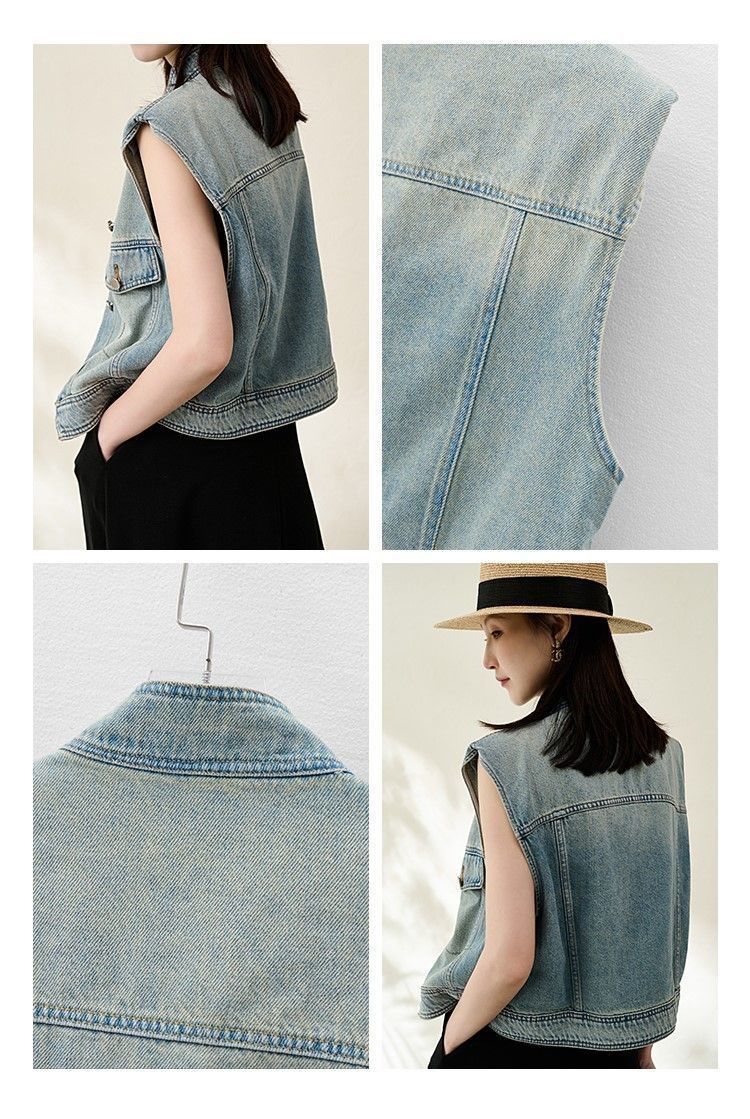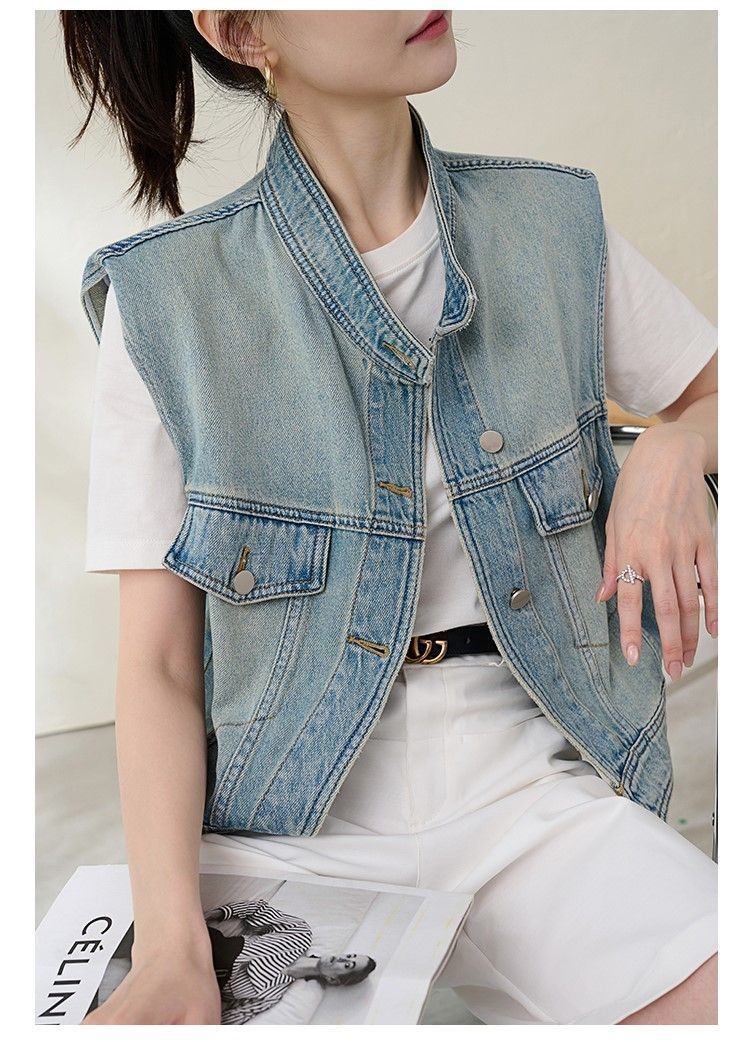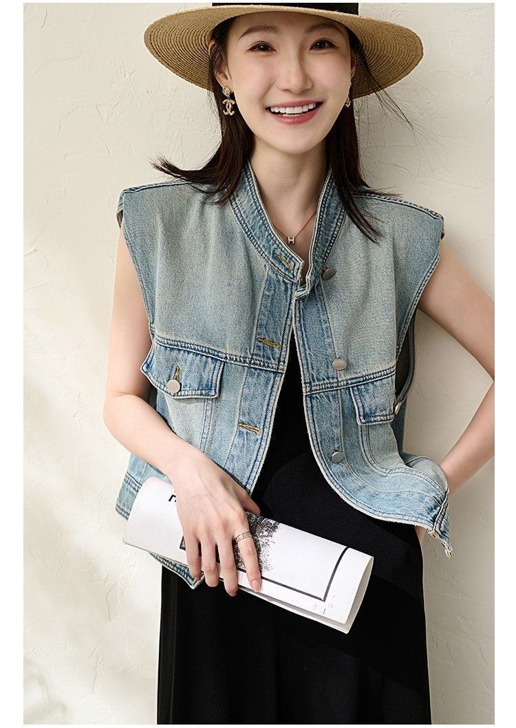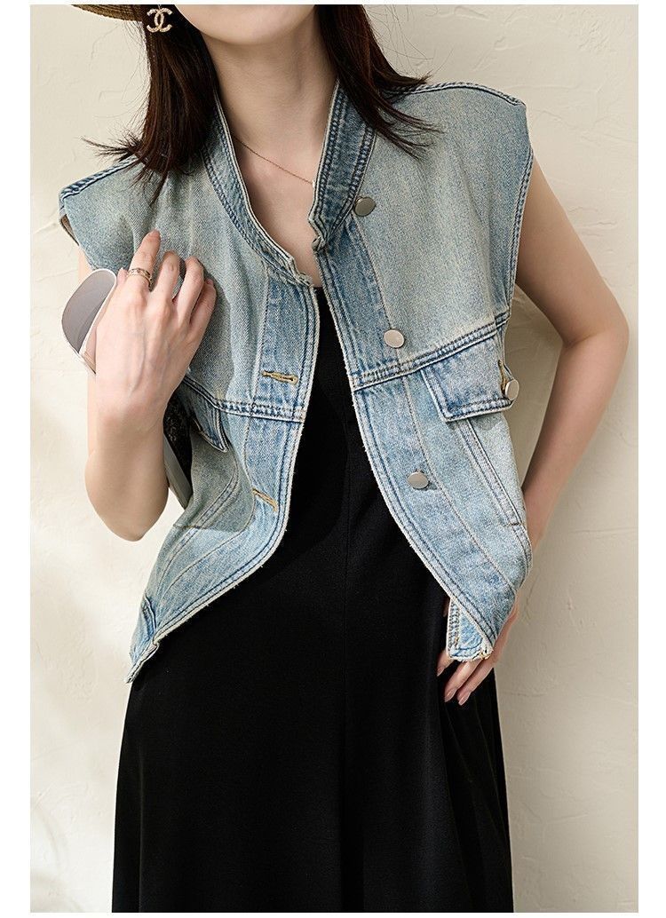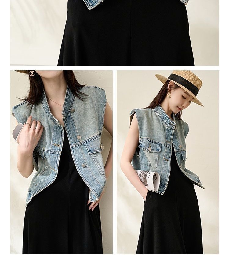 유럽 빈티지 고민 어깨 패드 데님 양복 조끼 여성 2024 년 봄과 여름 칼라 양복 조끼 느슨한 민소매 불규칙한 코트