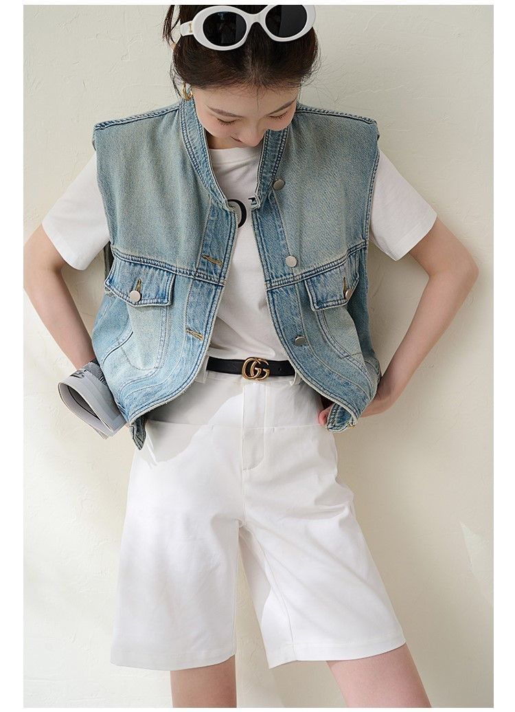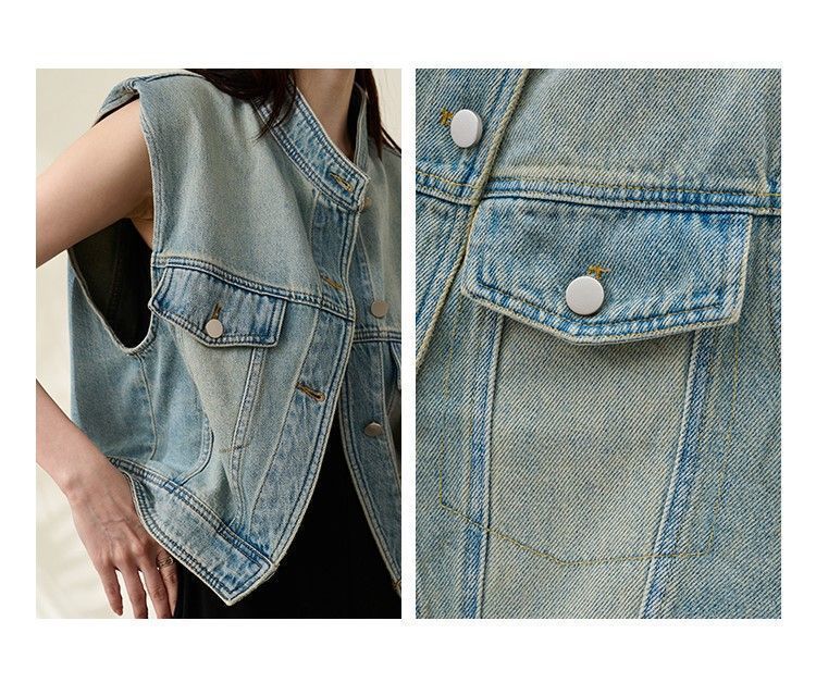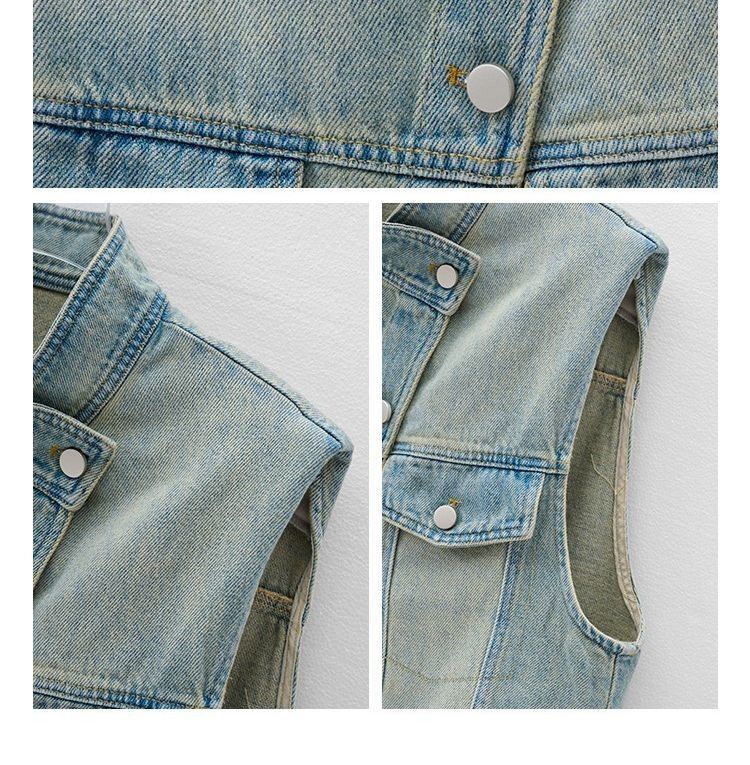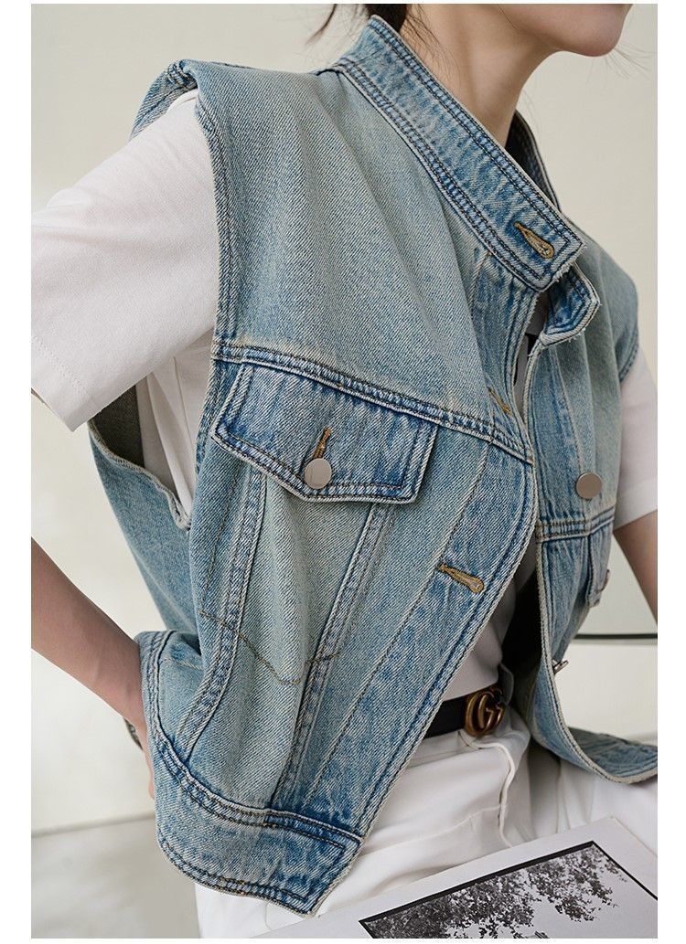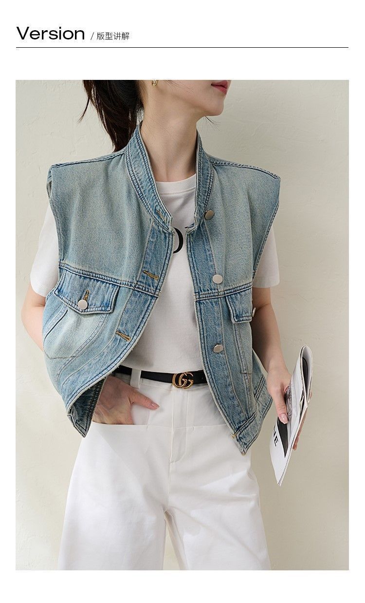 유럽 빈티지 고민 어깨 패드 데님 양복 조끼 여성 2024 년 봄과 여름 칼라 양복 조끼 느슨한 민소매 불규칙한 코트스토어 가기