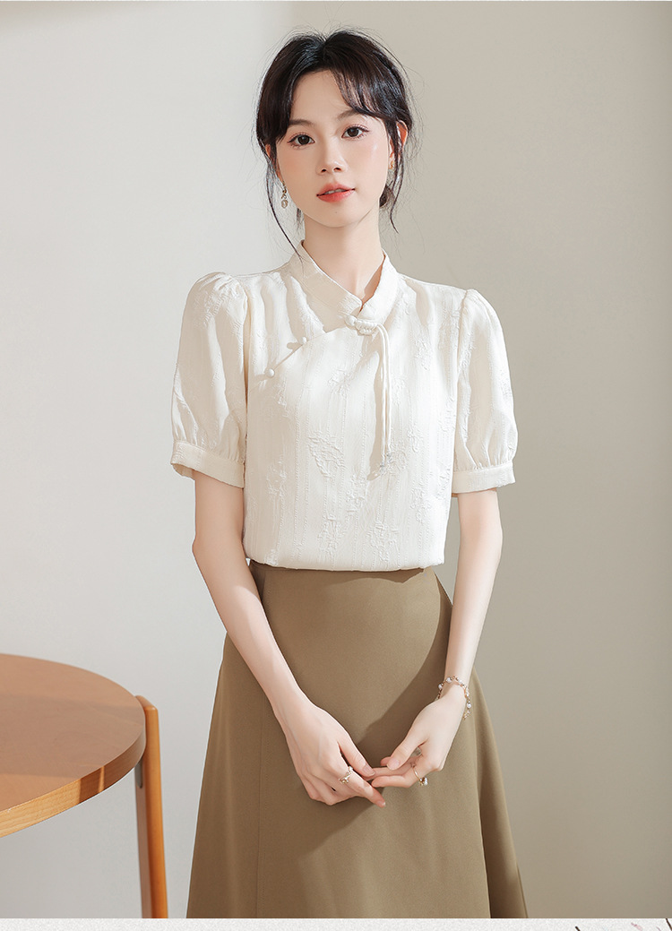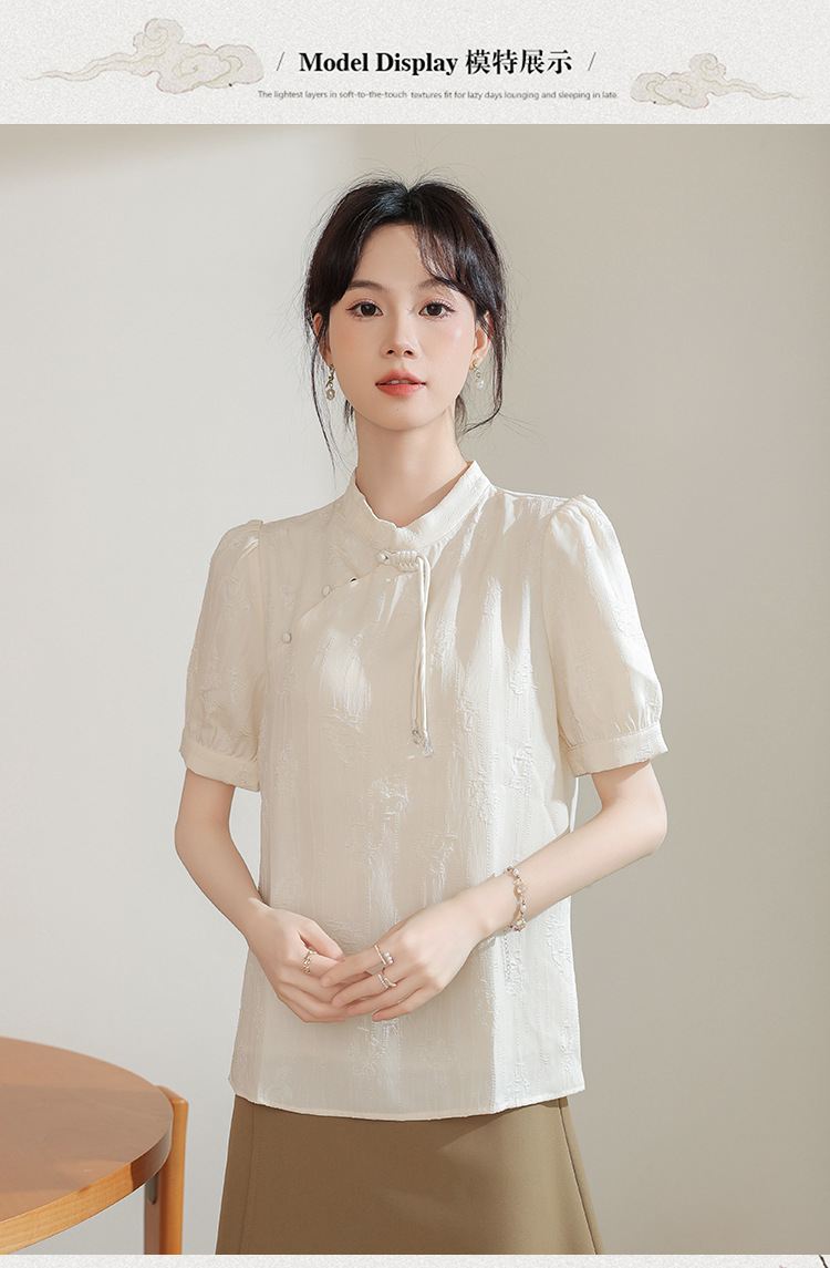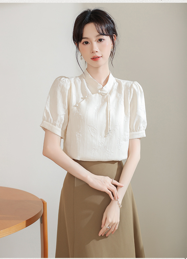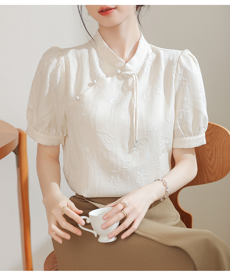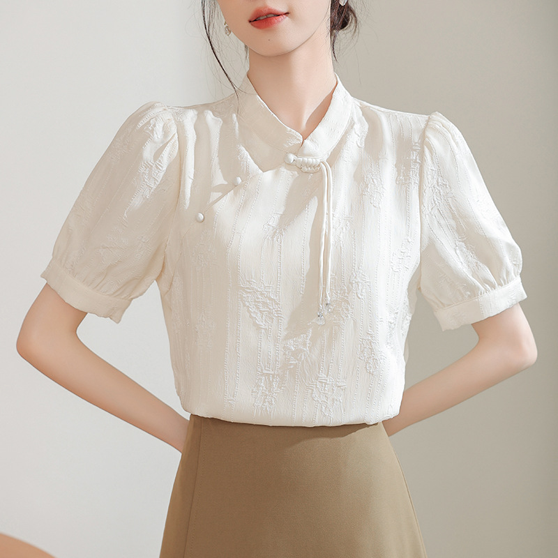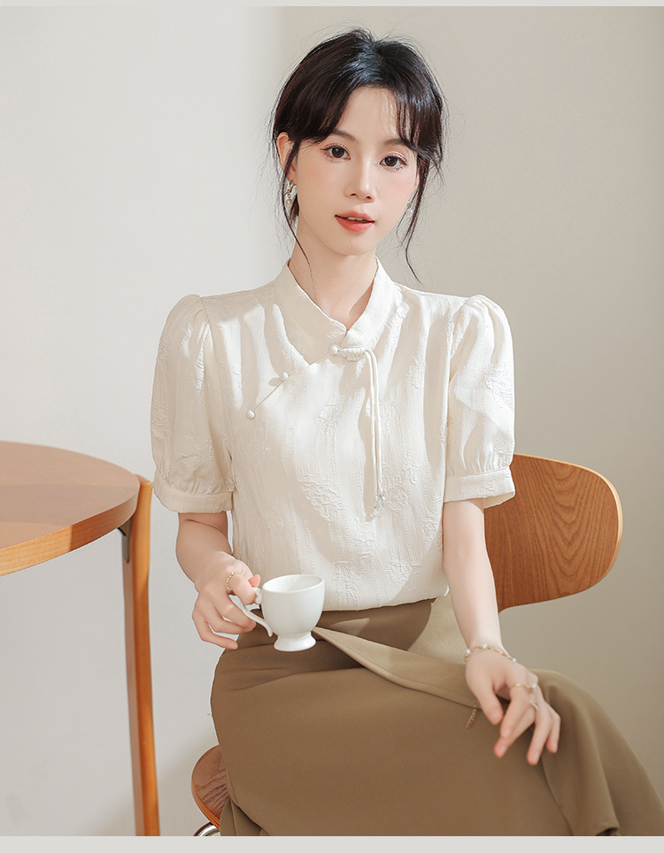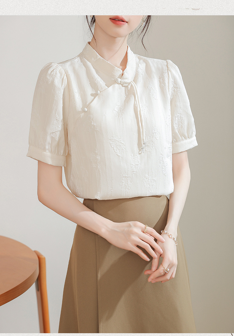 새로운 중국 스타일 국가 스타일 버튼 탑 우아한 쉬폰 셔츠 여성의 2024 여름 새로운 슬리밍 올 매치 반팔 셔츠