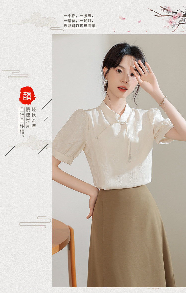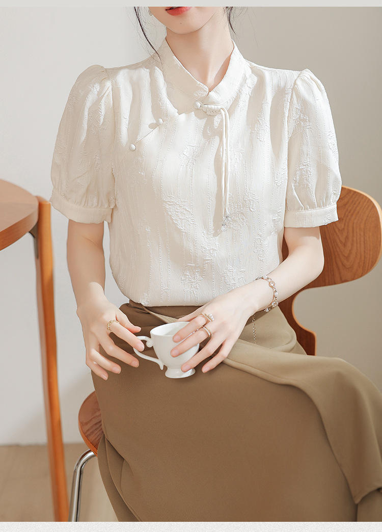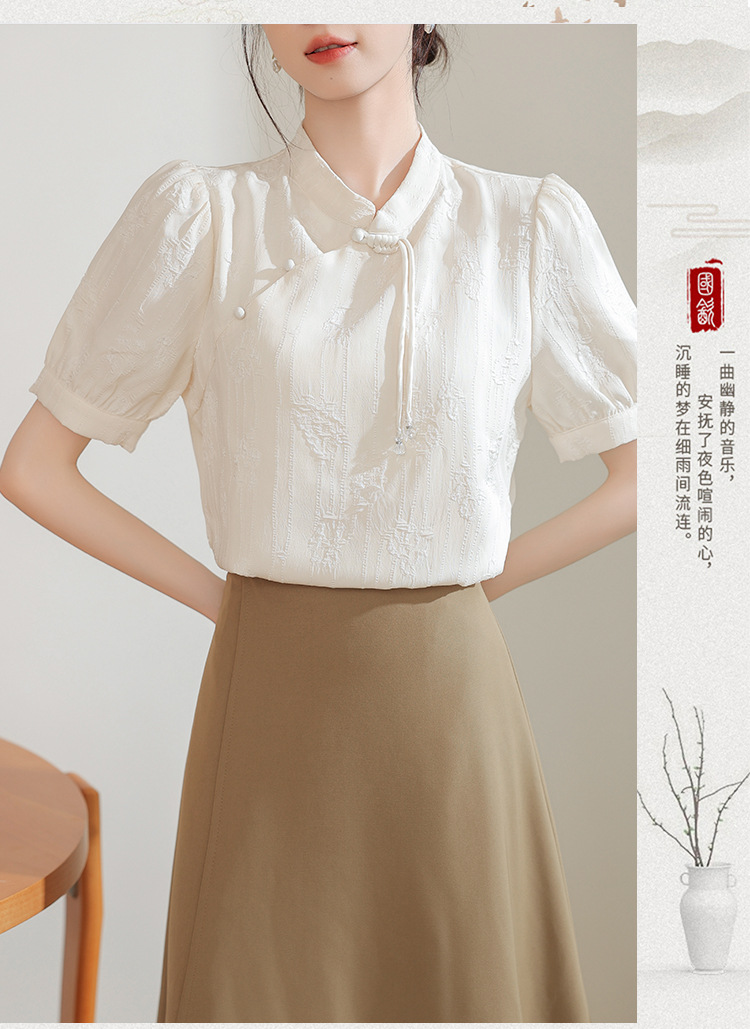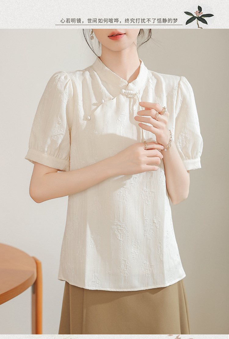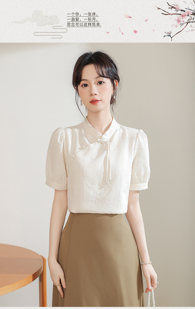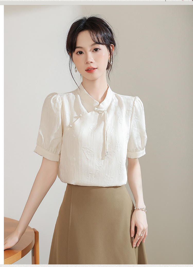 새로운 중국 스타일 국가 스타일 버튼 탑 우아한 쉬폰 셔츠 여성의 2024 여름 새로운 슬리밍 올 매치 반팔 셔츠