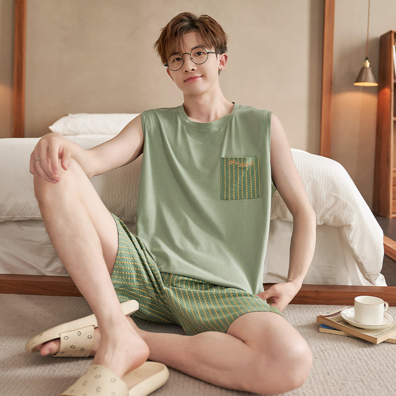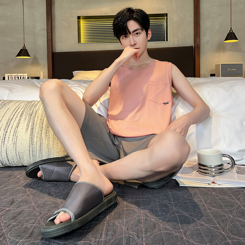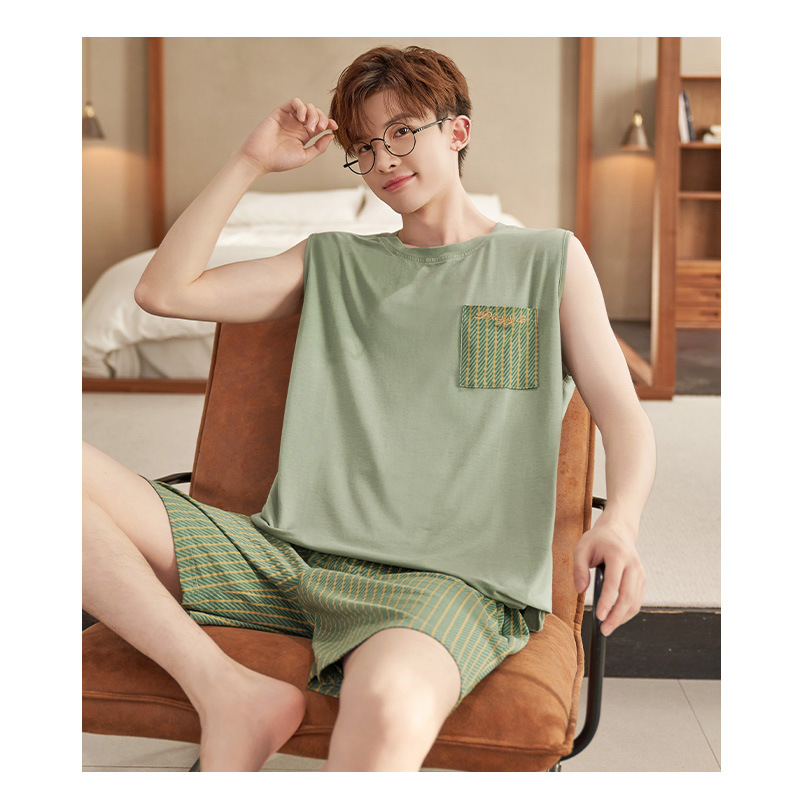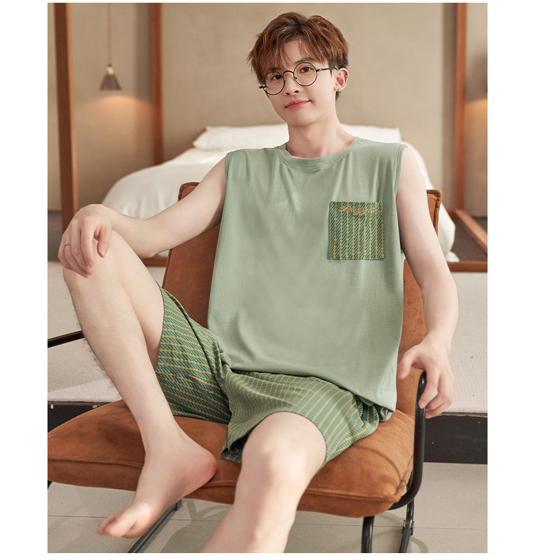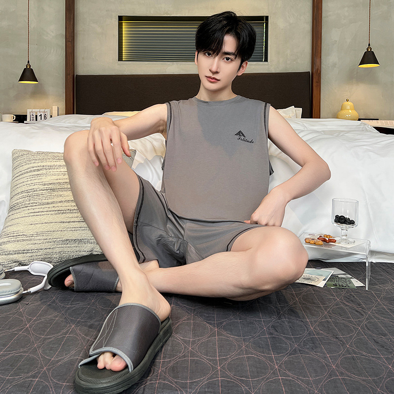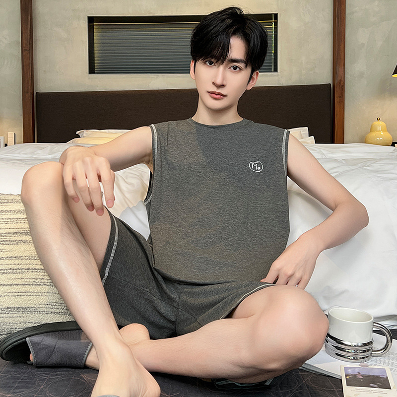 시원한 남성용 잠옷 여름 모달면 얇은 민소매 조끼 반바지는 가정용 의류 세트 도매 밖에서 입을 수 있습니다.스토어 가기