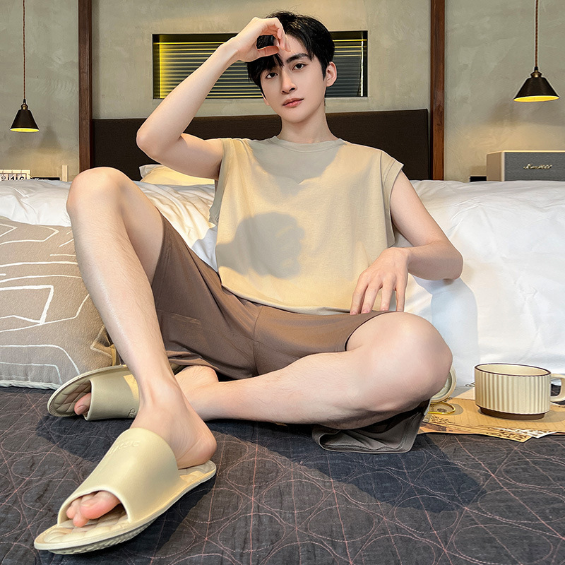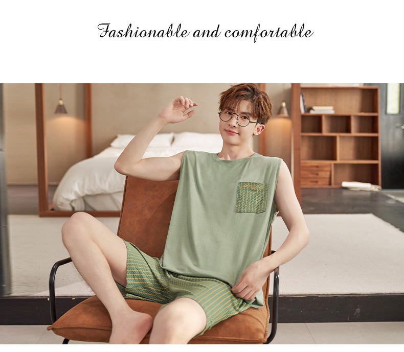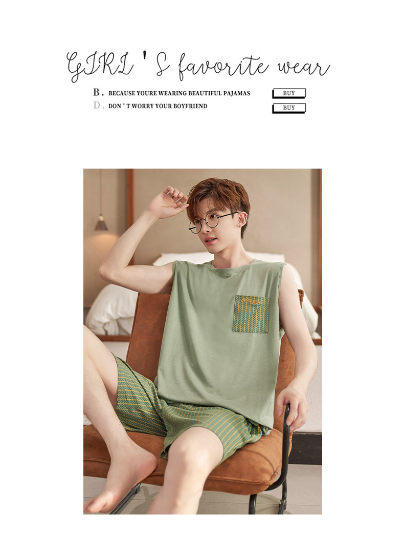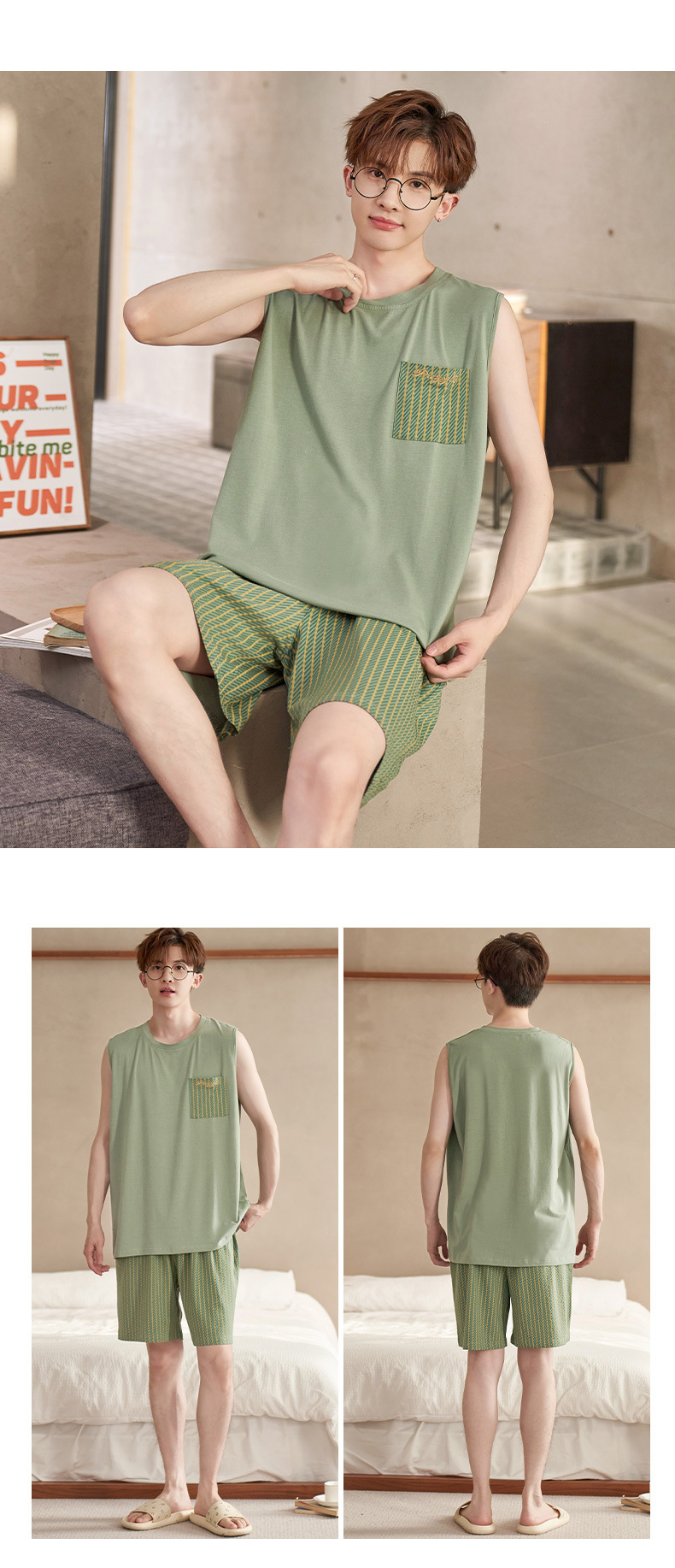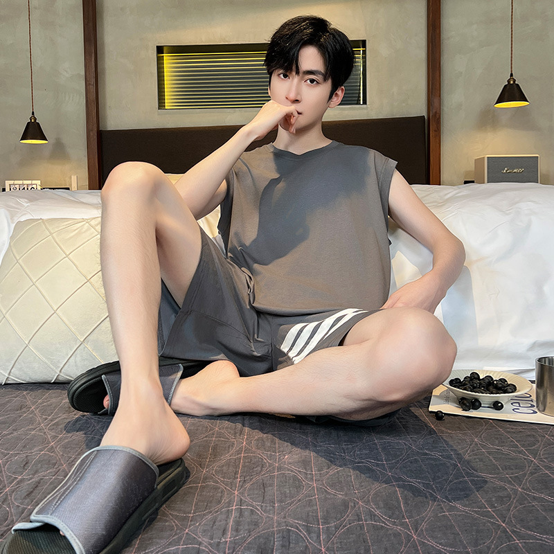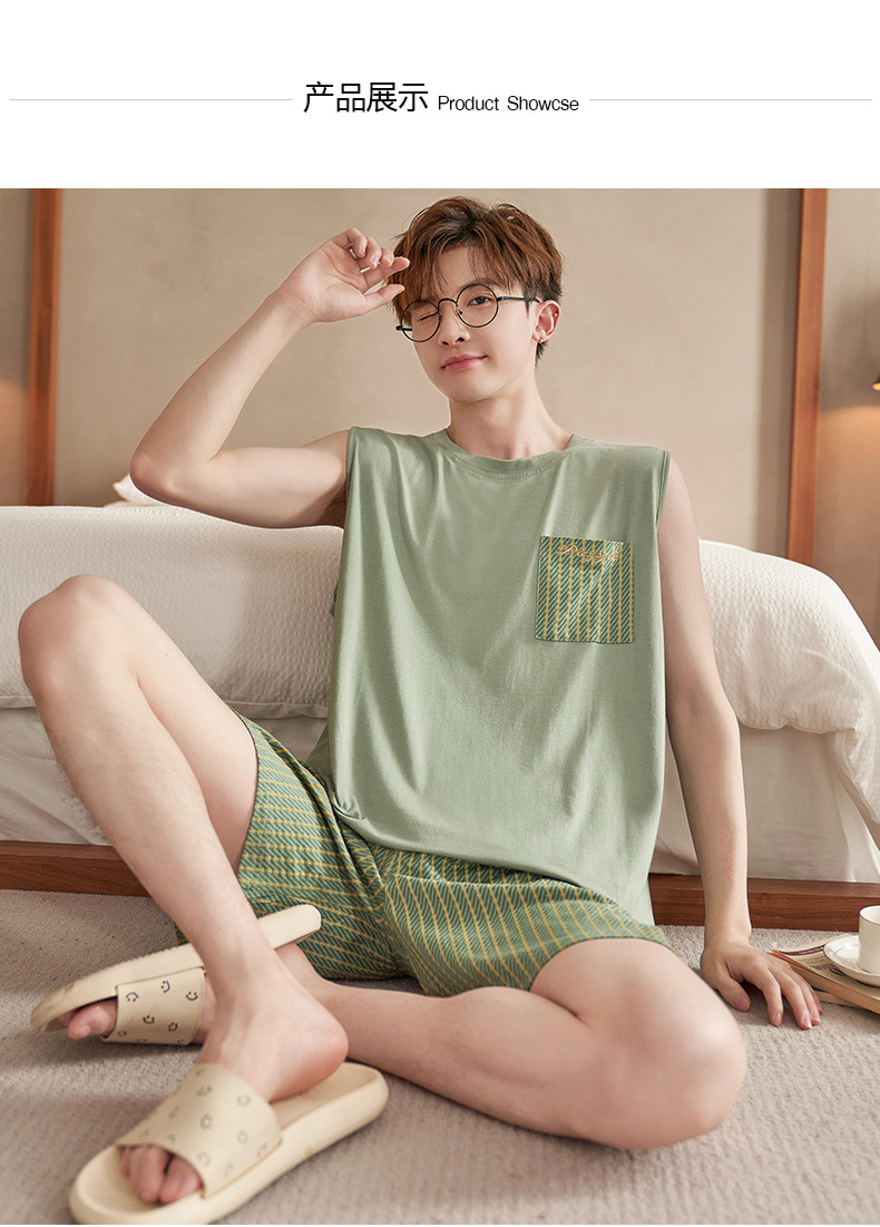 시원한 남성용 잠옷 여름 모달면 얇은 민소매 조끼 반바지는 가정용 의류 세트 도매 밖에서 입을 수 있습니다.스토어 가기