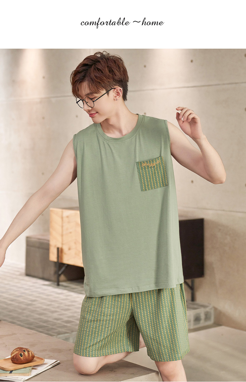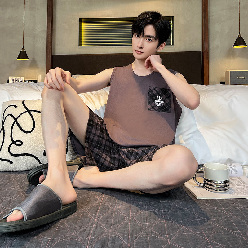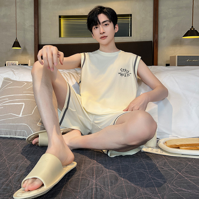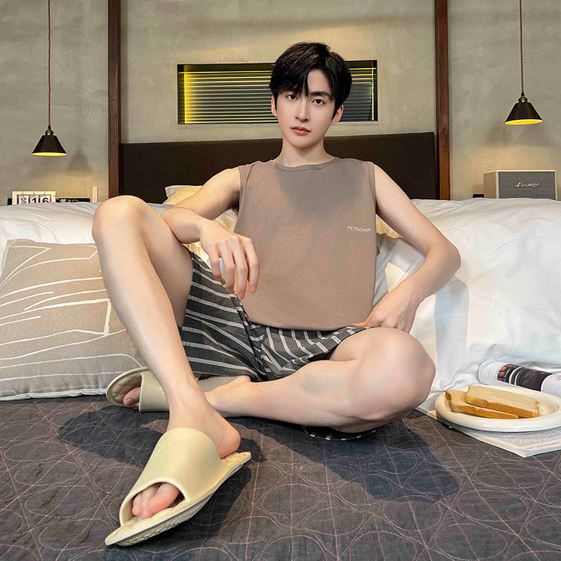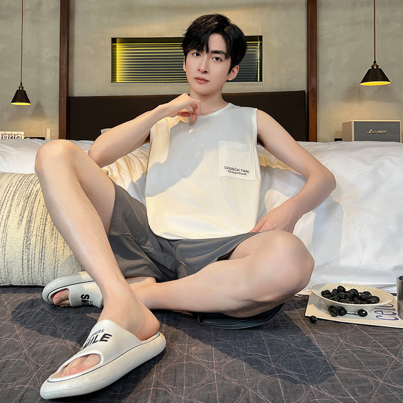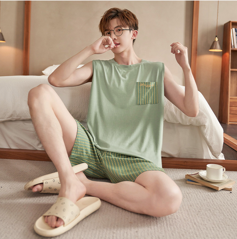 시원한 남성용 잠옷 여름 모달면 얇은 민소매 조끼 반바지는 가정용 의류 세트 도매 밖에서 입을 수 있습니다.스토어 가기