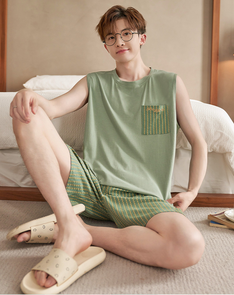 시원한 남성용 잠옷 여름 모달면 얇은 민소매 조끼 반바지는 가정용 의류 세트 도매 밖에서 입을 수 있습니다.