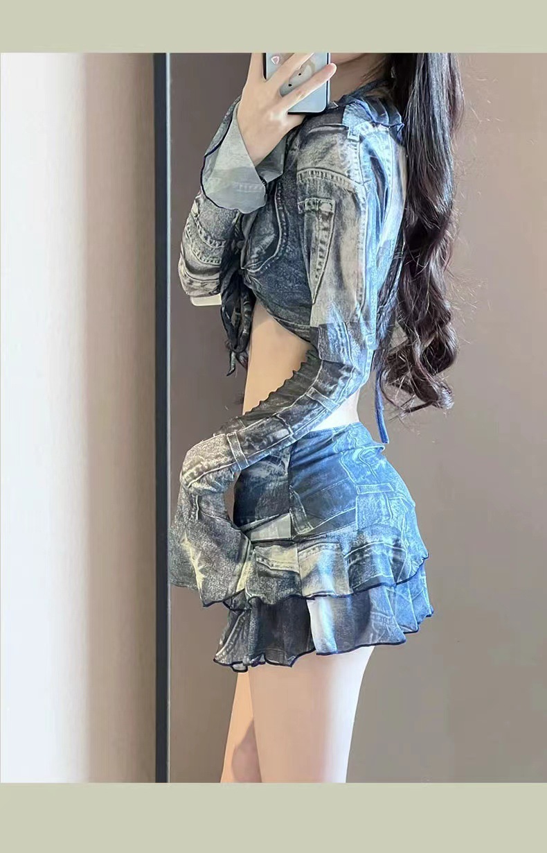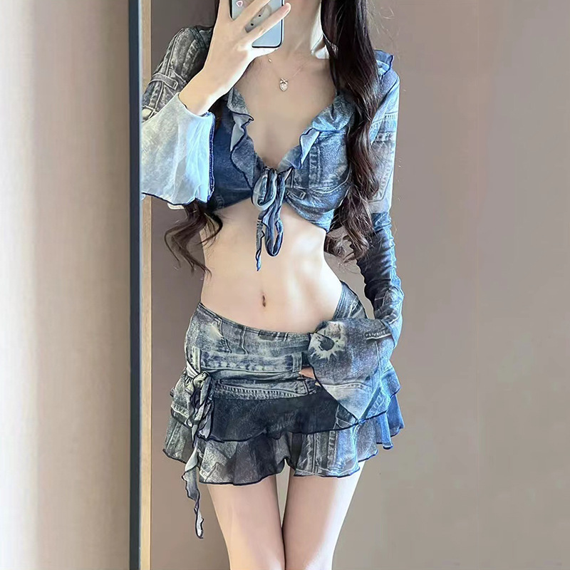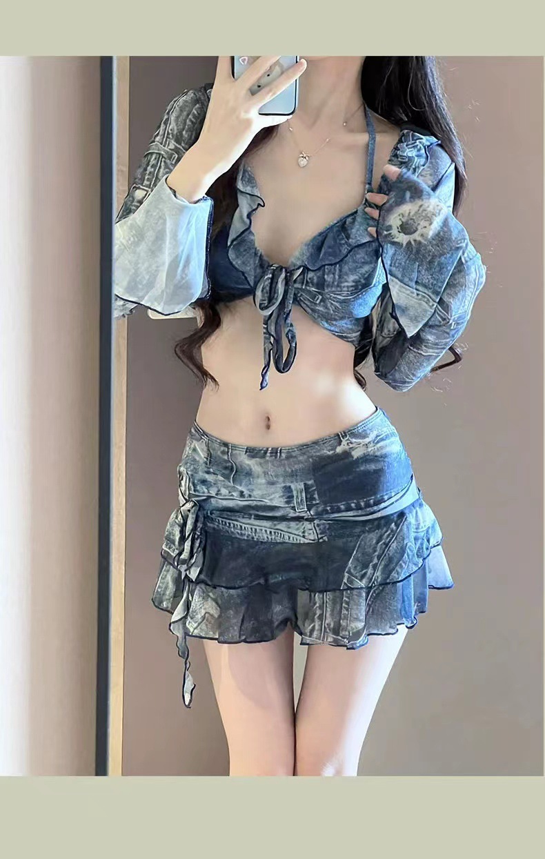 비키니 수영복 4 조각 긴팔 유행 복고풍 데님 블루 슬림-핏 핫 걸 비치 홀리데이 스파