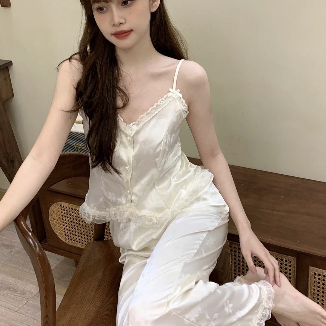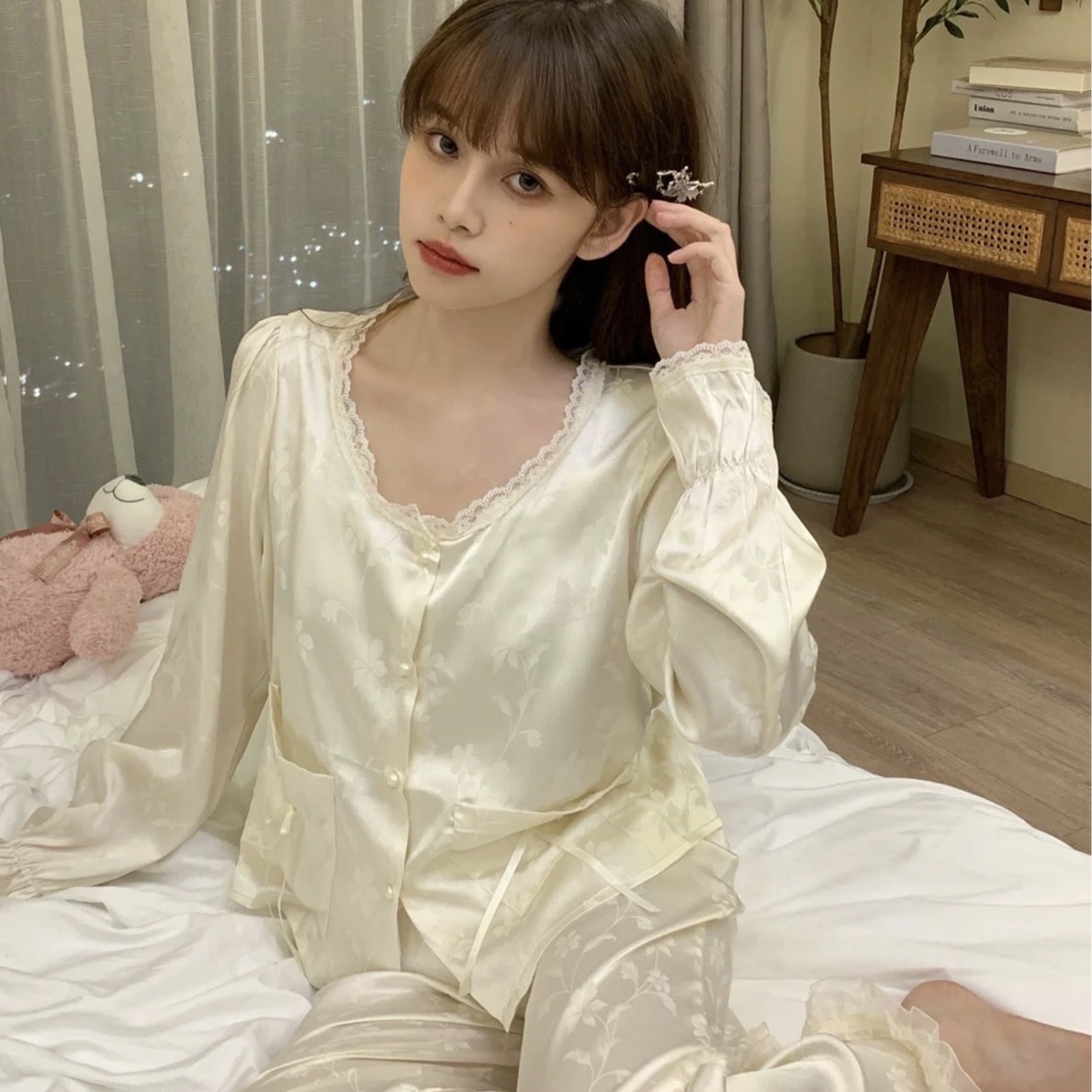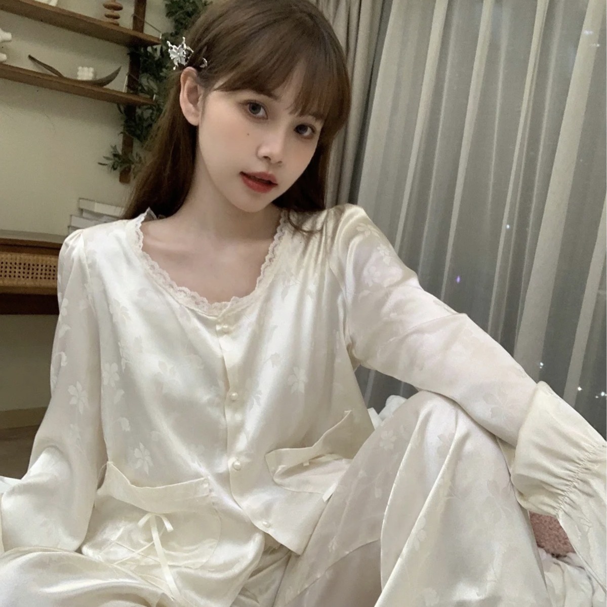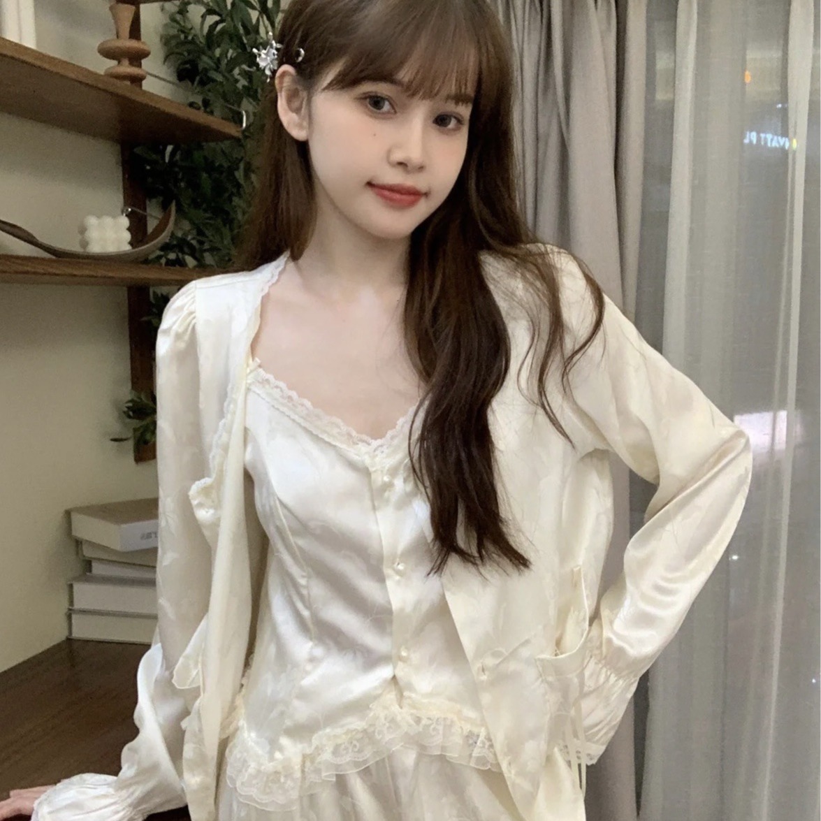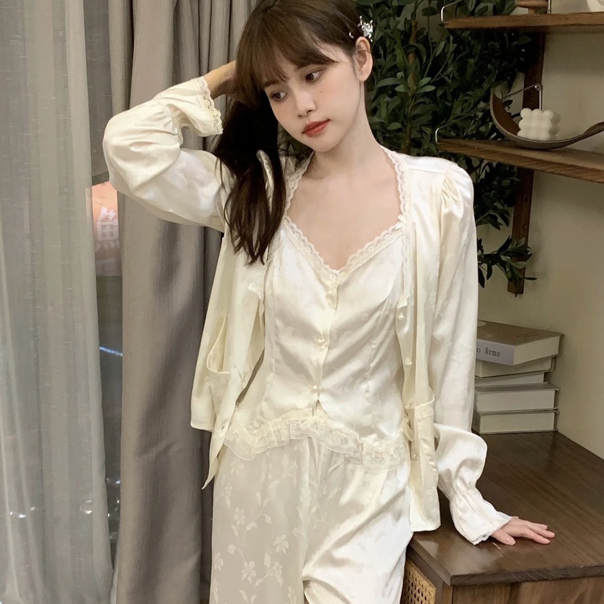 봄과 여름 새로운 아이스 실크 파자마 여성용 긴팔 Guofeng 3 피스 세트 홈 의상 홈 의류 세트 가슴 패드