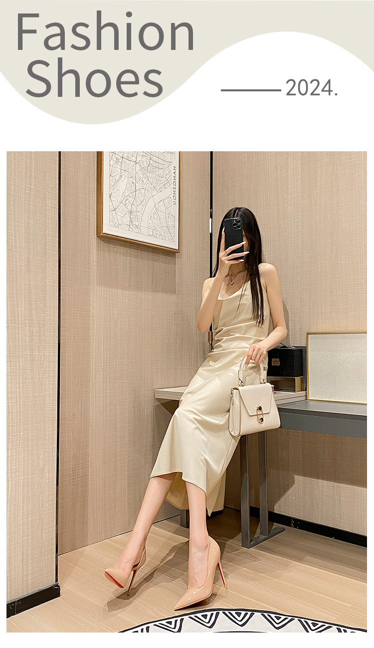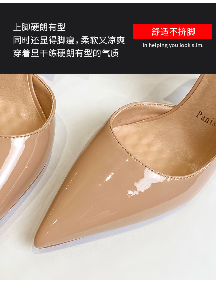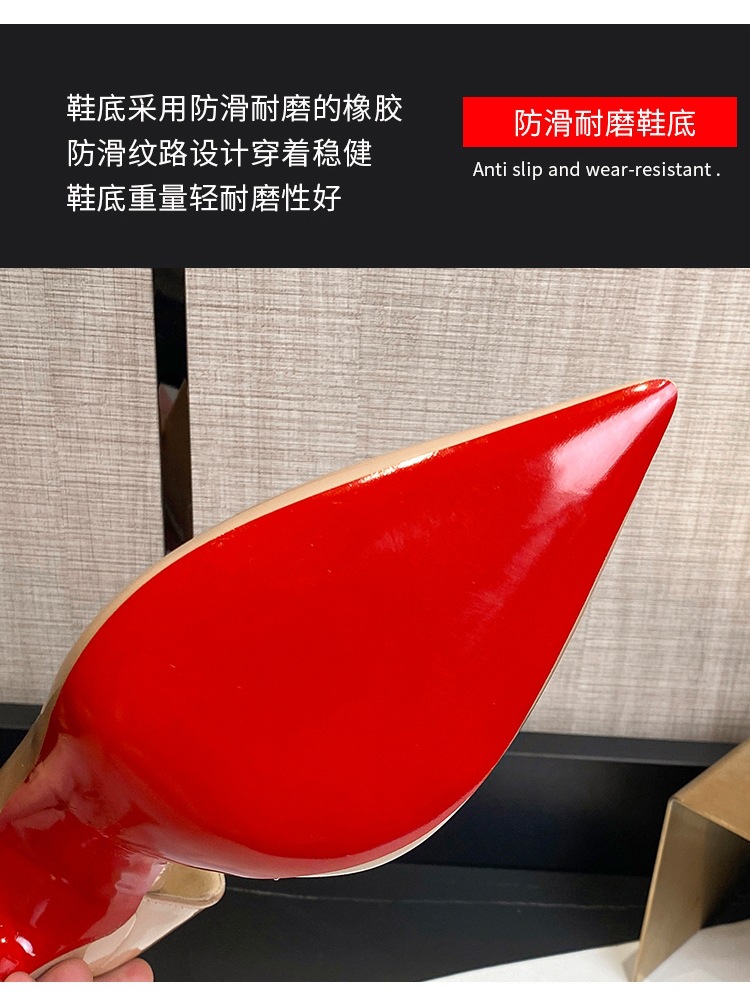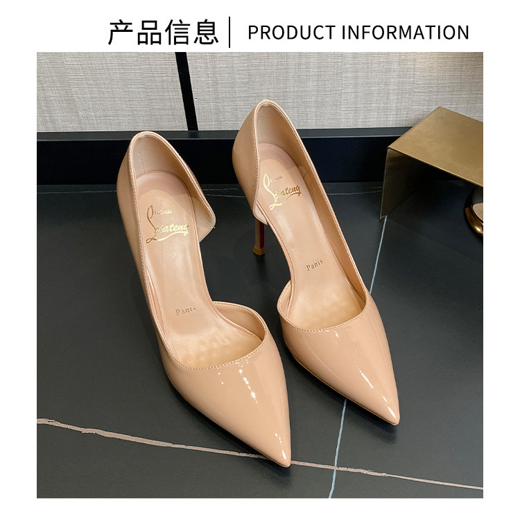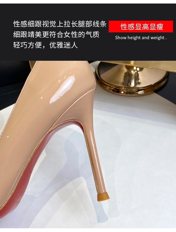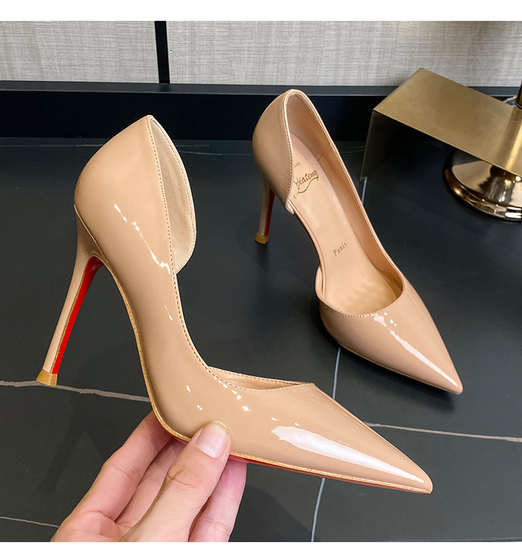 여성용 스팟 사이드 블랭크 컬러 하이힐, 인터넷 연예인 핫 스타일, 다재다능하고 섹시한 레드 바닥 뾰족한 앞코 페이턴트 가죽 슈즈스토어 가기