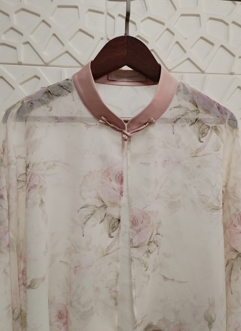 2024 여름 새로운 중국 스타일 플레이트 버튼 태양 보호 블라우스 랜턴 슬리브 스탠드 칼라 여성을위한 복고풍 중국 스타일 쉬폰 꽃 카디건스토어 가기