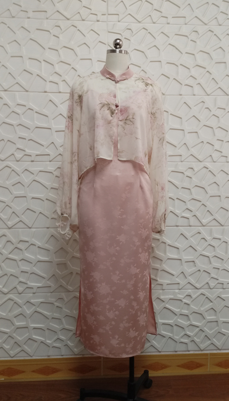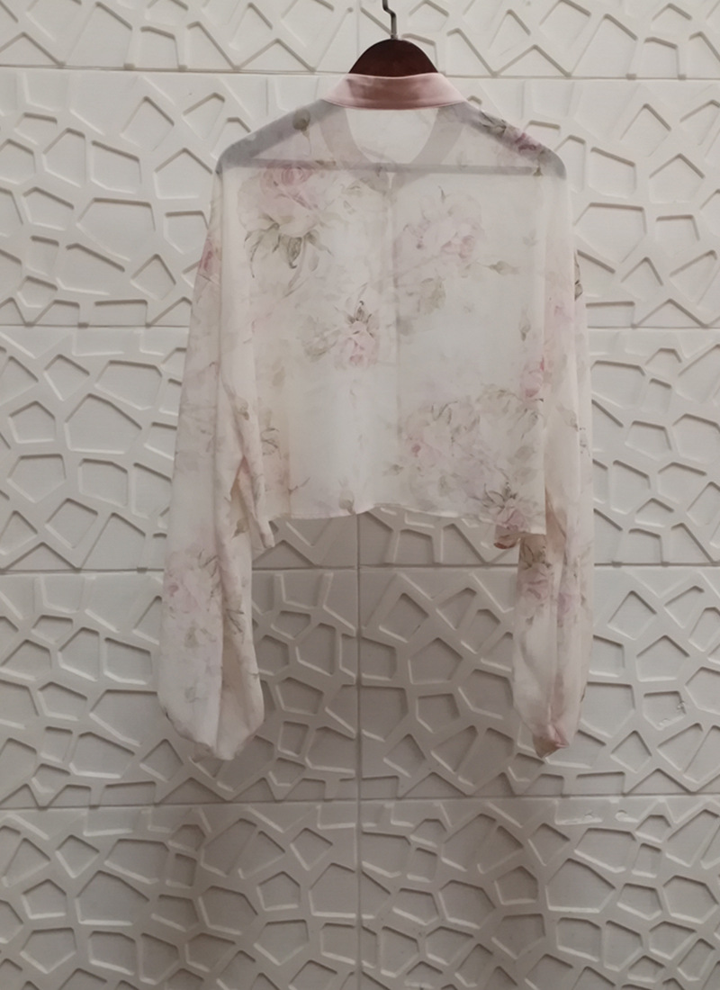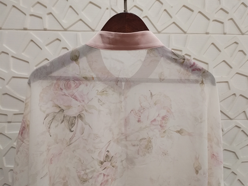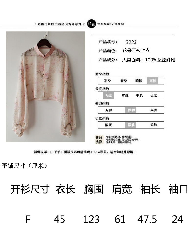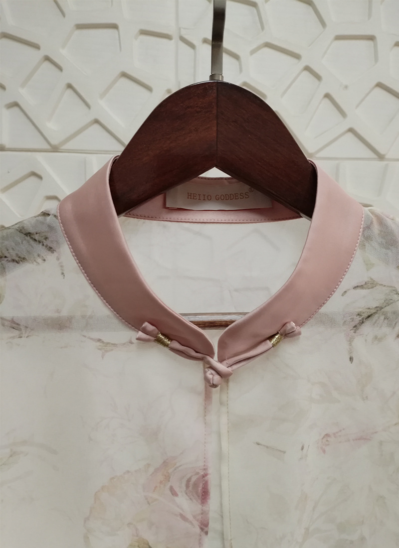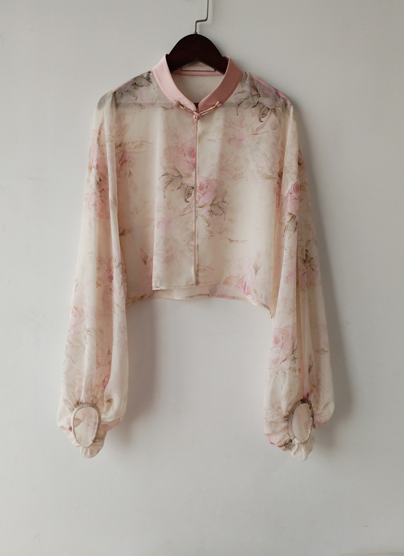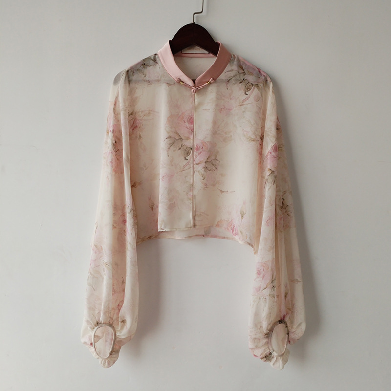 2024 여름 새로운 중국 스타일 플레이트 버튼 태양 보호 블라우스 랜턴 슬리브 스탠드 칼라 여성을위한 복고풍 중국 스타일 쉬폰 꽃 카디건