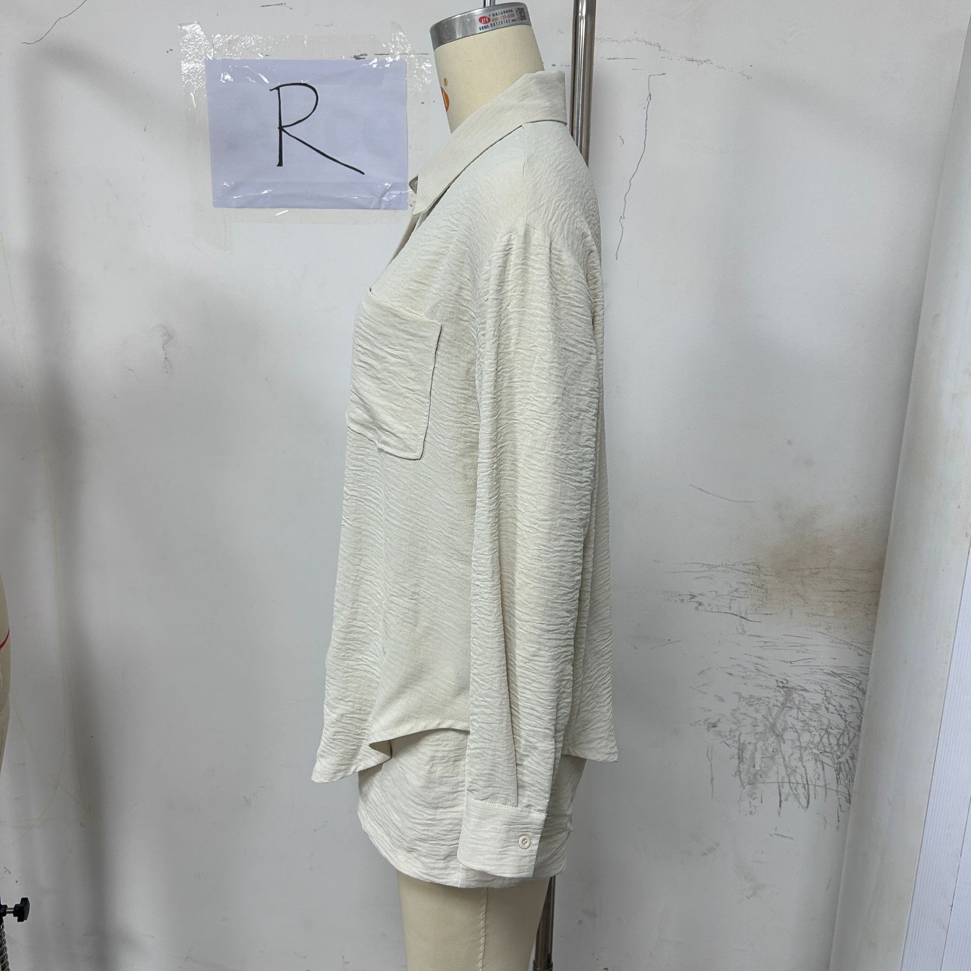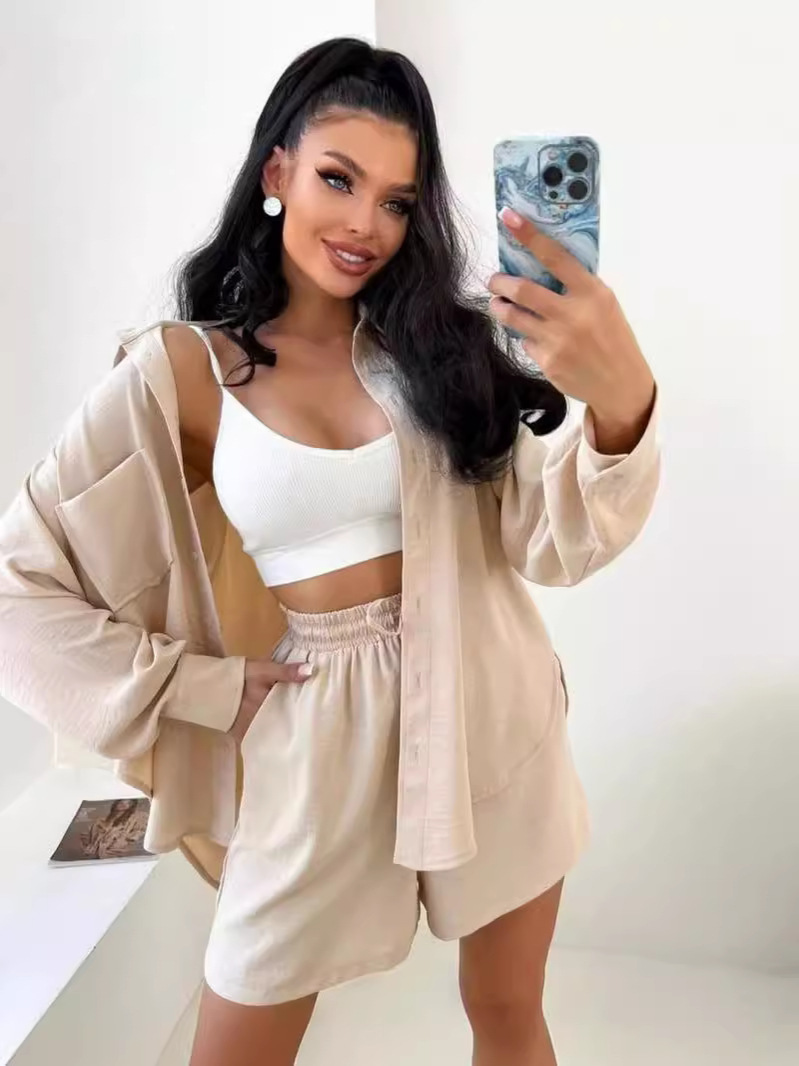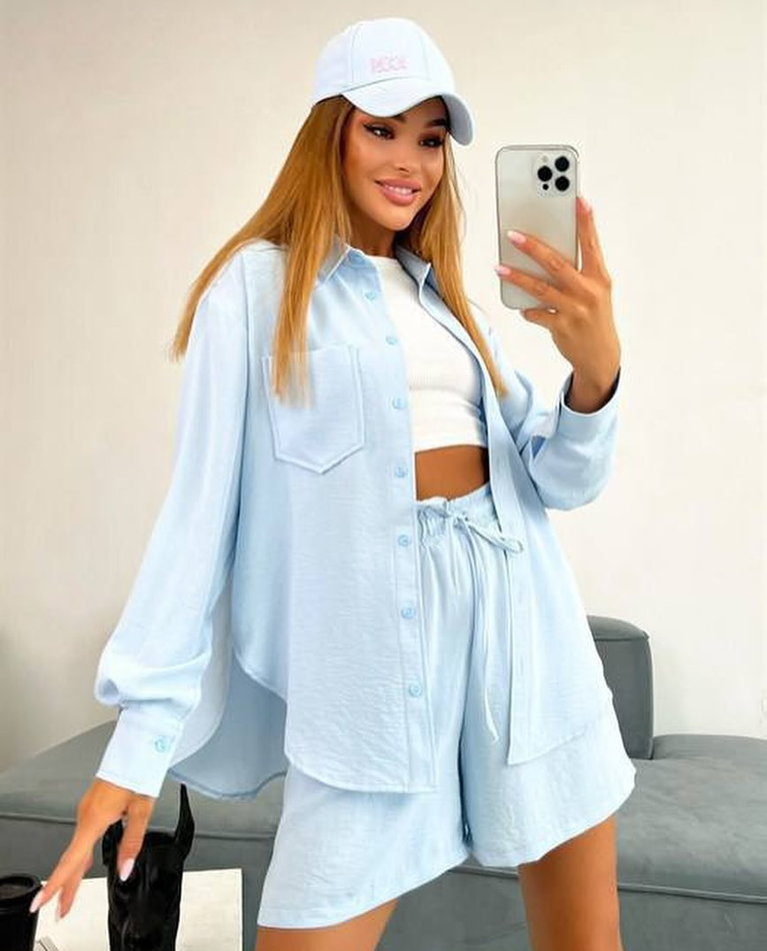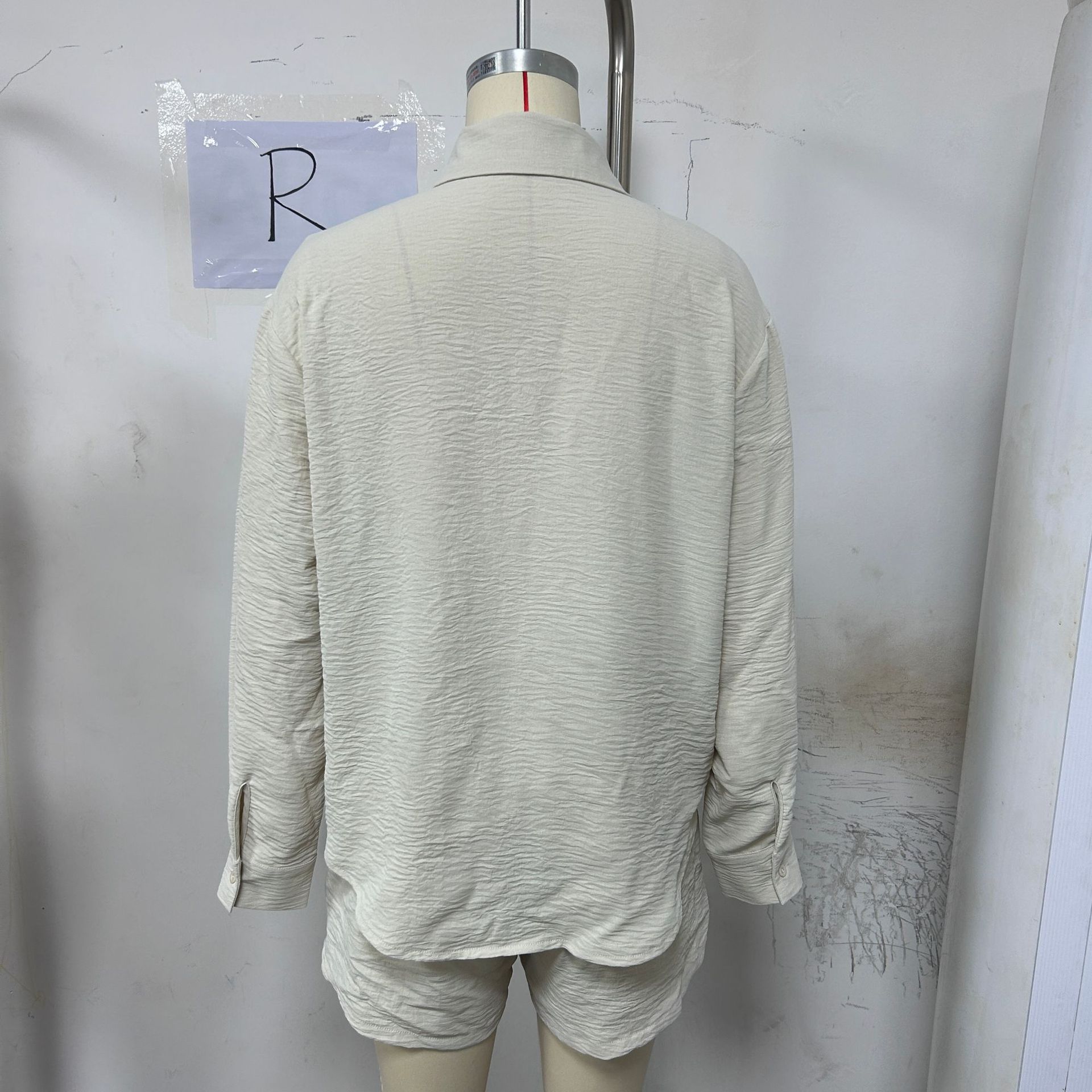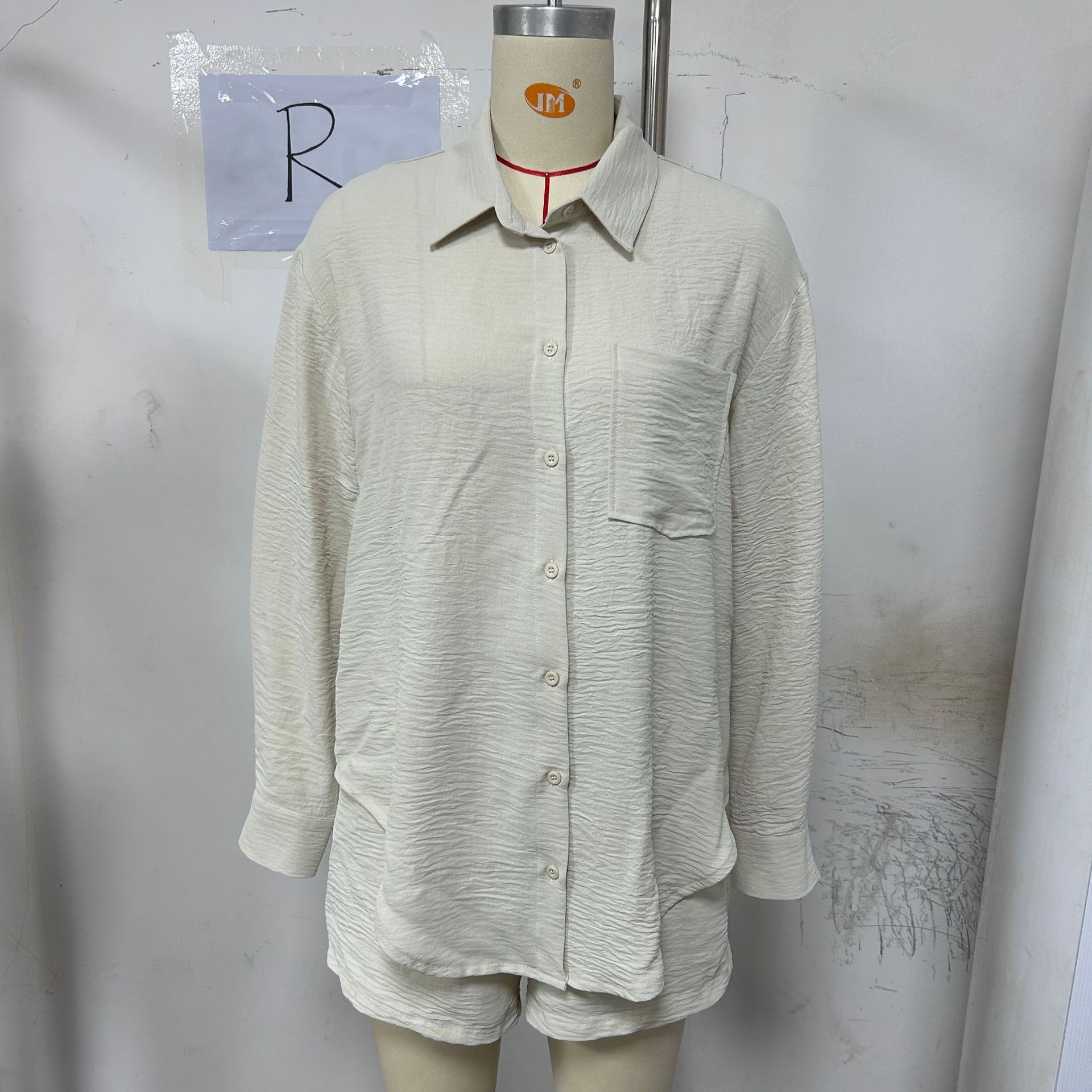 2024 아마존 국경 유럽 및 미국 여성의 단색 단일 가슴 긴 소매 셔츠 느슨한 패션 캐주얼 반바지 세트