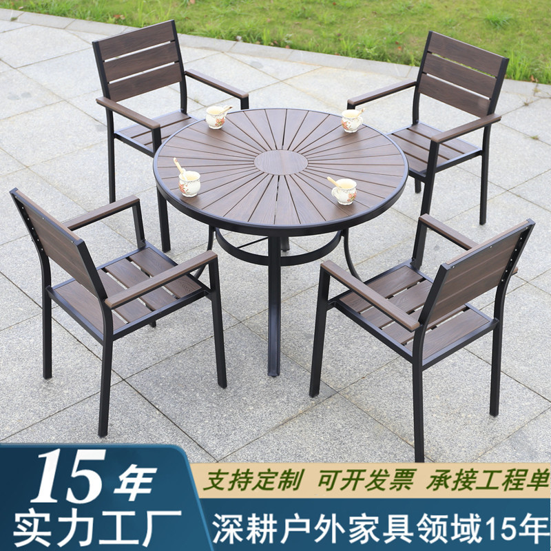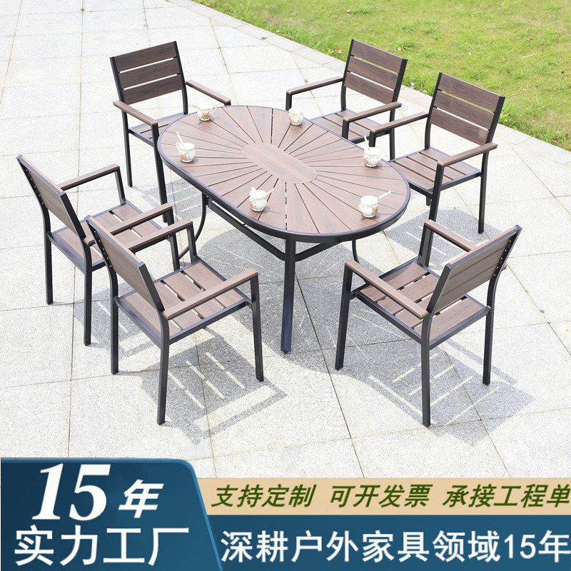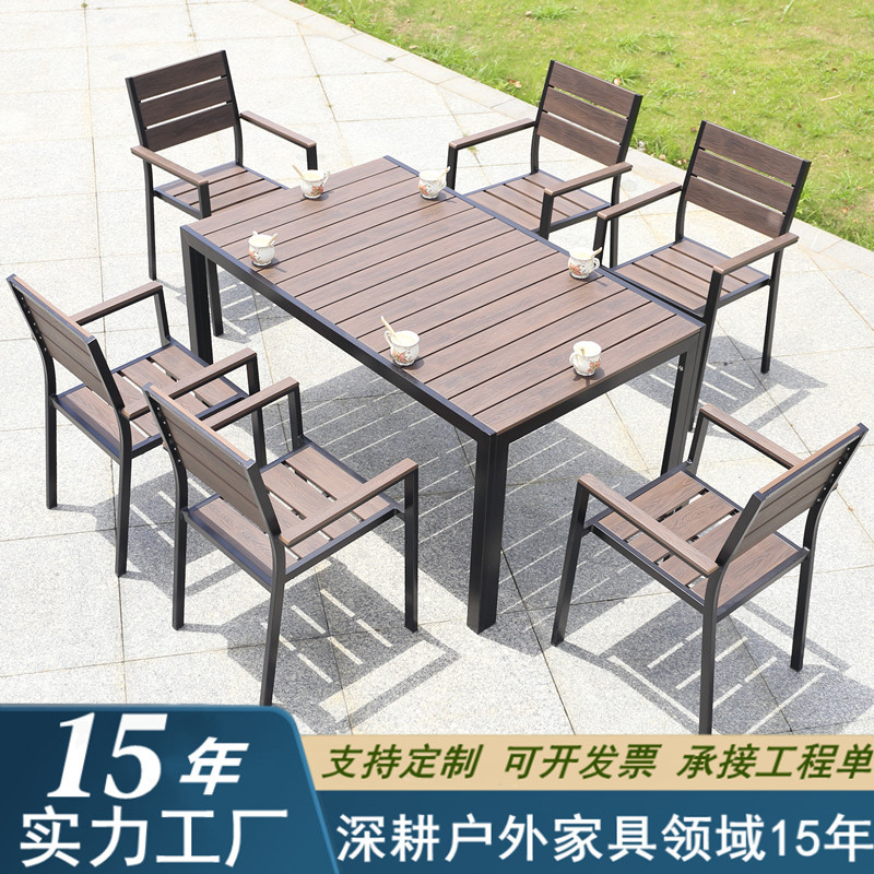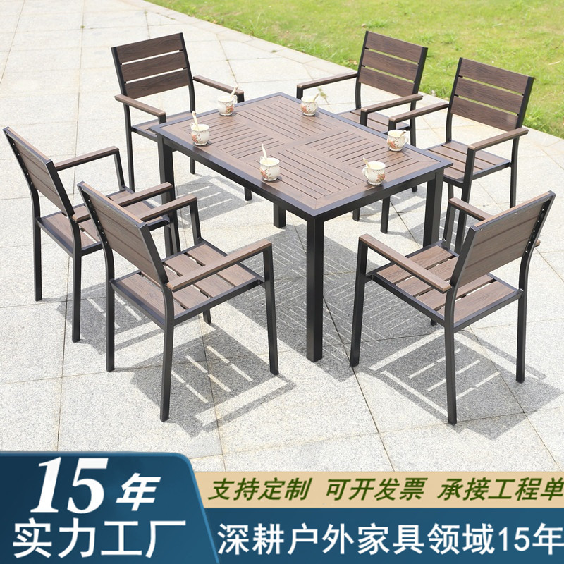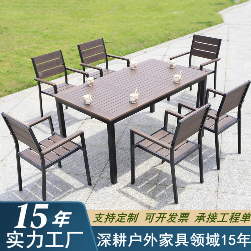 부식 방지 플라스틱 나무 테이블 및 의자 현대 간단한 야외 안뜰 야외 발코니 빌라 테이블 호텔 다이닝 테이블 레저