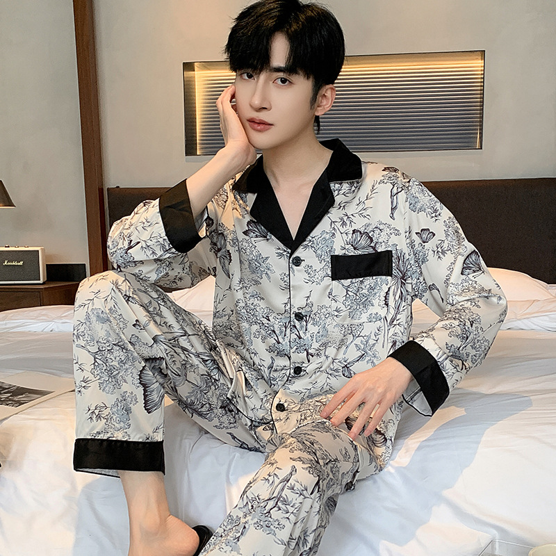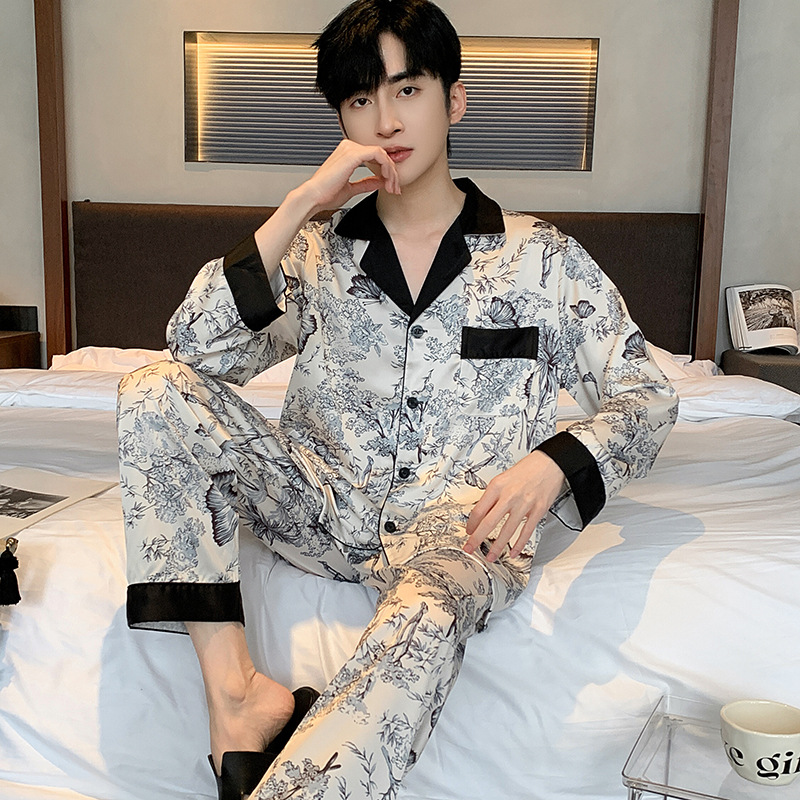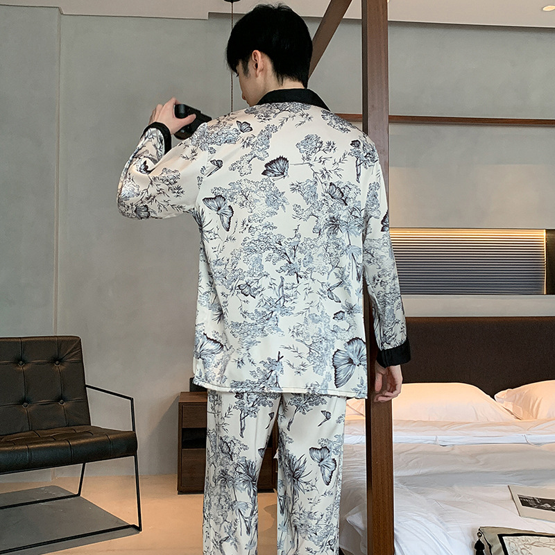 새로운 중국 스타일 국가 스타일 새틴 남성 잠옷 봄과 가을 긴 소매 아이스 실크 하이 엔드 스타일 의상