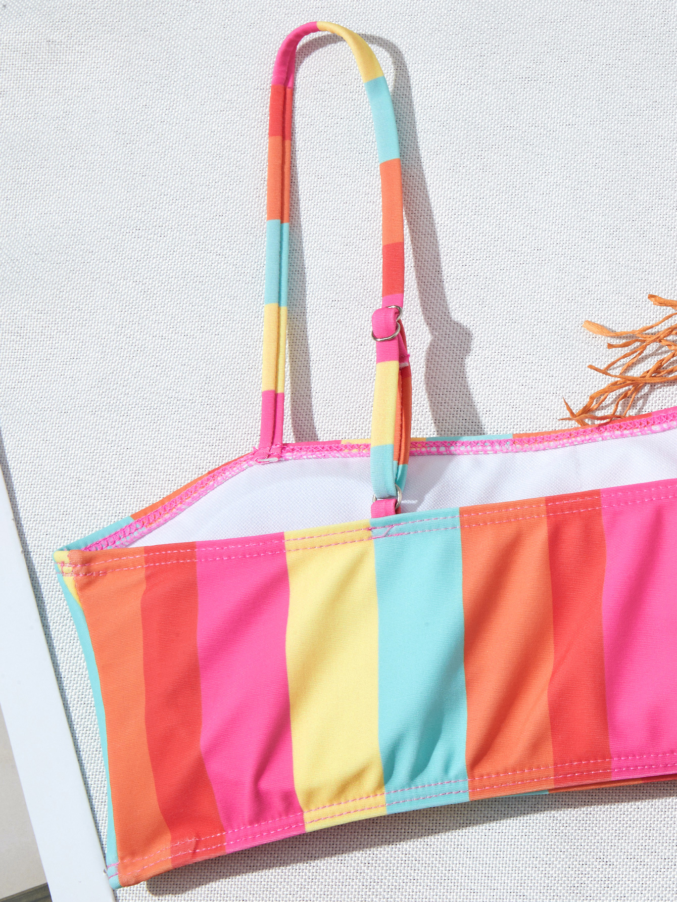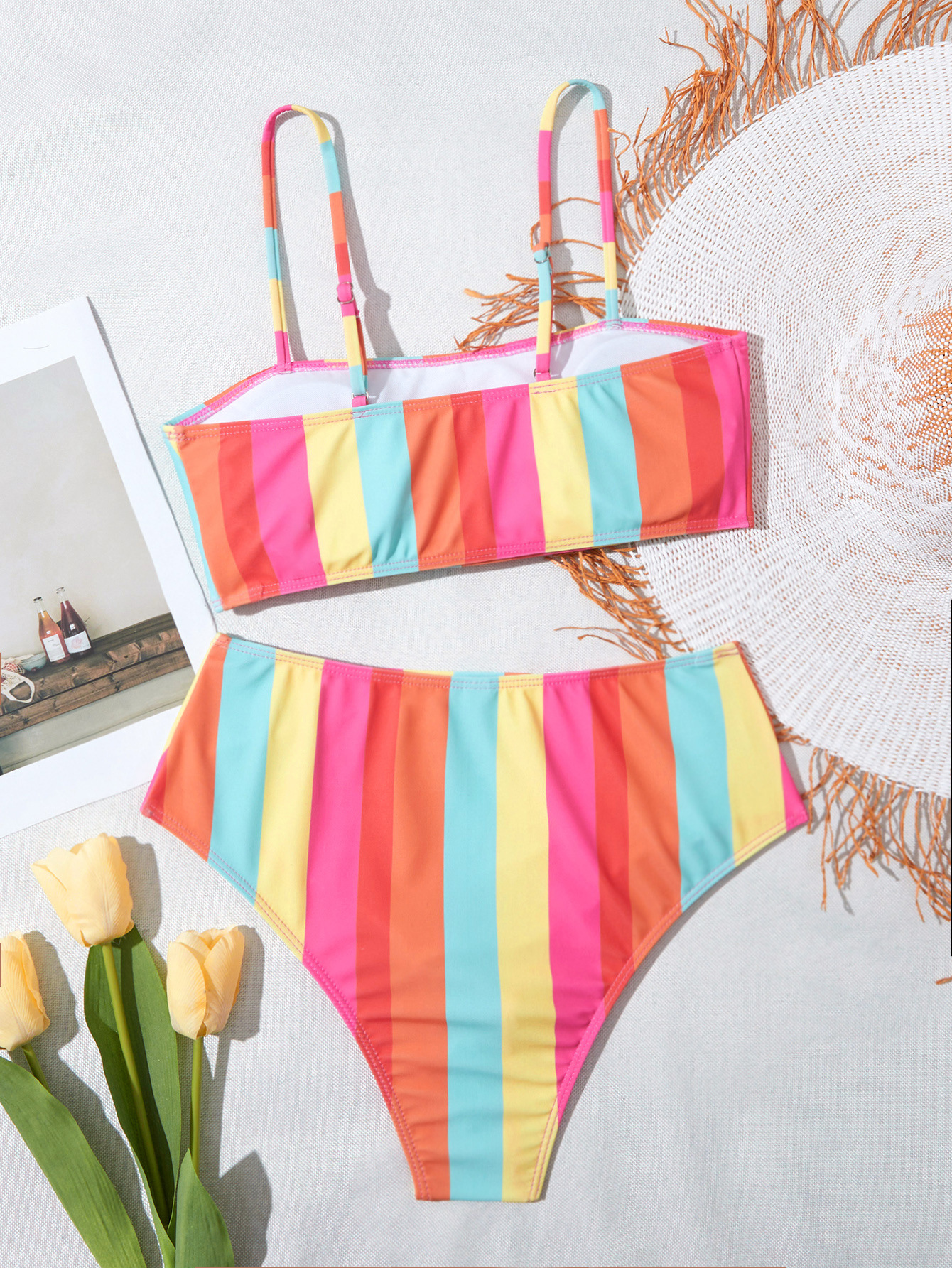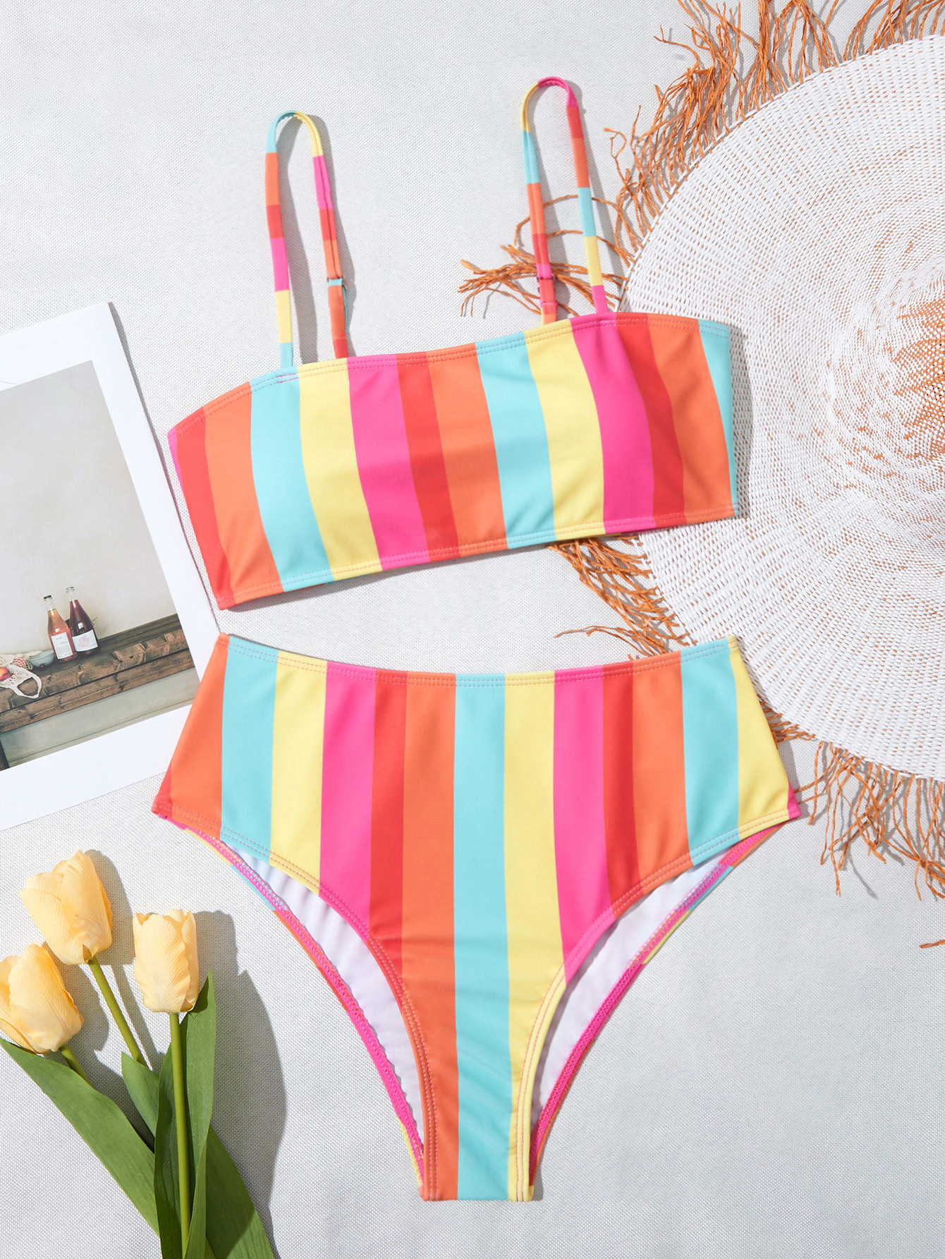 2024 새로운 유럽과 미국의 국경 간 대외 무역 스트라이프 인쇄 스트랩리스 얇은 어깨 스트랩 높은 허리 분할 수영복 비키니 여성