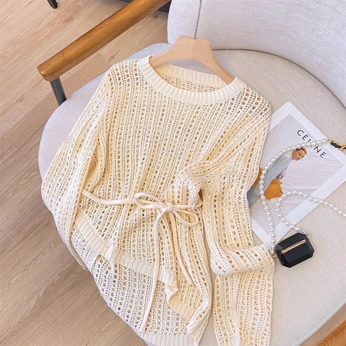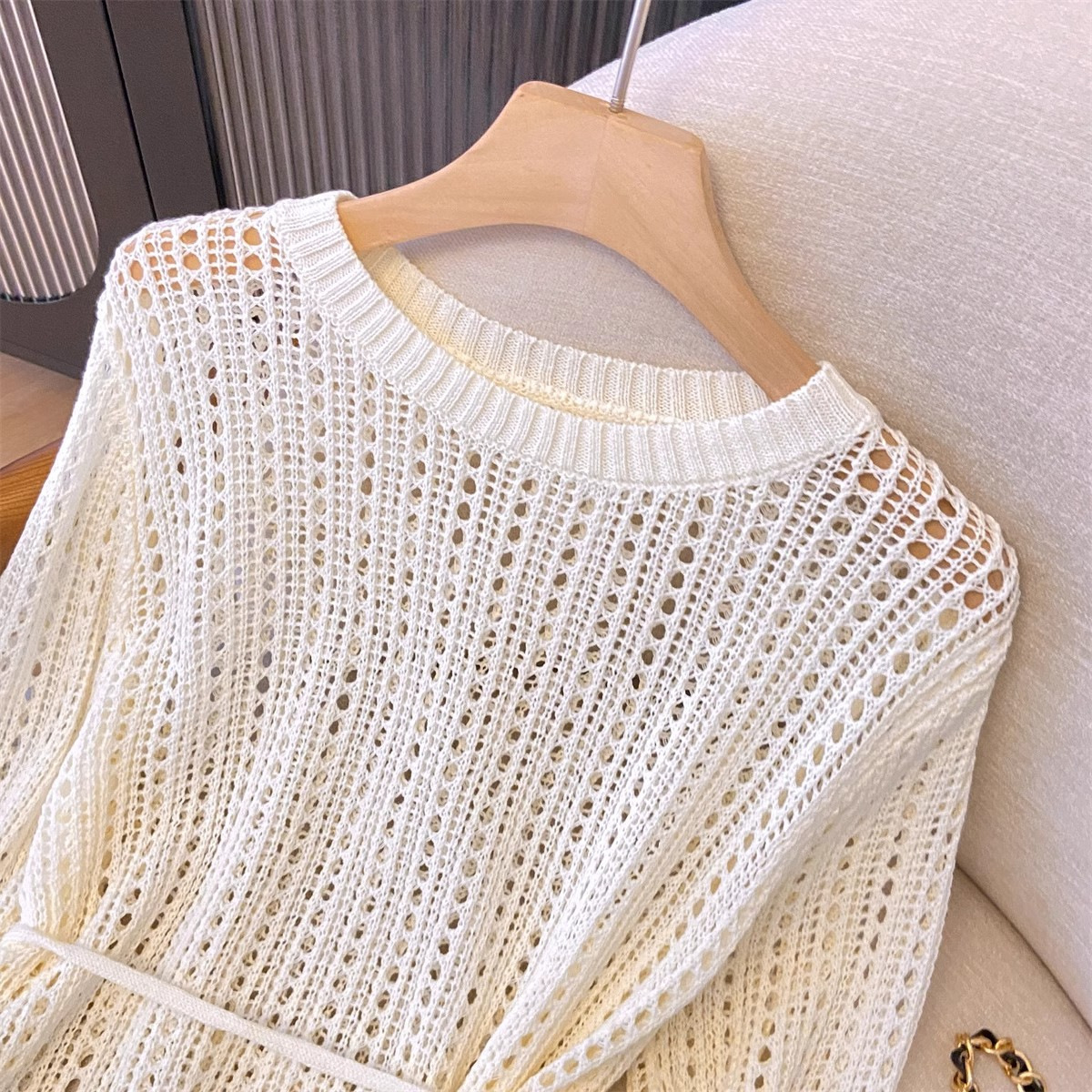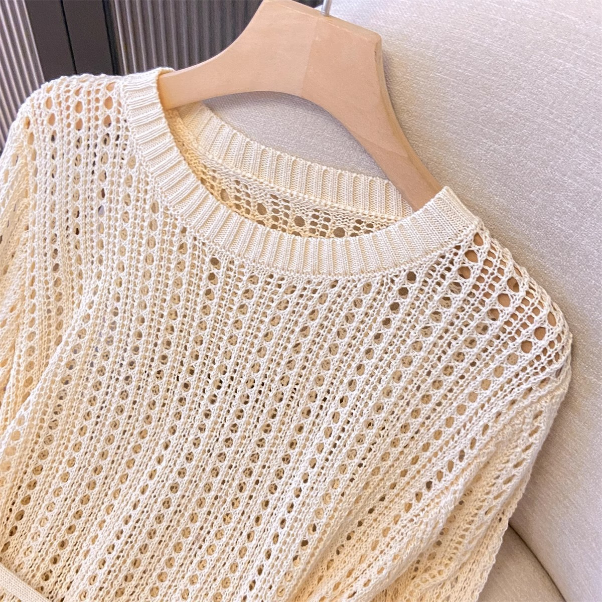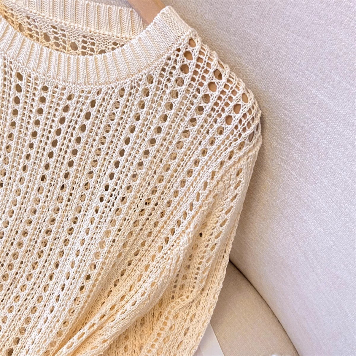 불규칙한 크로 셰 뜨개질 빈 아이스 실크 니트 블라우스 롱 티셔츠 여성용 여름 게으른 에어컨 아우터 라운드 넥 탑스토어 가기