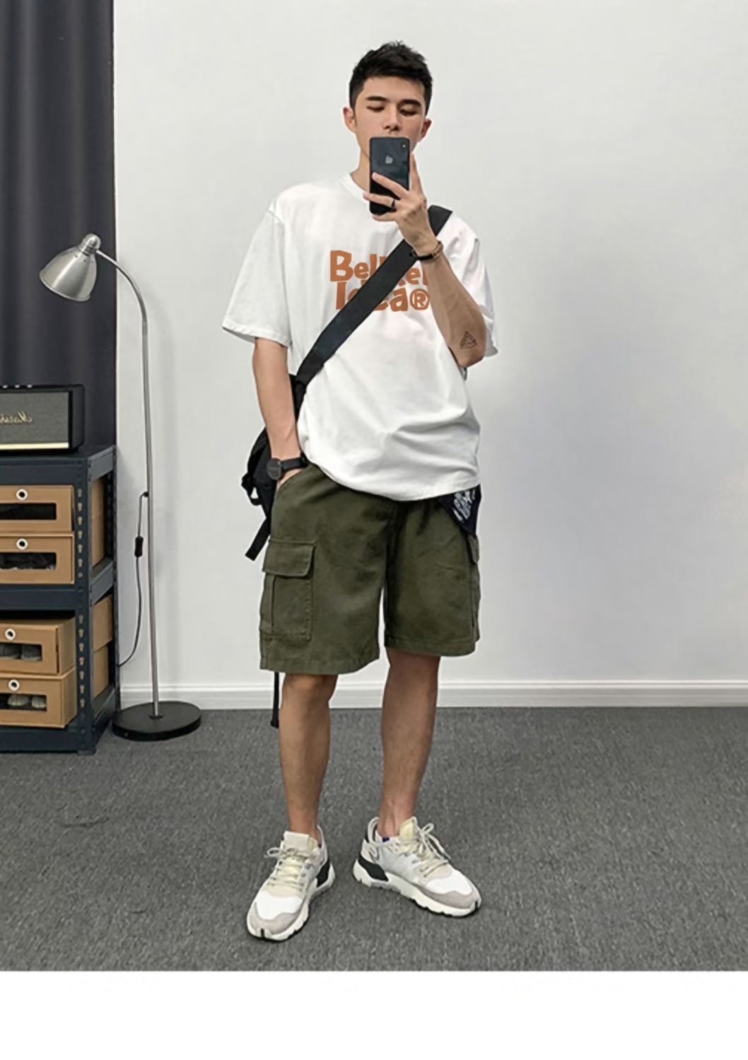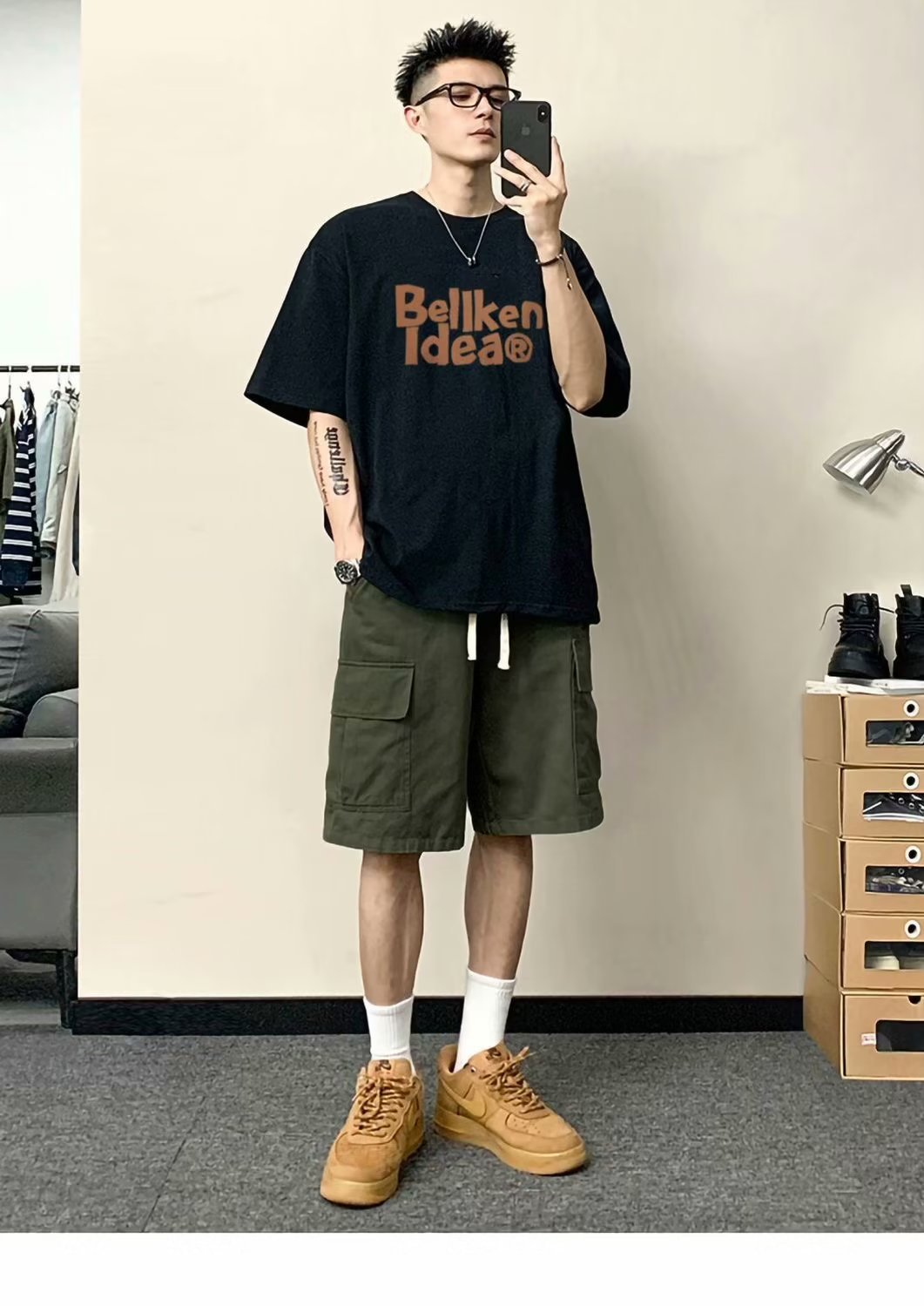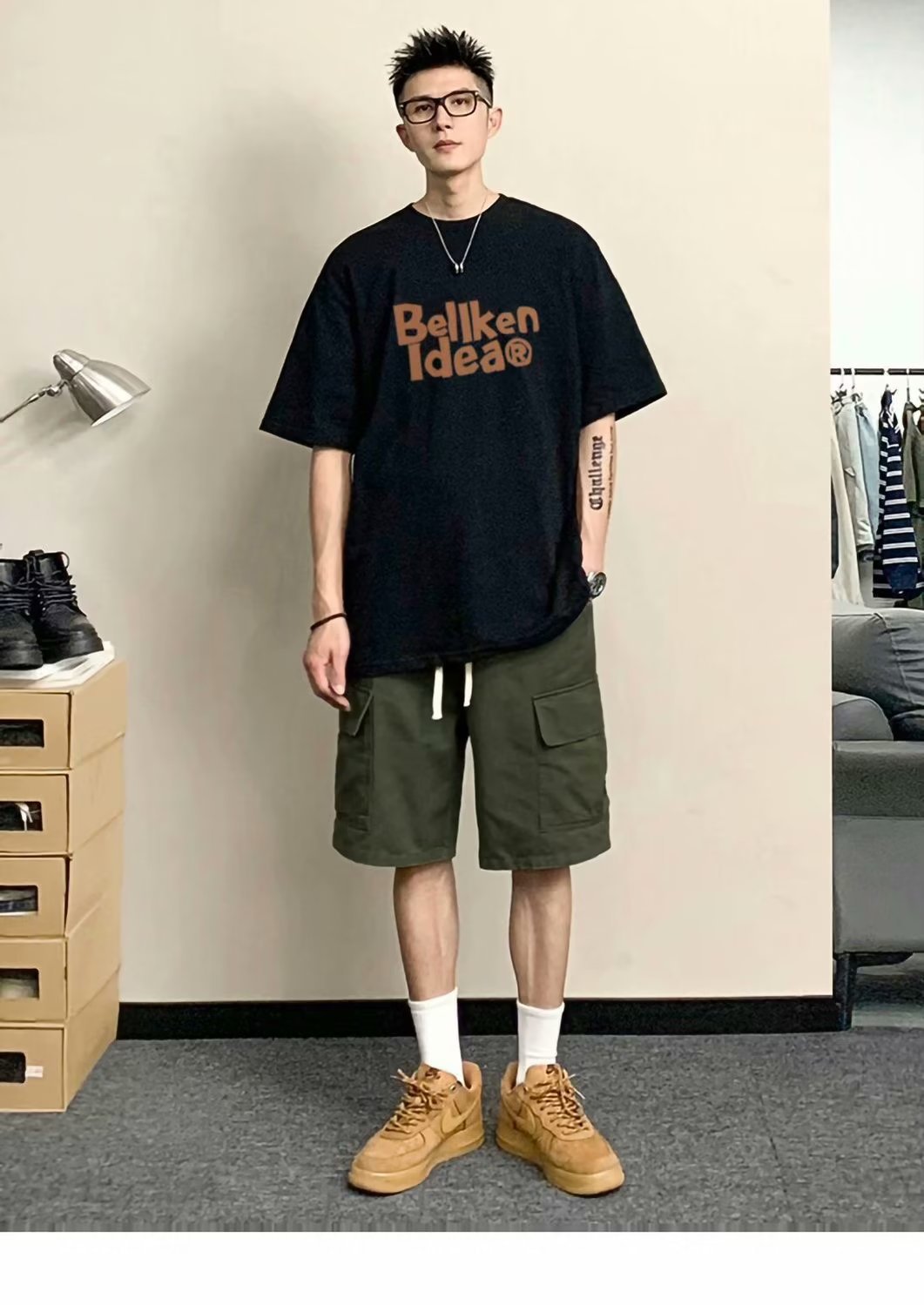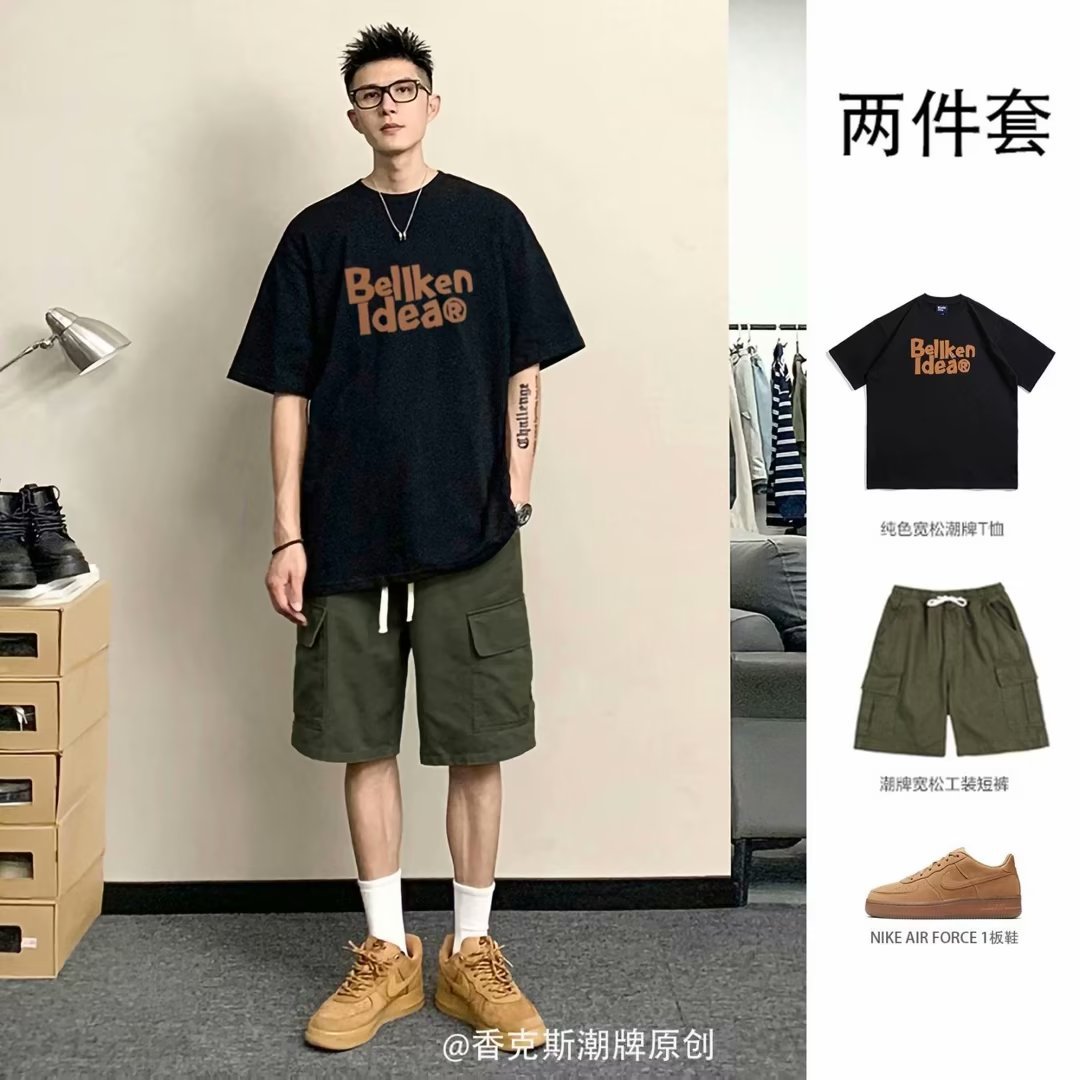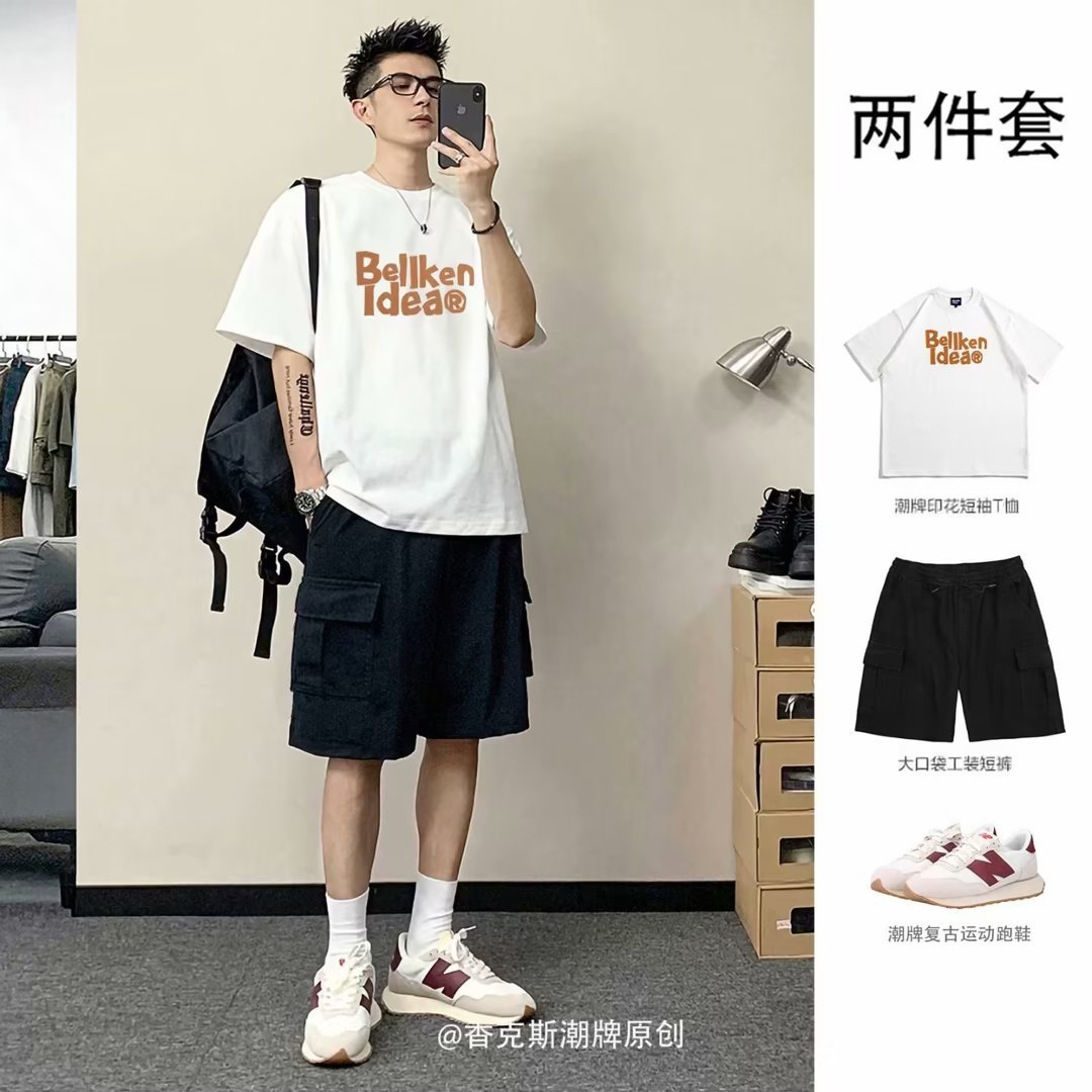 남자 반소매 티셔츠 여름 2023 새로운 도착 헤비 티셔츠 보이즈 루즈 트렌디 브랜드 반소매 투피스 세트