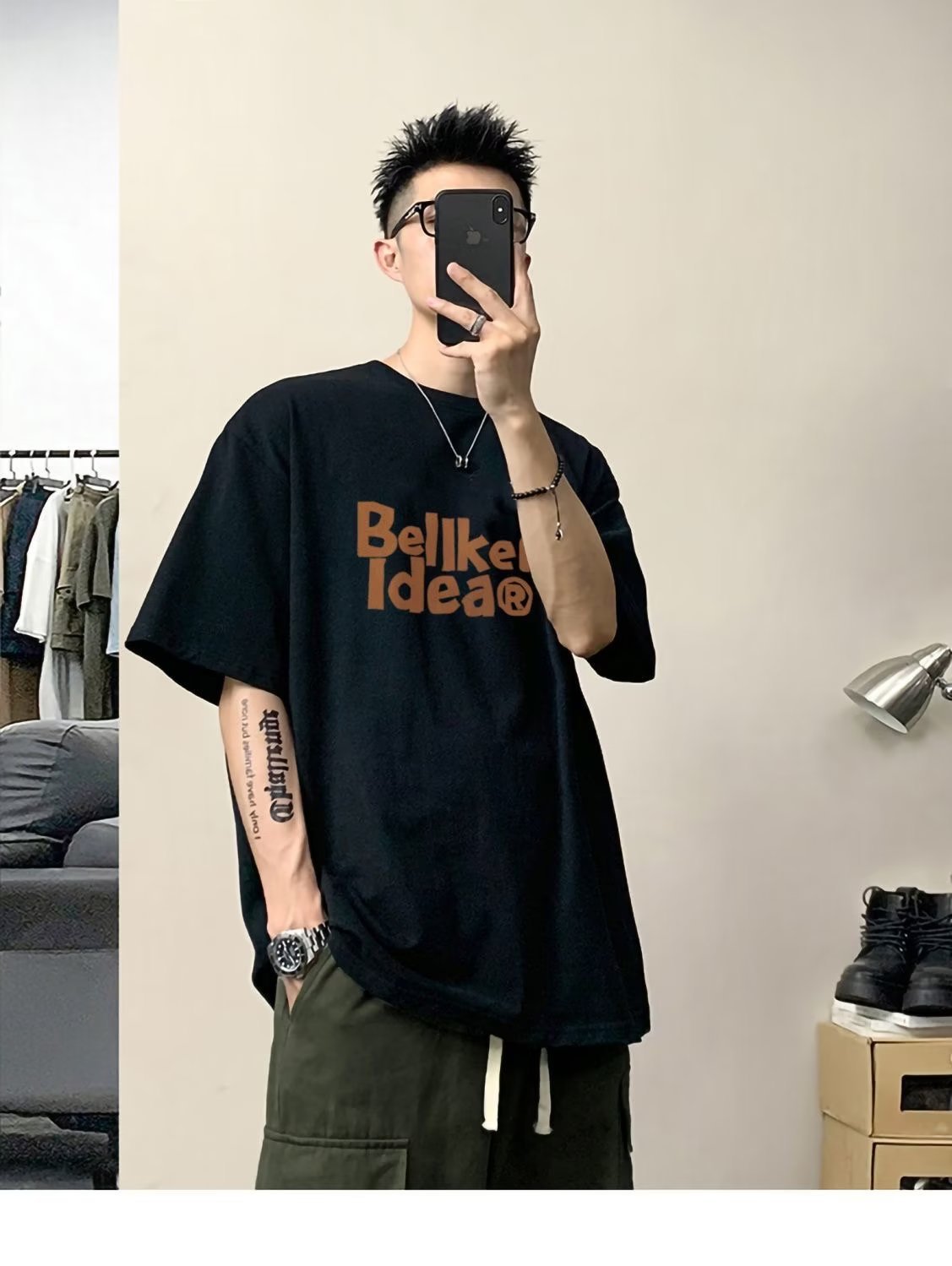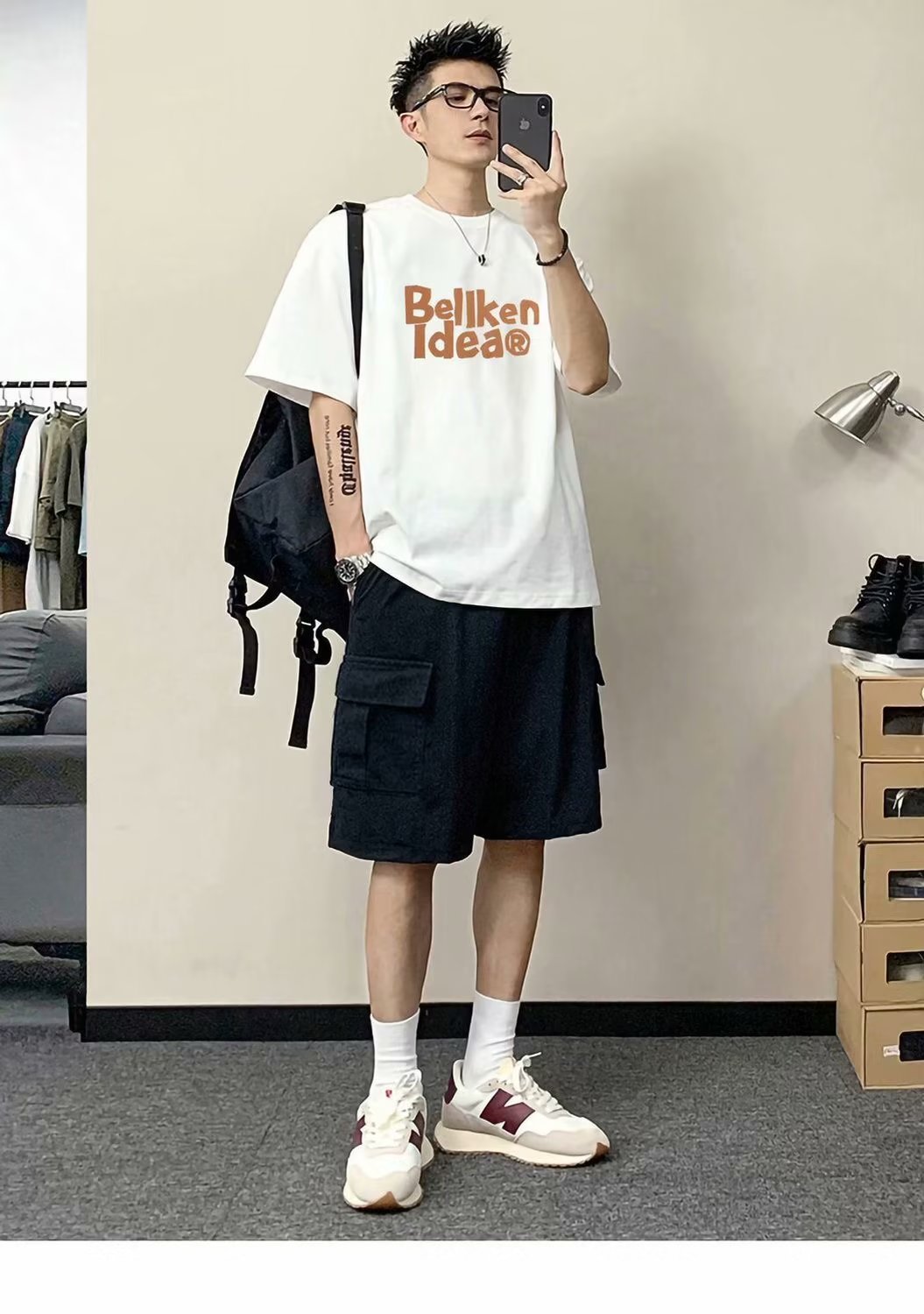 남자 반소매 티셔츠 여름 2023 새로운 도착 헤비 티셔츠 보이즈 루즈 트렌디 브랜드 반소매 투피스 세트스토어 가기