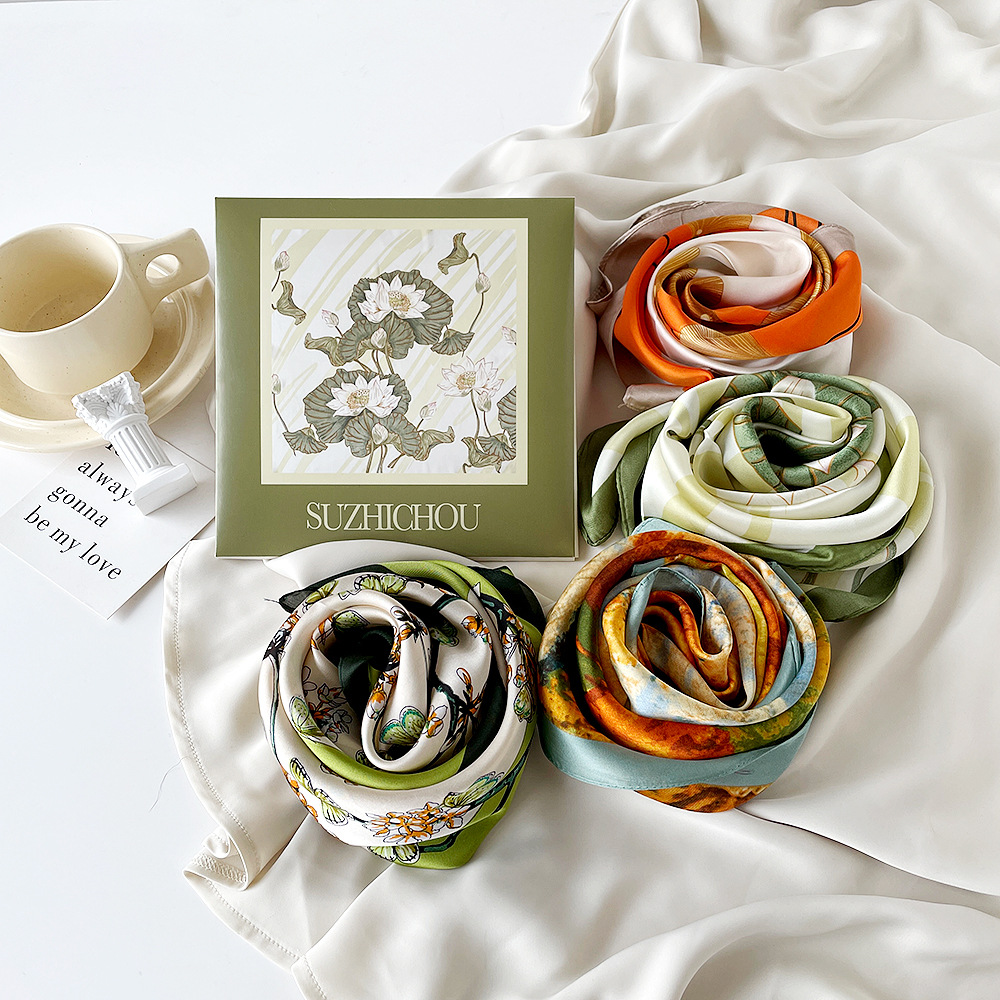 스지 실크 선물 상자 작은 실크 스카프 여성 사랑 말 오렌지 새로운 스타일 모방 실크 스퀘어 스카프 패션 스카프 고급 스카프 세트