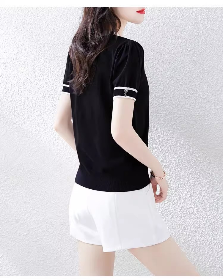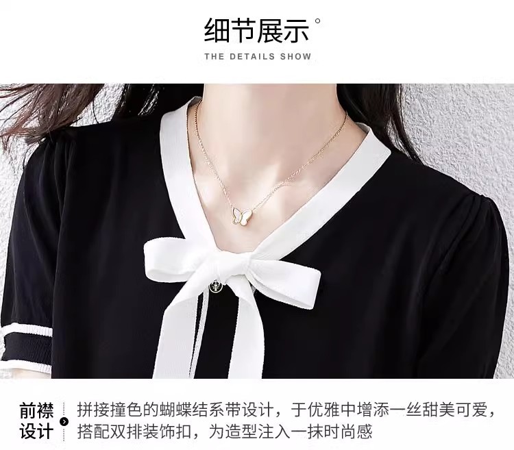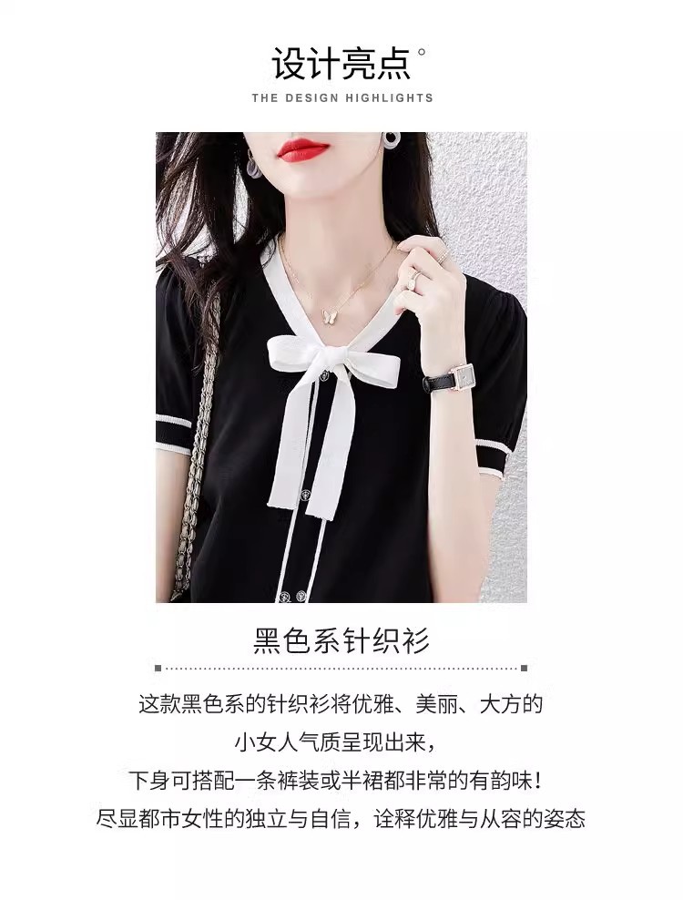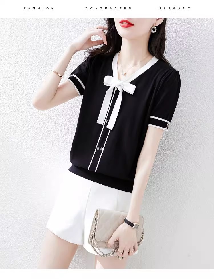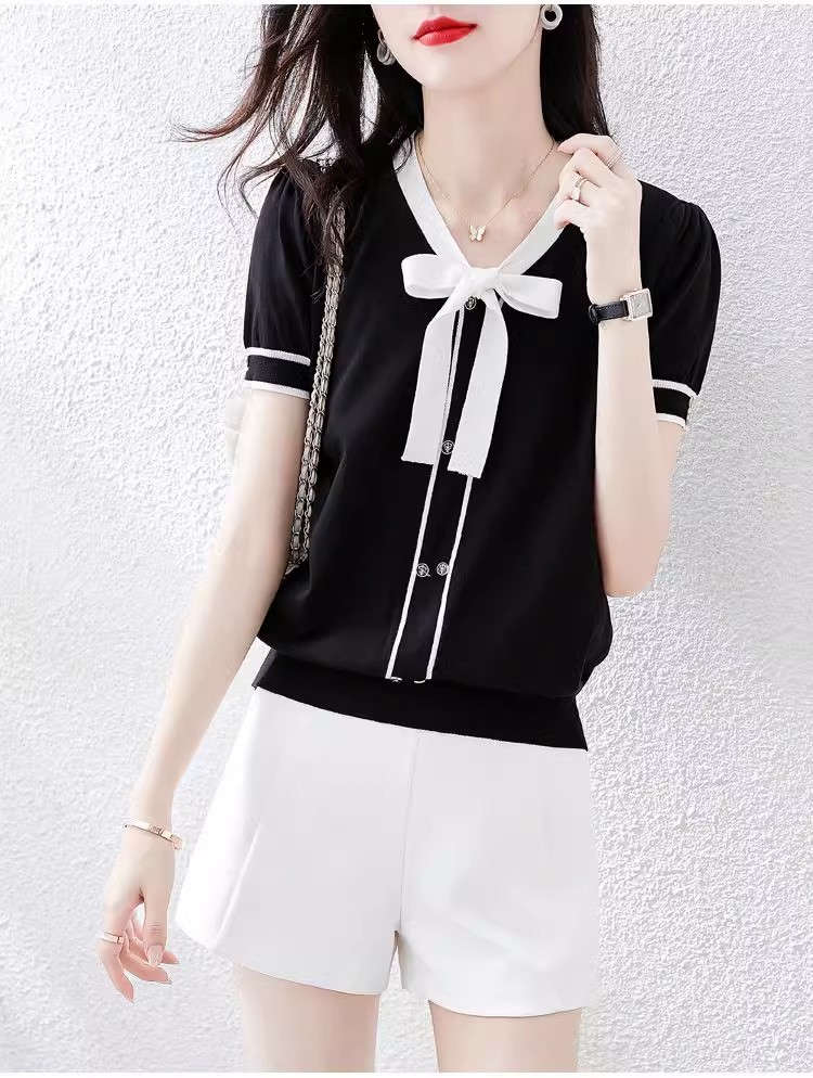 2026년 신상 여름 아이스 실크 반팔 티셔츠 여성용 슬림핏 패셔너블 리본 네이비 칼라 니트 다용도 탑 트렌디스토어 가기