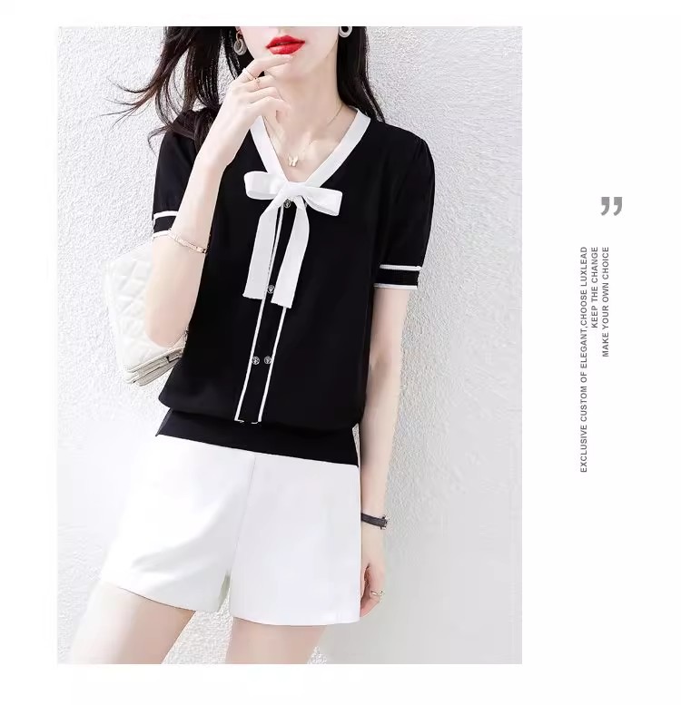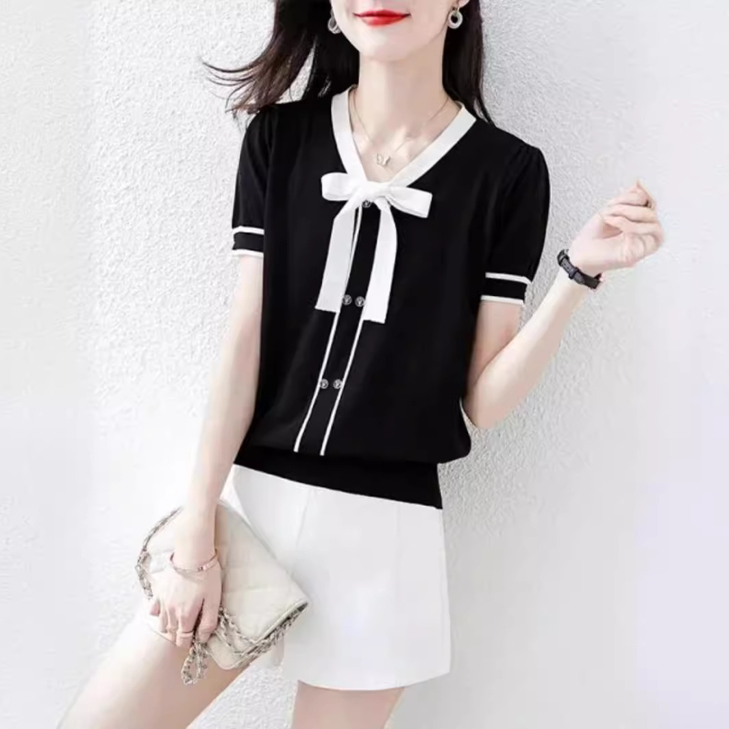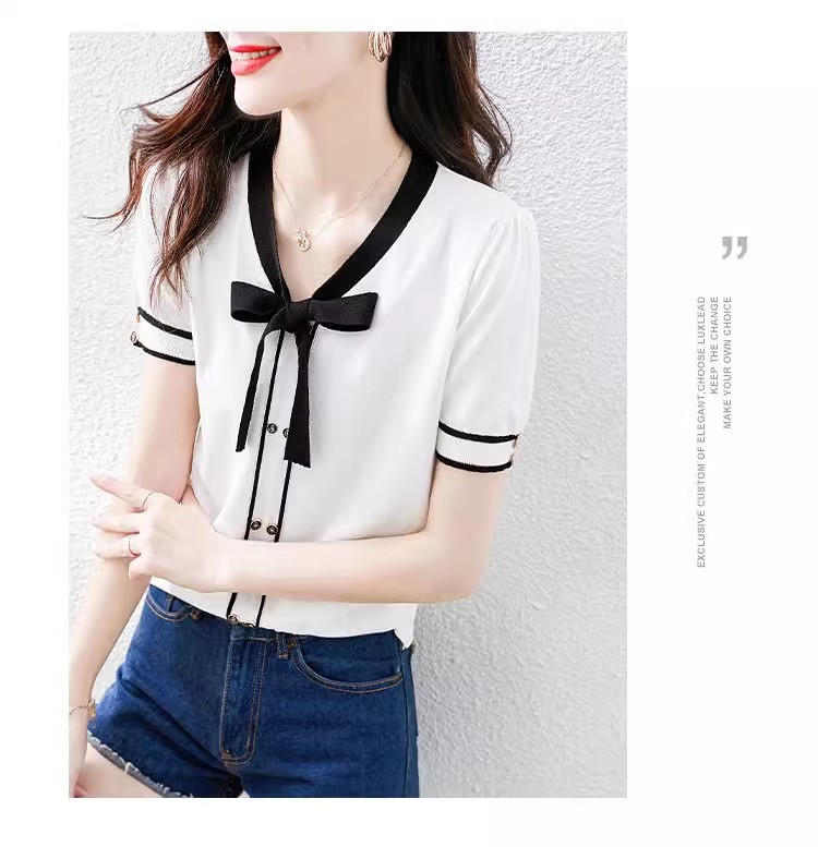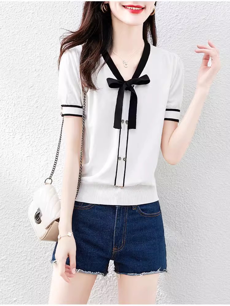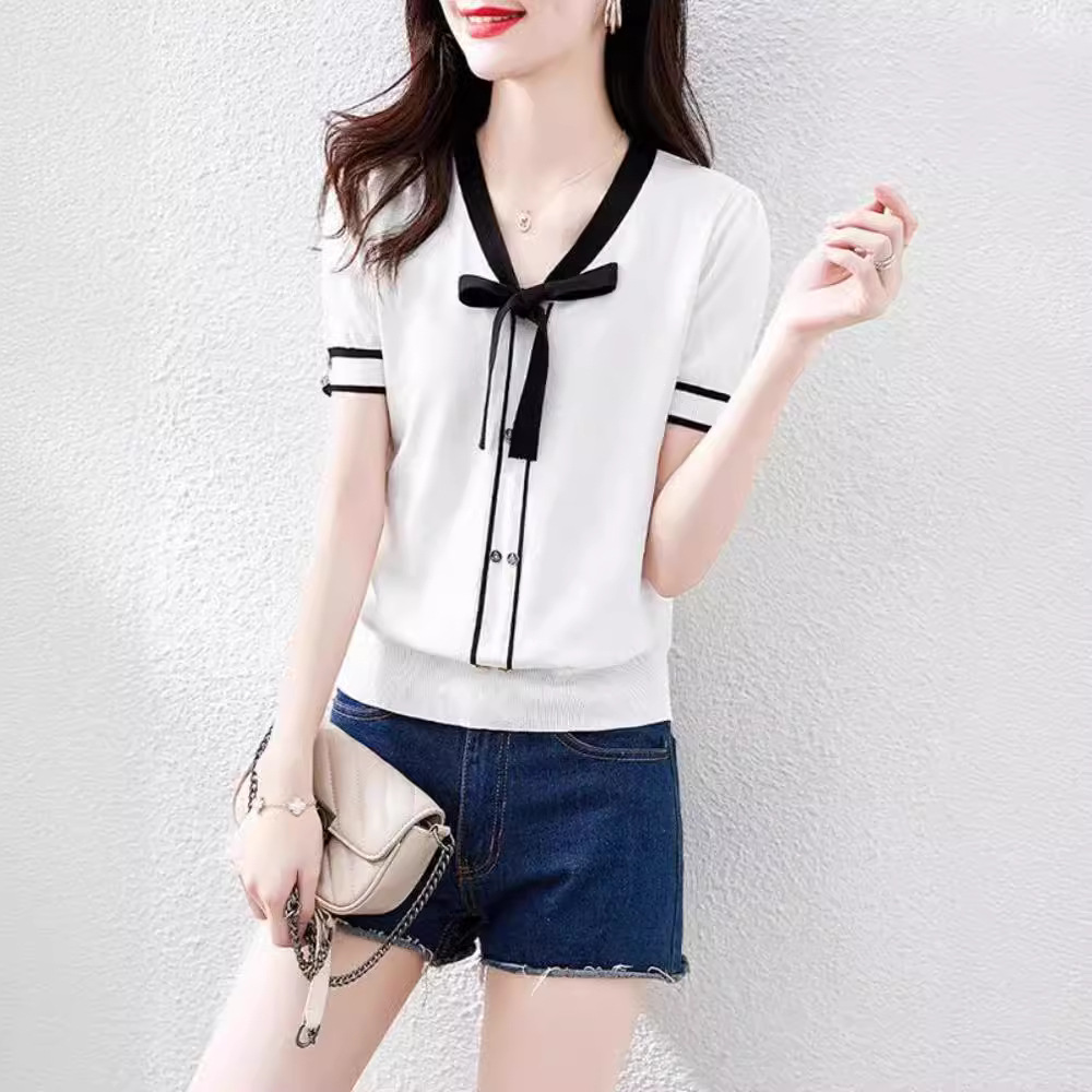 2026년 신상 여름 아이스 실크 반팔 티셔츠 여성용 슬림핏 패셔너블 리본 네이비 칼라 니트 다용도 탑 트렌디