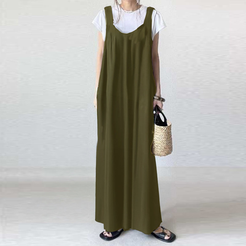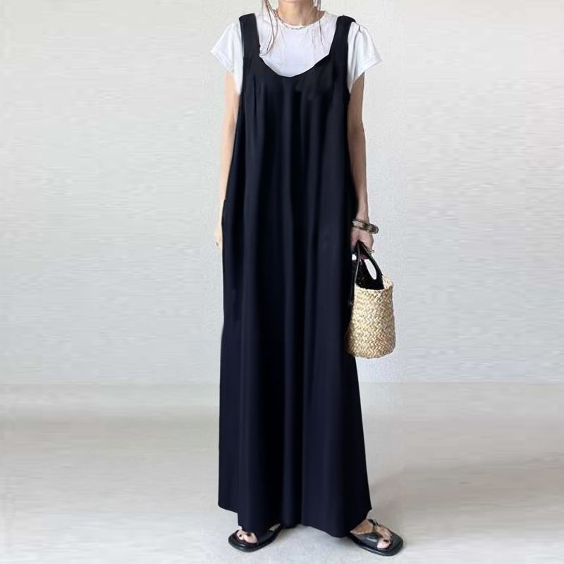 2가지 색상 재고 있음, 크로스보더 와이드 스트랩 원피스, 여름 일본 스타일 루즈핏 캐주얼 만능 V넥 롱 A라인 원피스