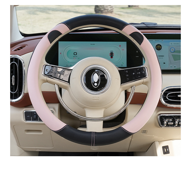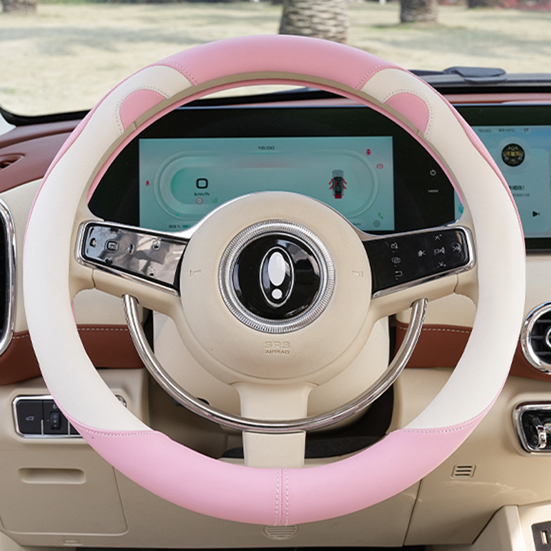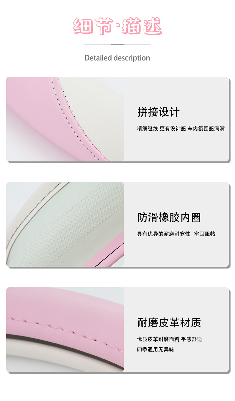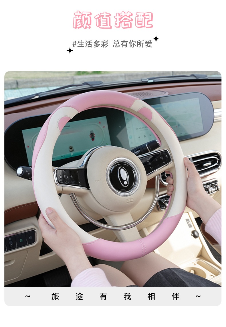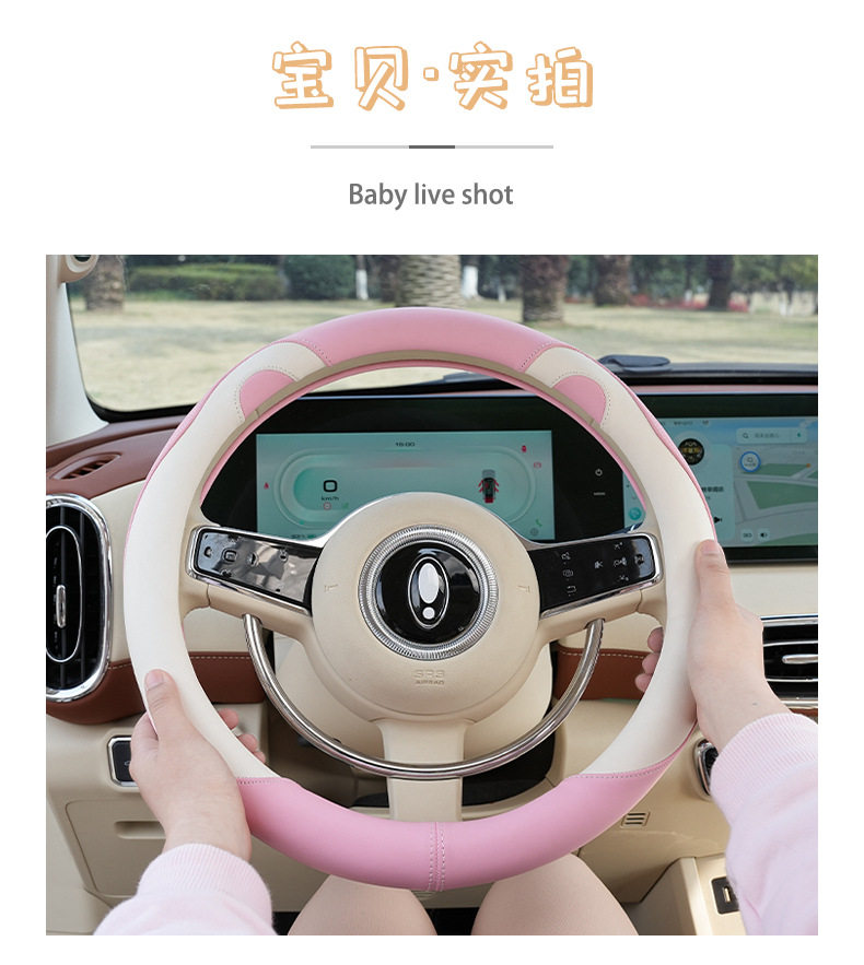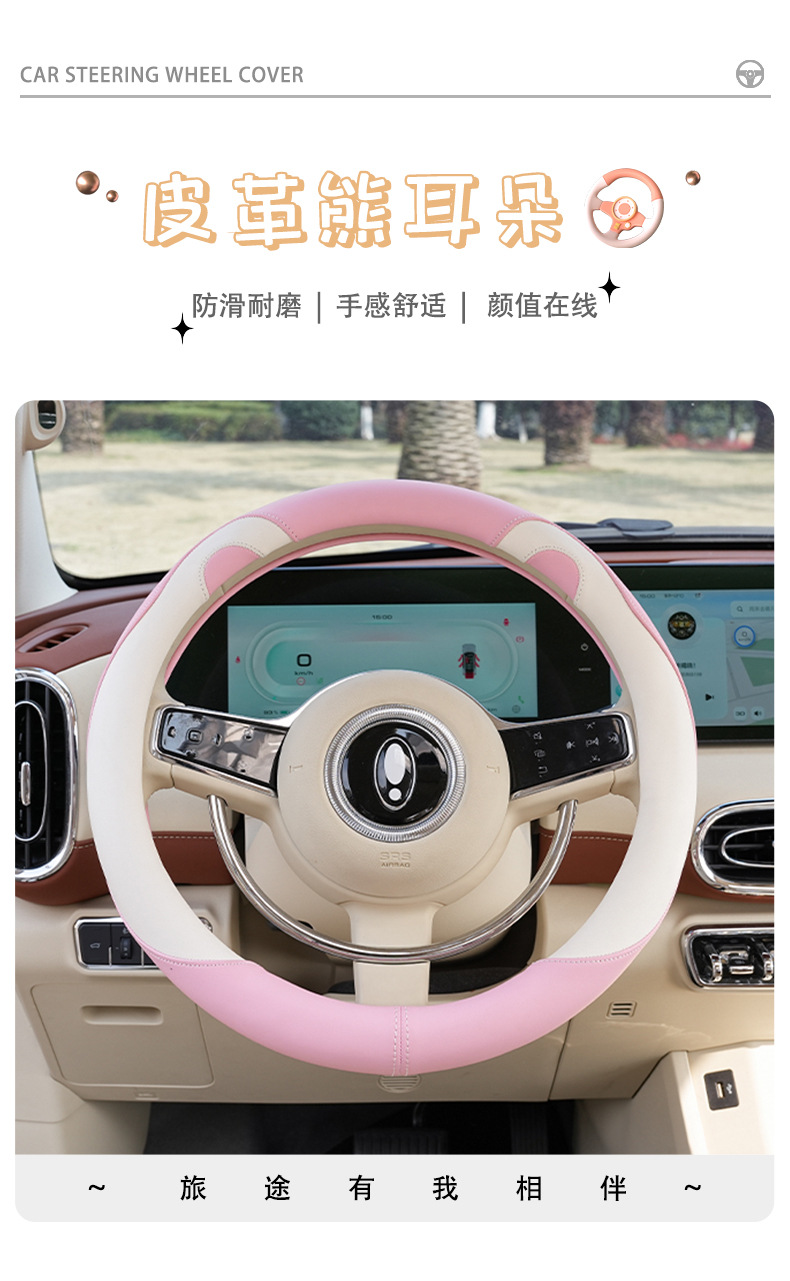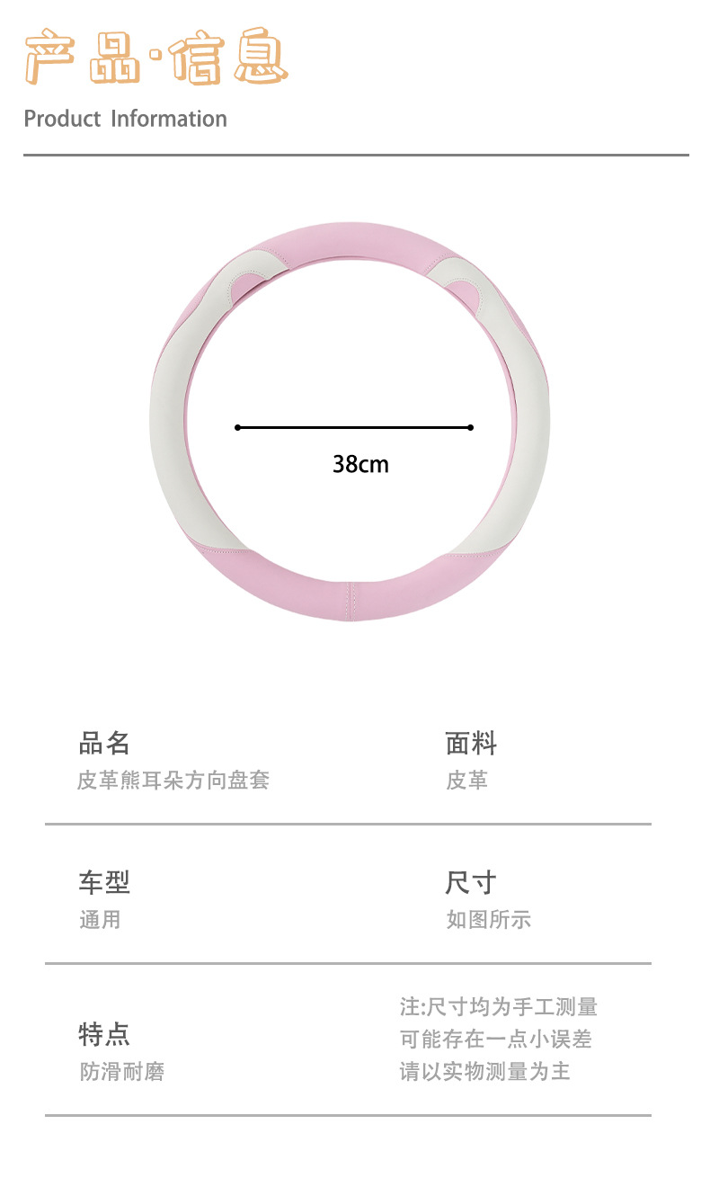 • 가죽 곰 작은 귀 스티어링 휠 커버-핑크 화이트