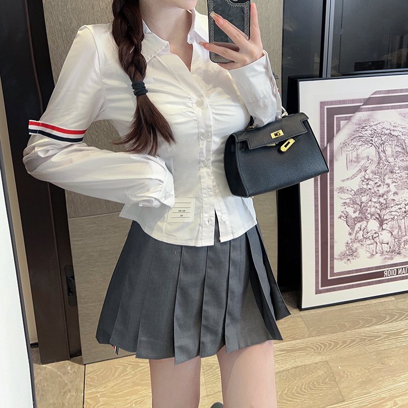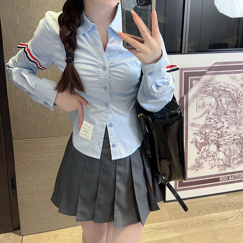 고급 유럽풍 봄여름 더블바 스트라이프 긴팔 셔츠, 학생풍 TB 셔츠, 퓨어 섹시 스타일, 허리라인 강조 여성 셔츠스토어 가기