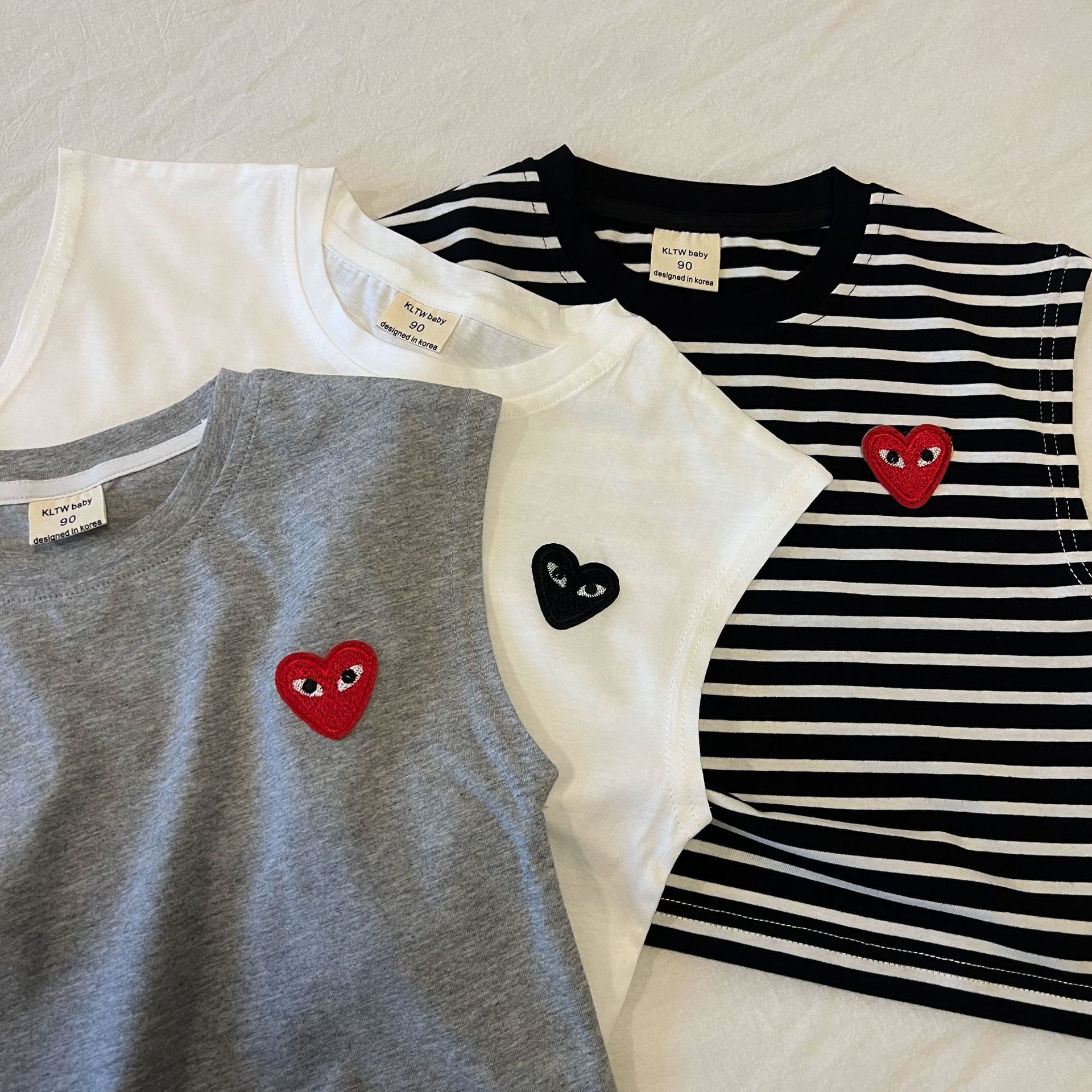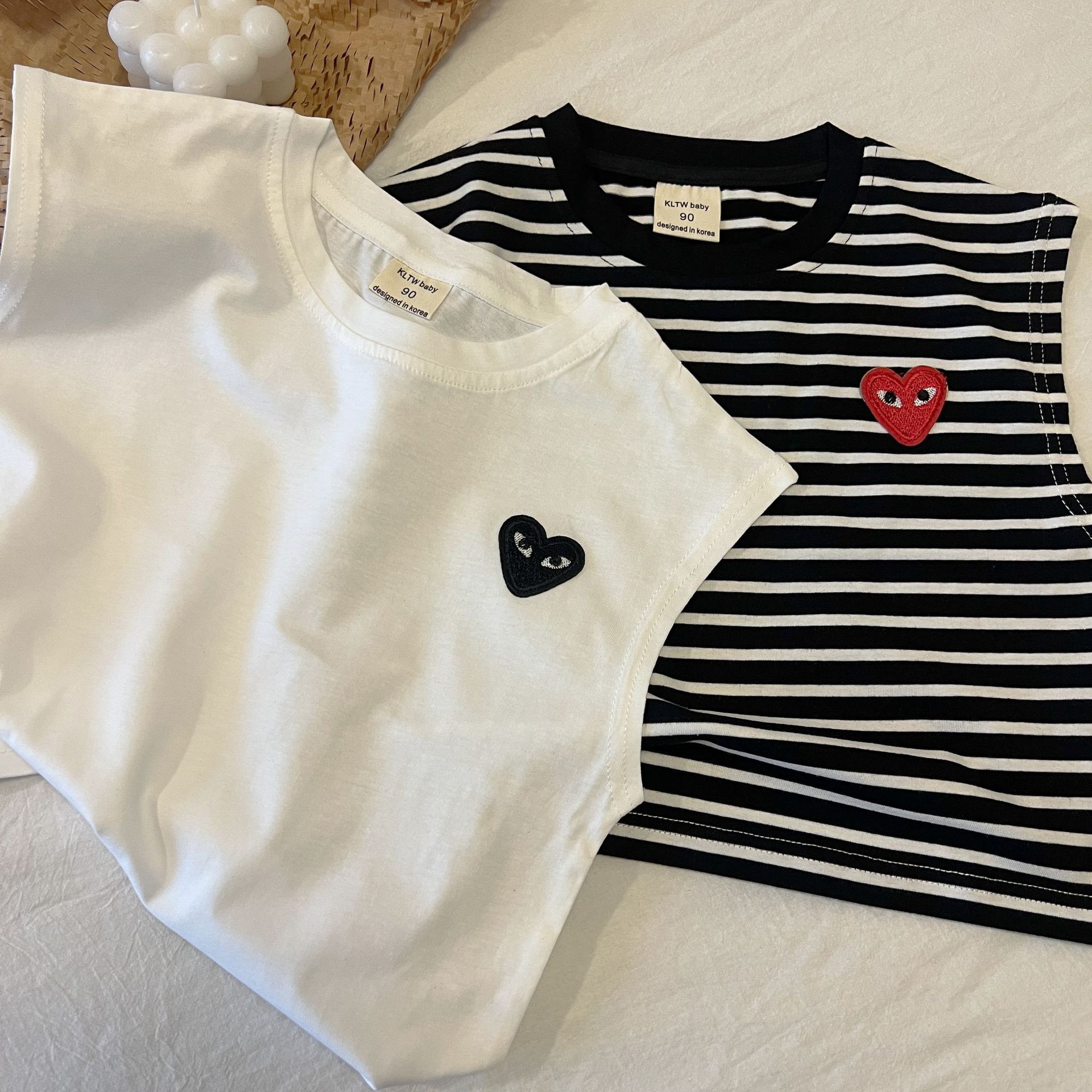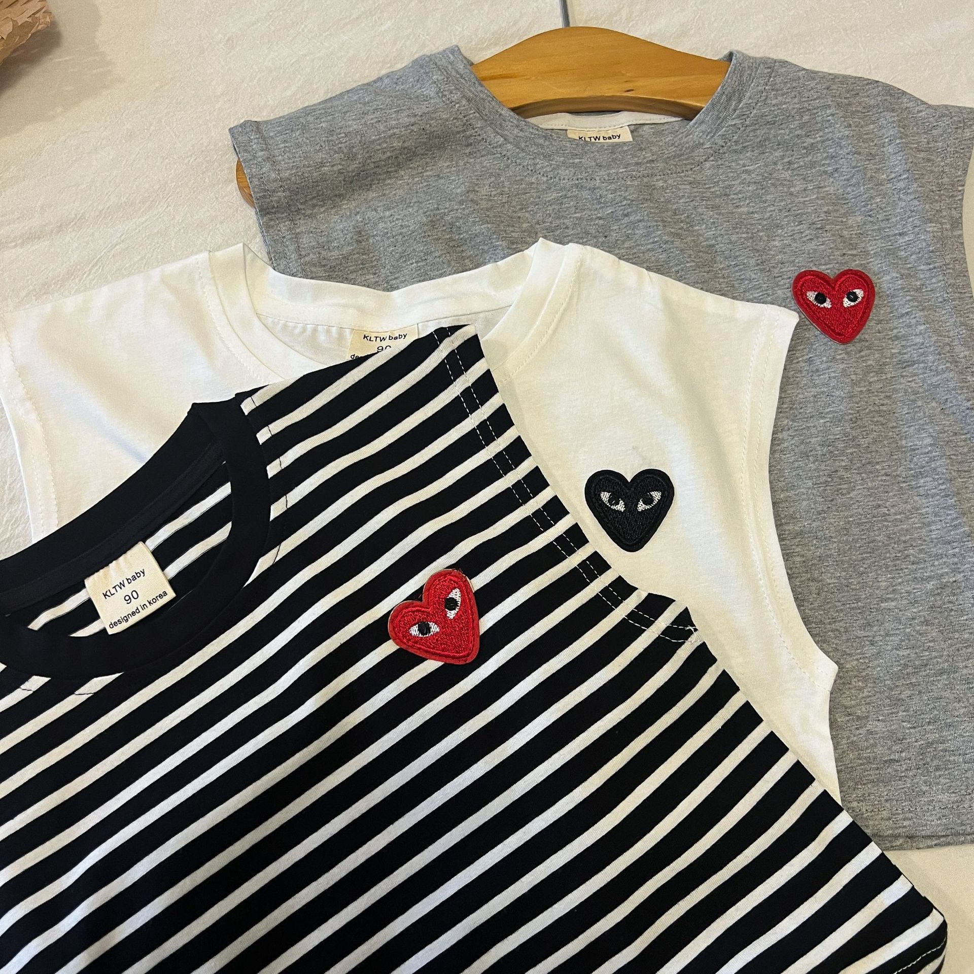 어린이 조끼 2024 여름 새로운 소년과 소녀 사랑 티셔츠 아기 민소매 티셔츠 어린이 줄무늬 최고 단색 라운드