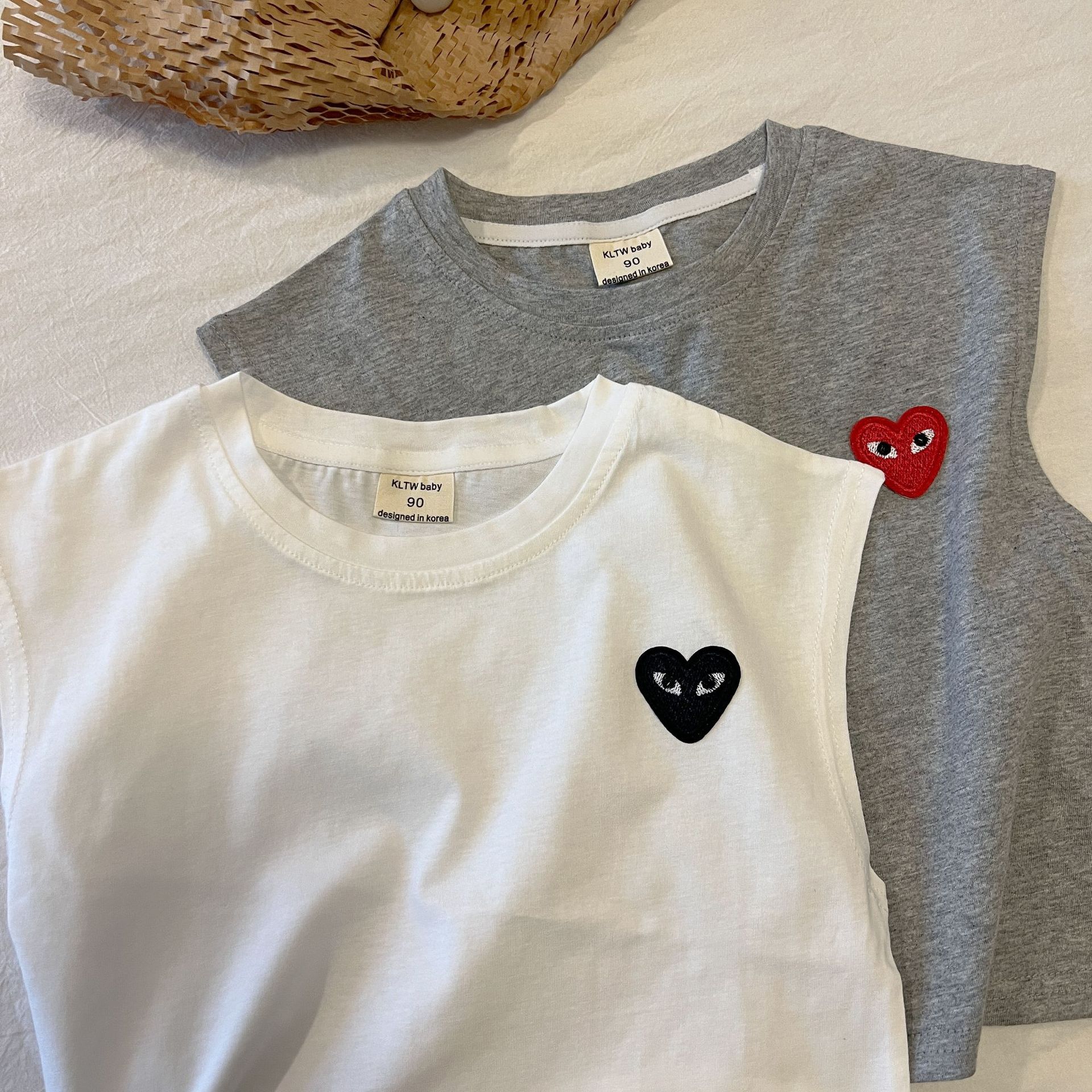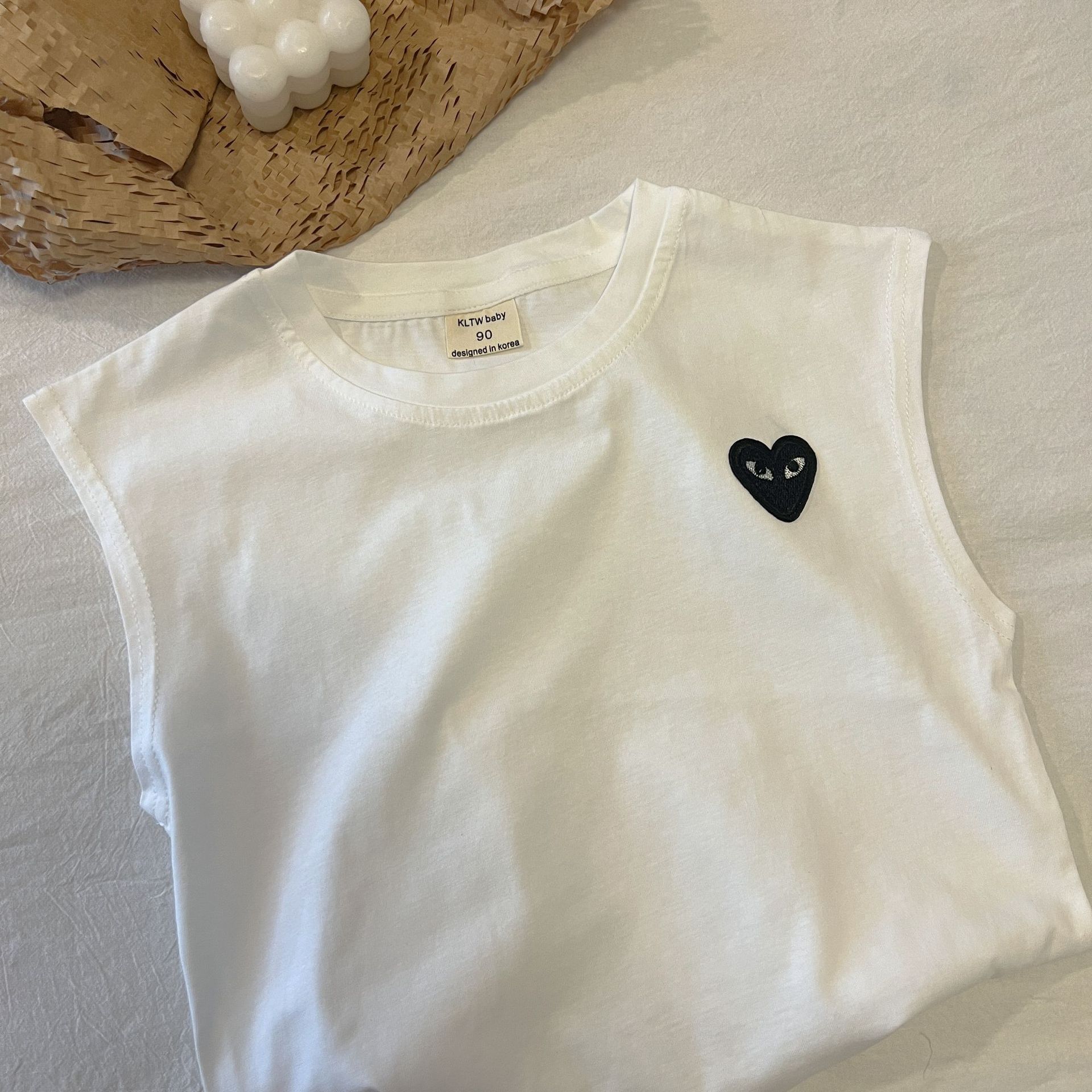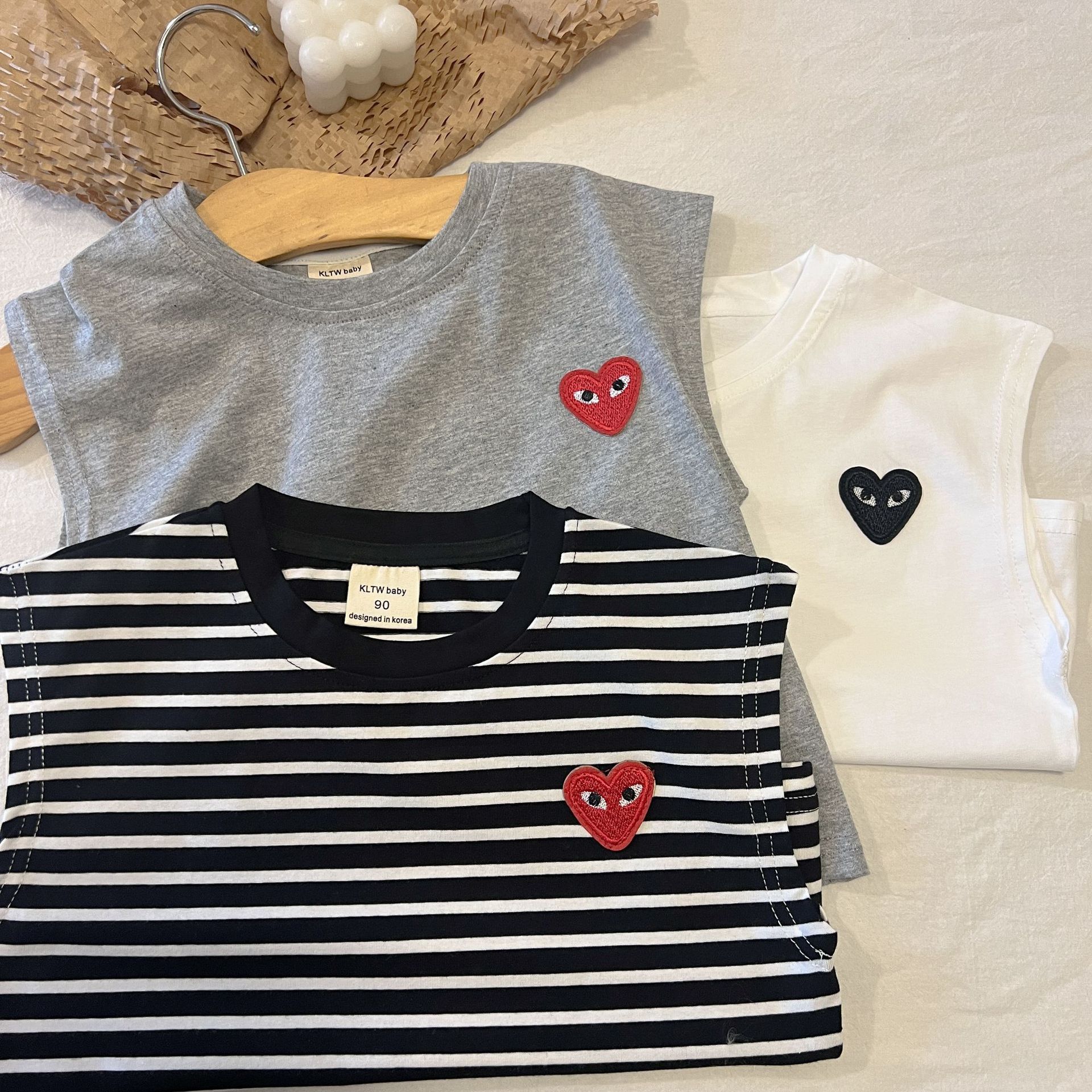 어린이 조끼 2024 여름 새로운 소년과 소녀 사랑 티셔츠 아기 민소매 티셔츠 어린이 줄무늬 최고 단색 라운드스토어 가기