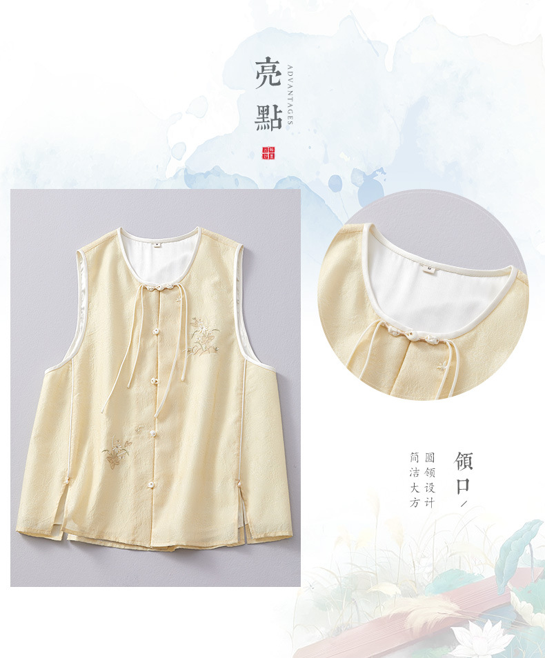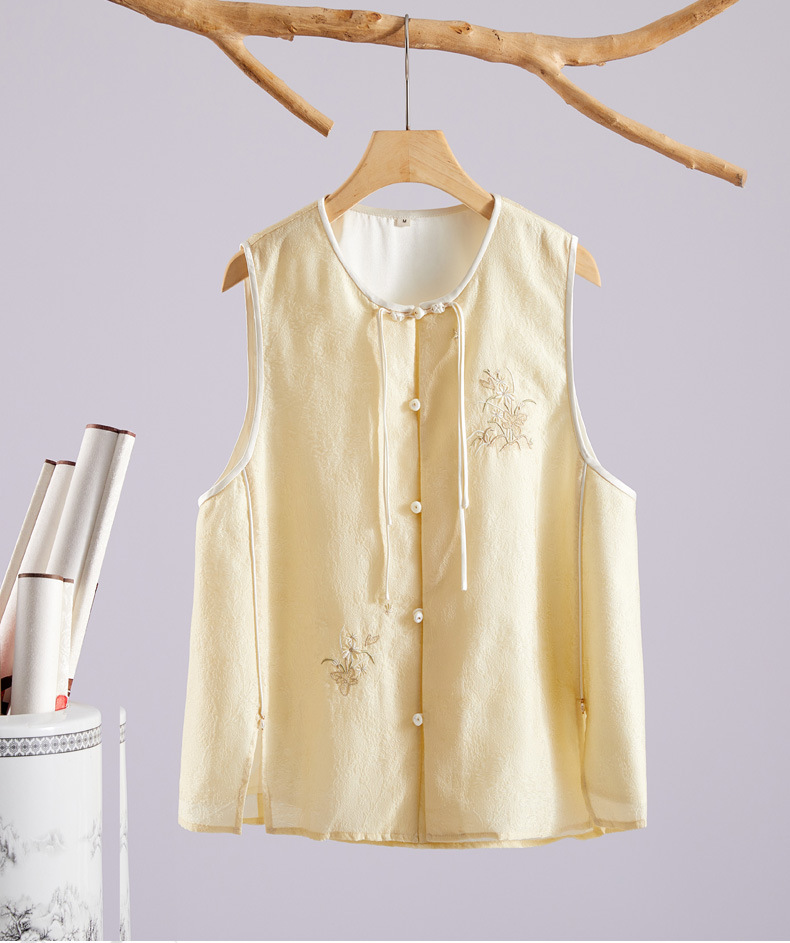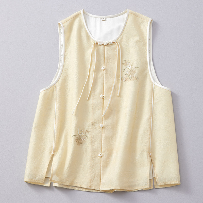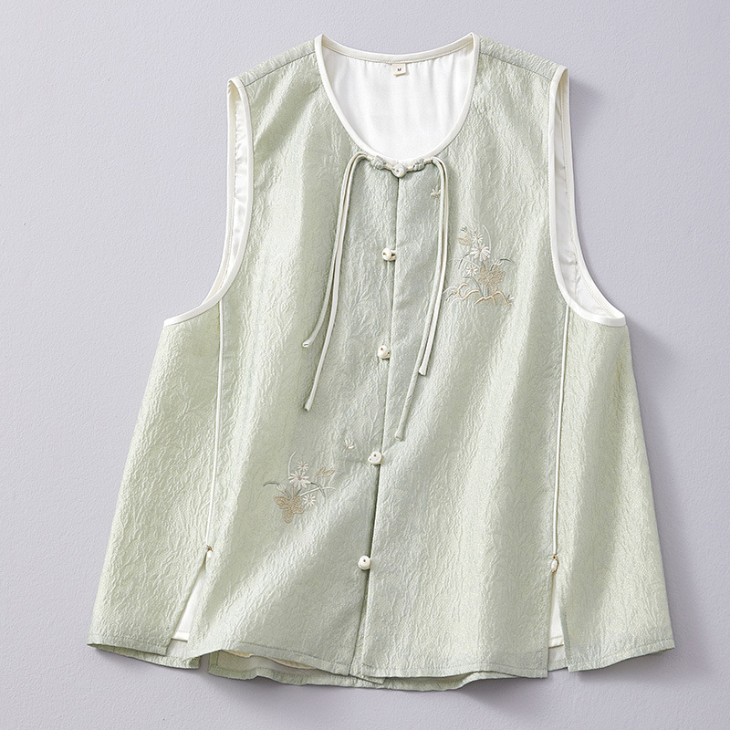 Chan Cha Fu 중국 스타일 여성용 크루 넥 조끼 빈티지 버클 자카드 자수 민소매 수정 한푸 조끼 탑