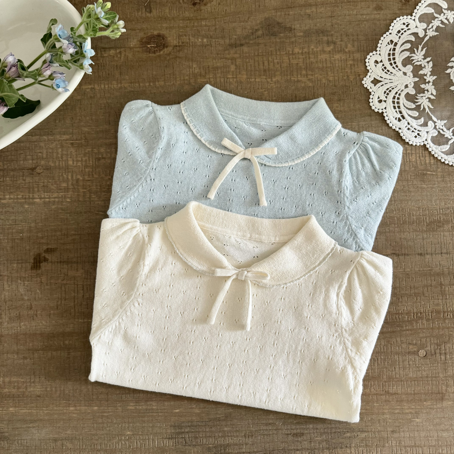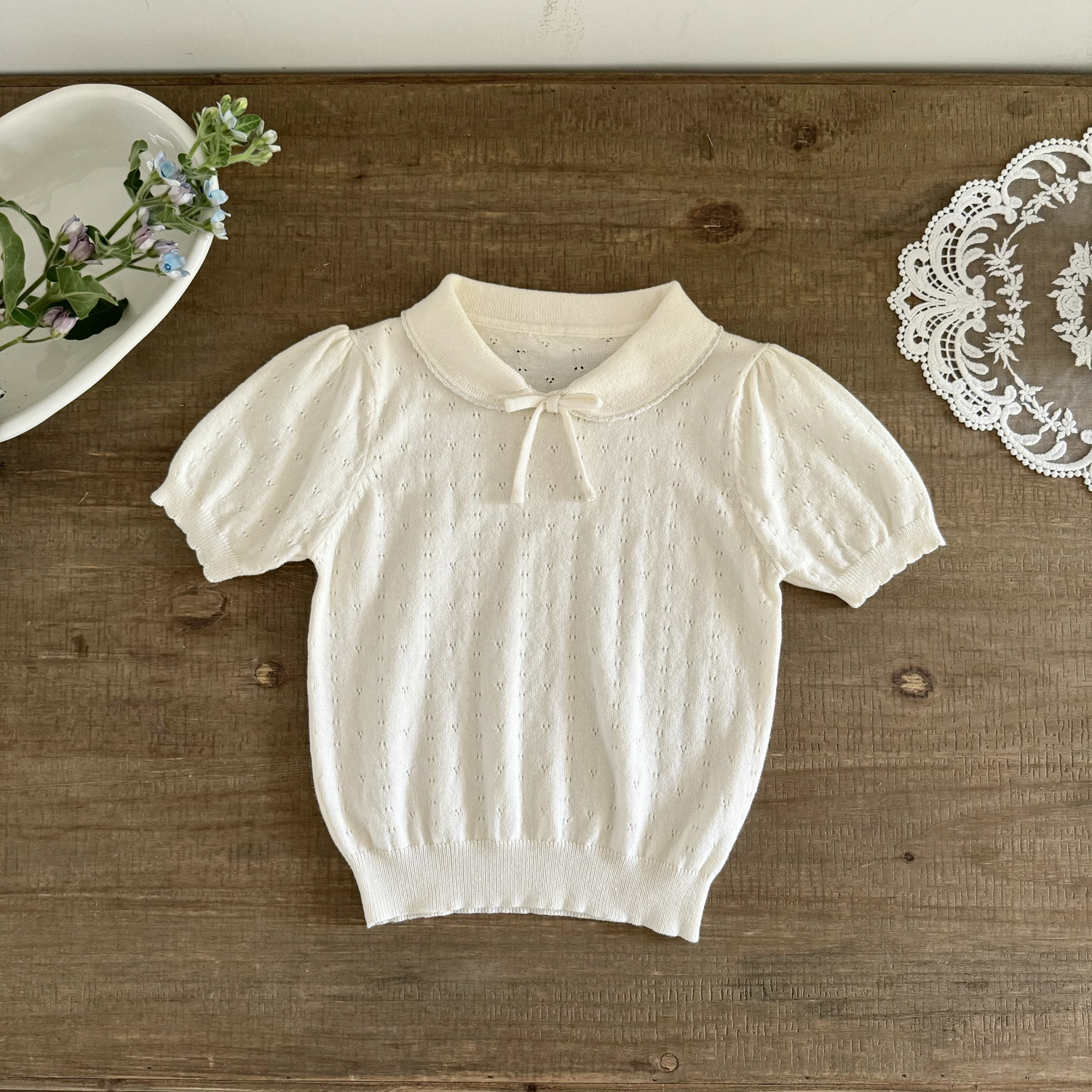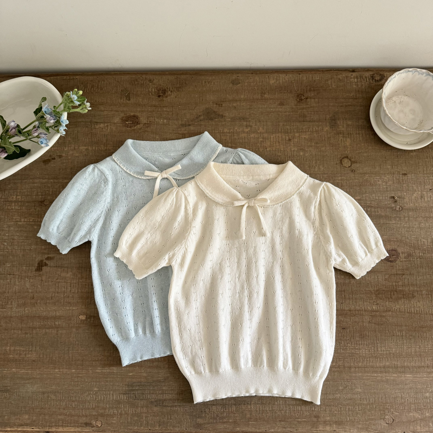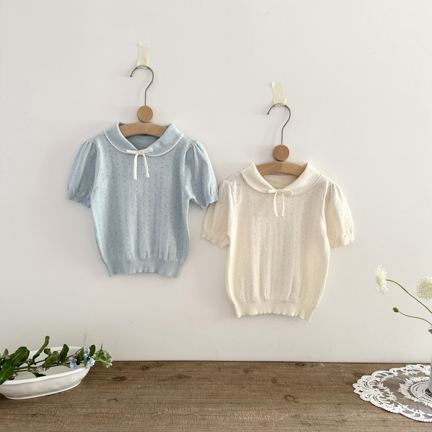 일본 아동복 소녀 반팔 스웨터, 랩 귀여운 활 반팔 티셔츠 Ins 여성용 반팔 탑