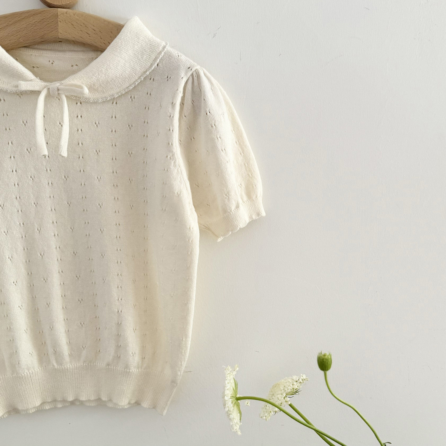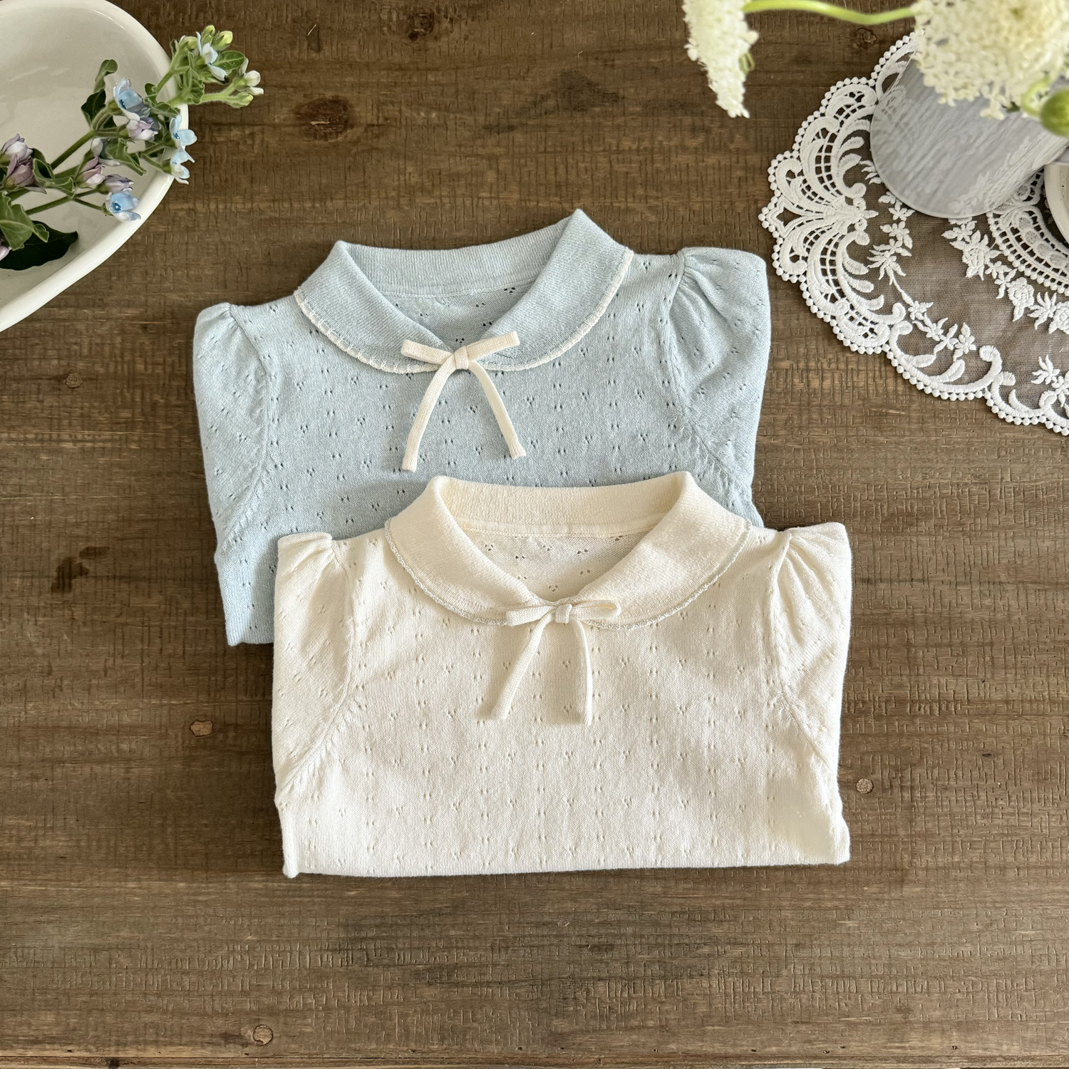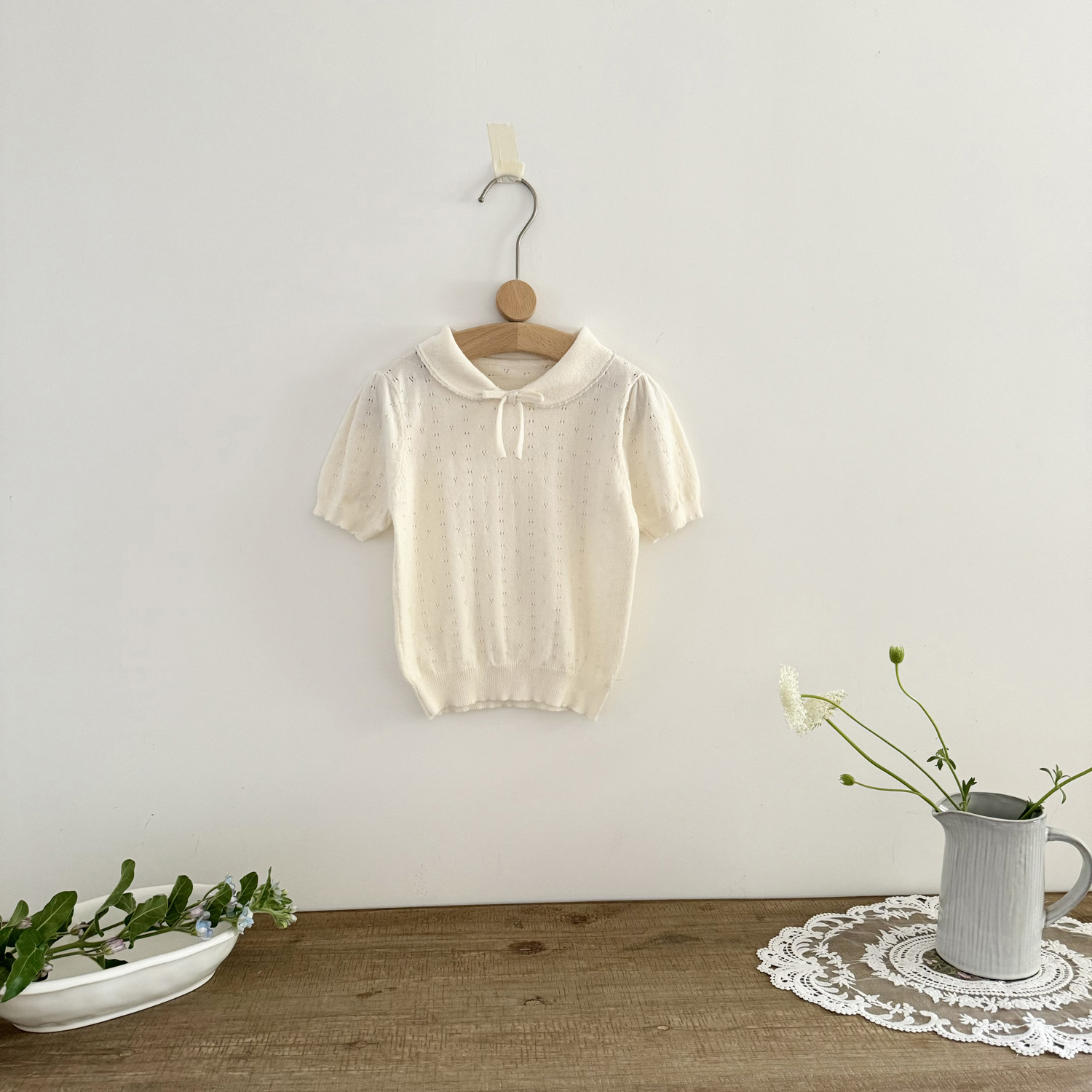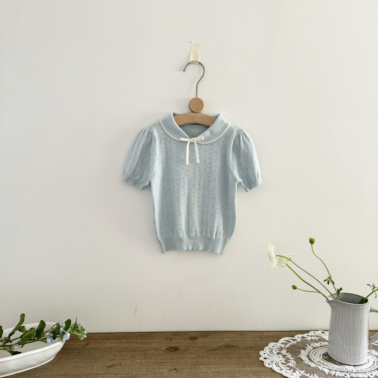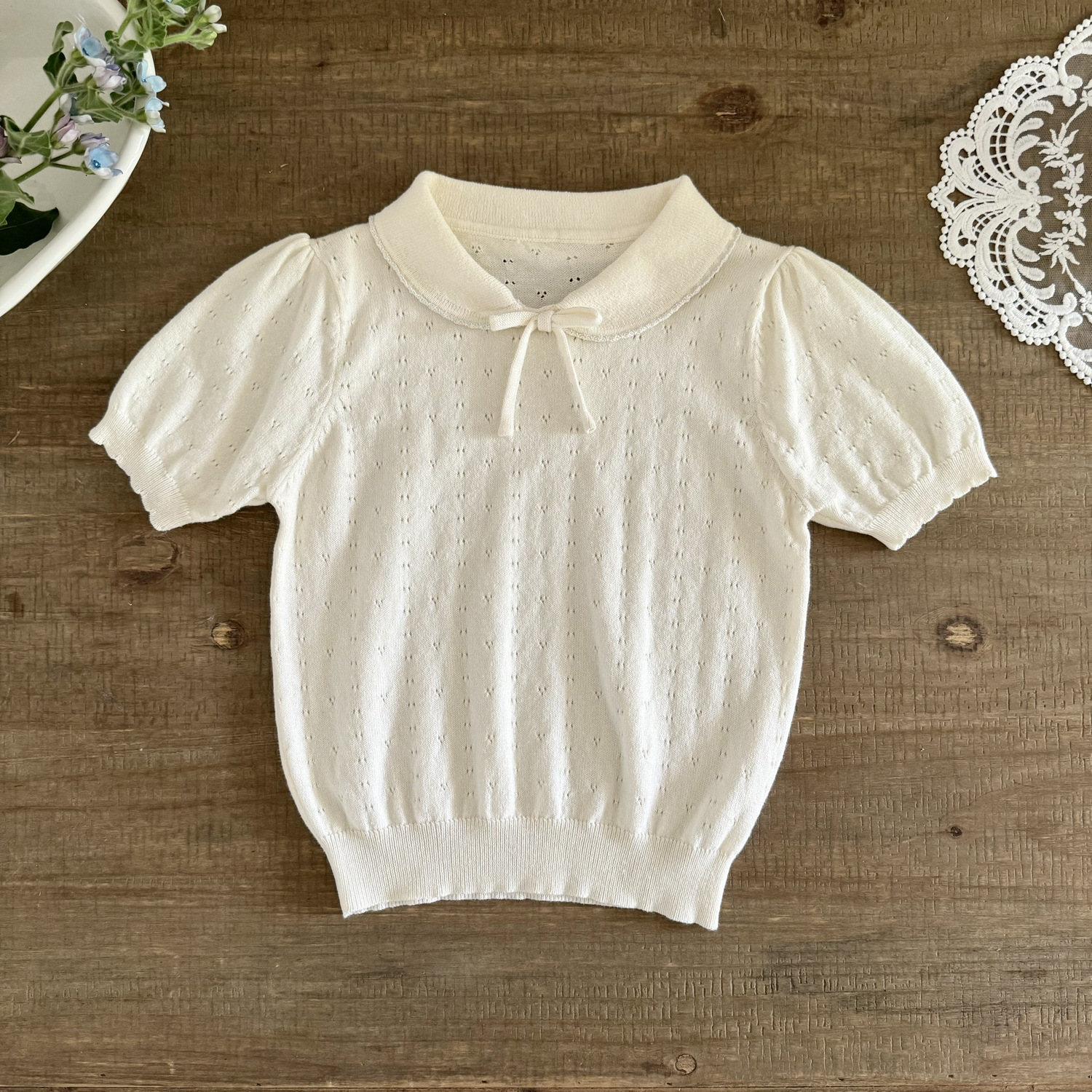 일본 아동복 소녀 반팔 스웨터, 랩 귀여운 활 반팔 티셔츠 Ins 여성용 반팔 탑