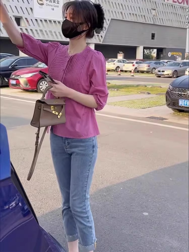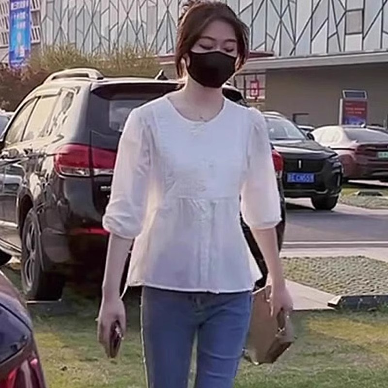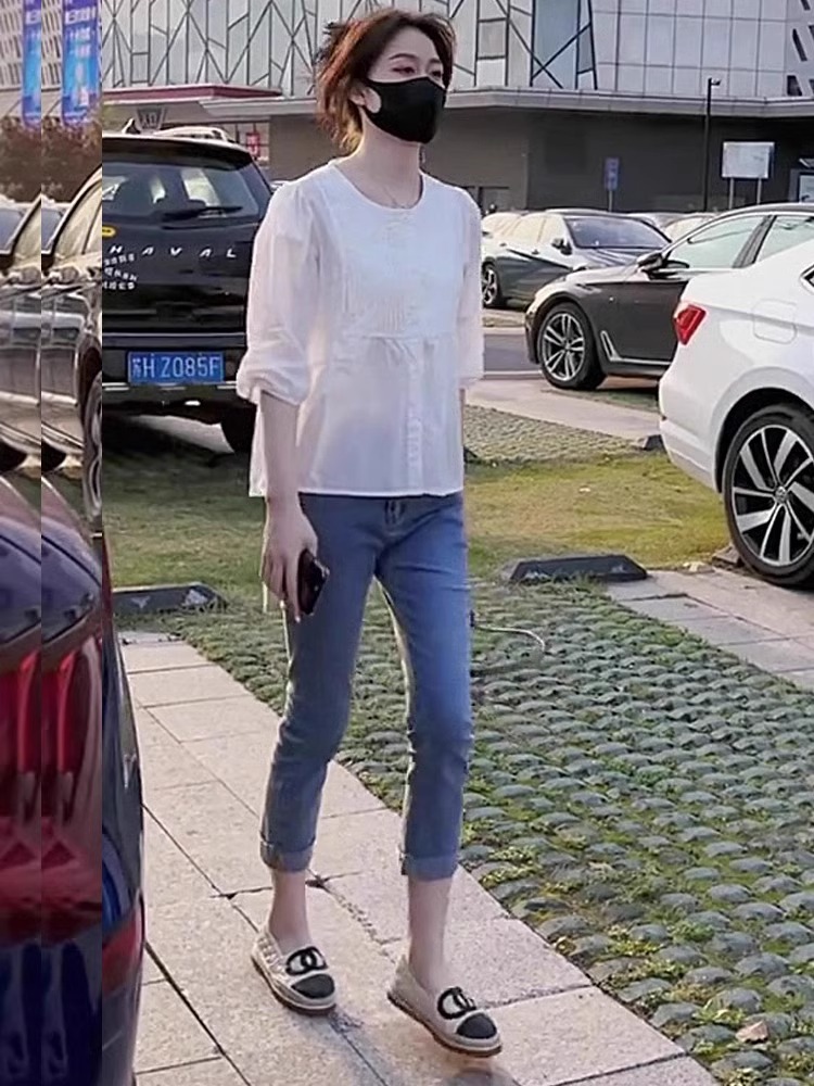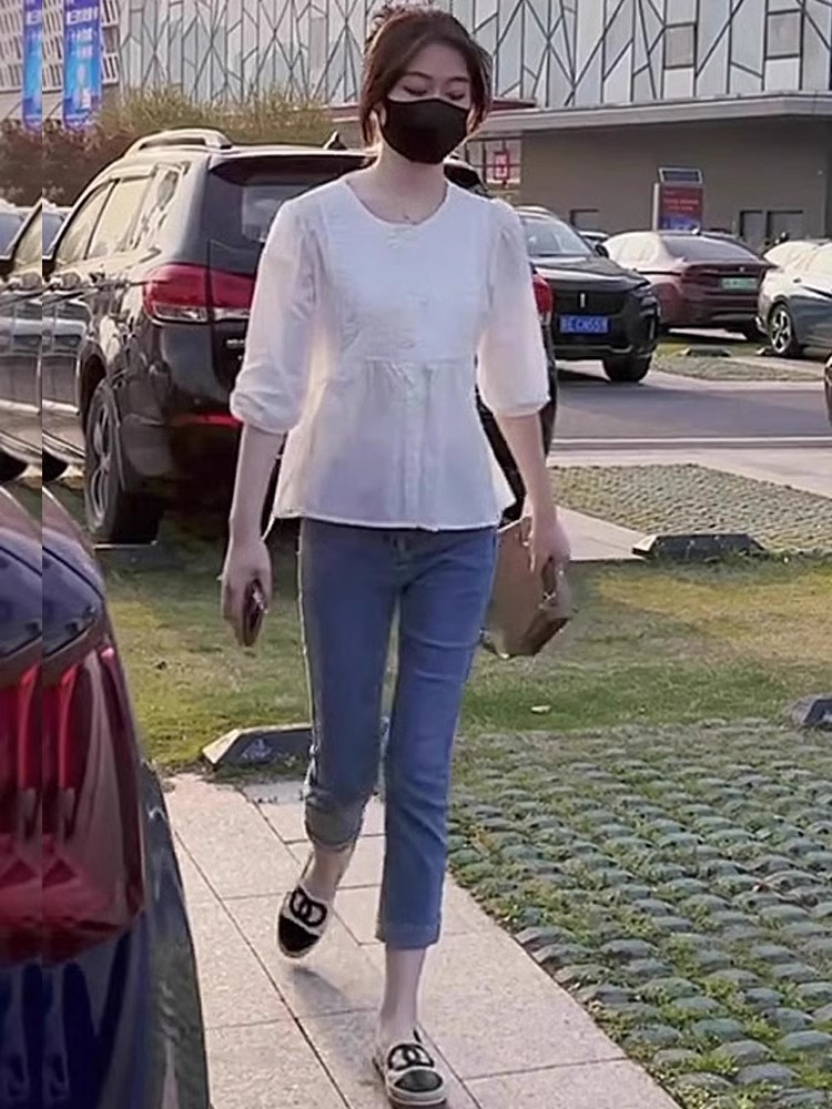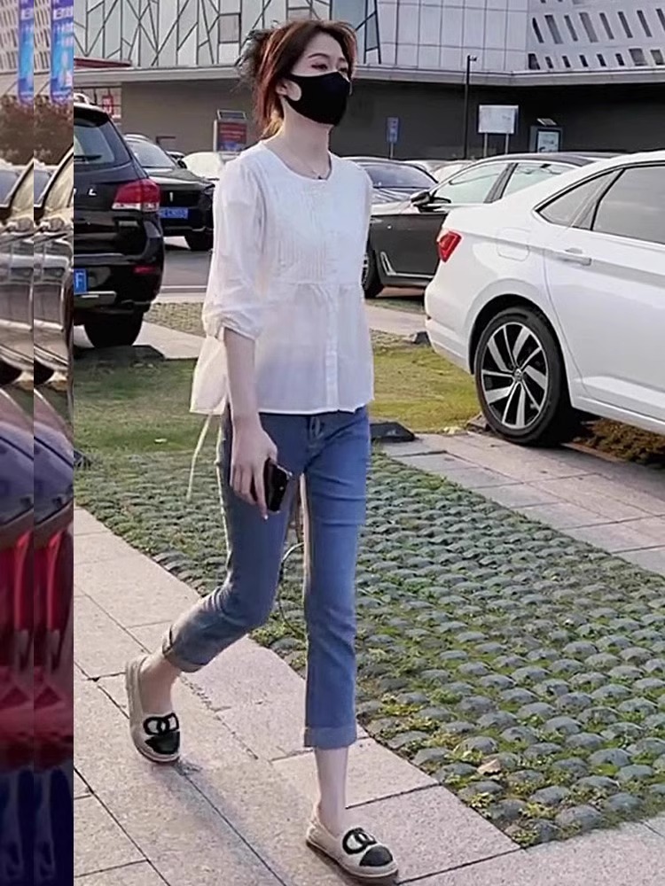 7 점 슬리브 주름 느슨한 슬리밍 셔츠 높은 허리 데님 자른 바지 투피스 세트 작은 달콤한 우유 사랑스러운 세트스토어 가기