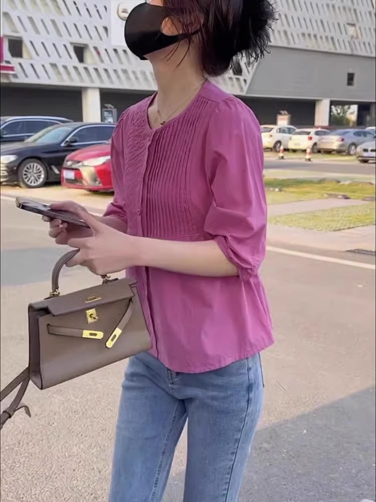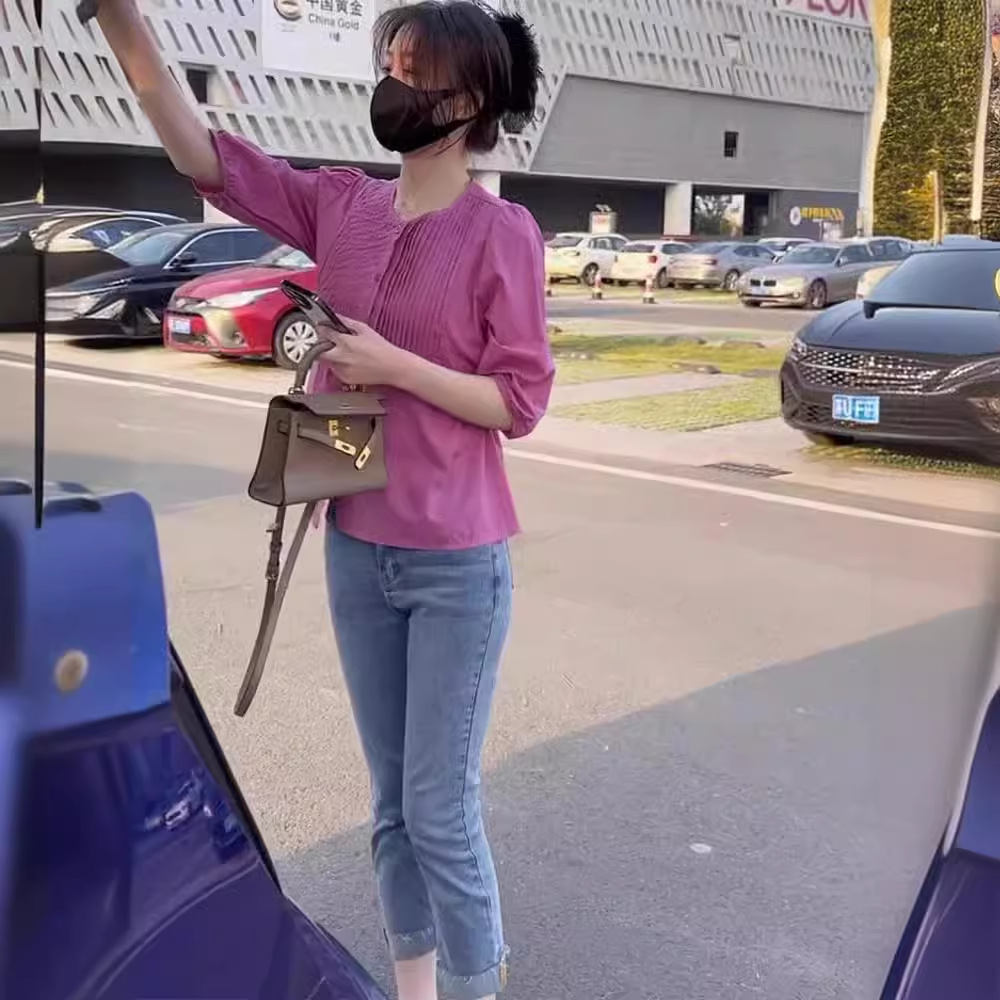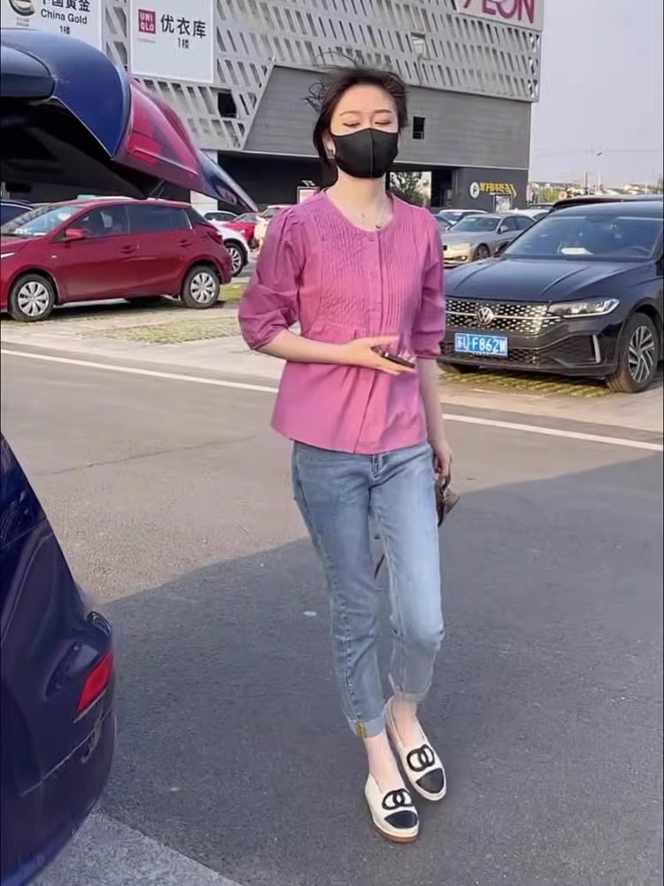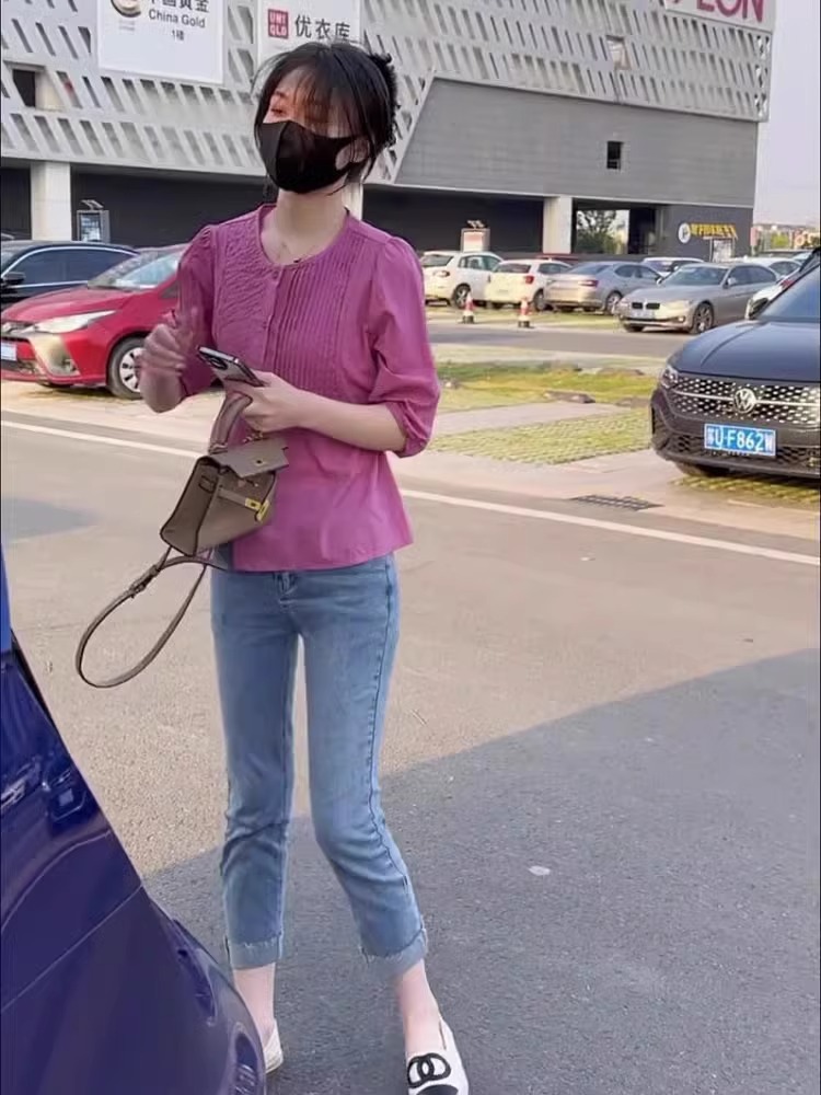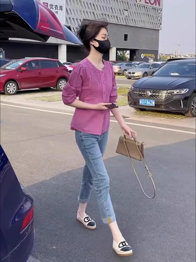 7 점 슬리브 주름 느슨한 슬리밍 셔츠 높은 허리 데님 자른 바지 투피스 세트 작은 달콤한 우유 사랑스러운 세트스토어 가기