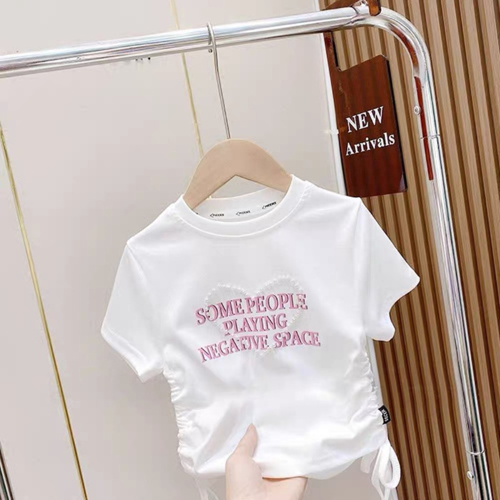소녀 중공업 구슬 사랑 반팔 티셔츠 여름 2024 새로운 스타일 외국 스타일 7 어린이 디자인 사이드 드로스트링 탑스토어 가기