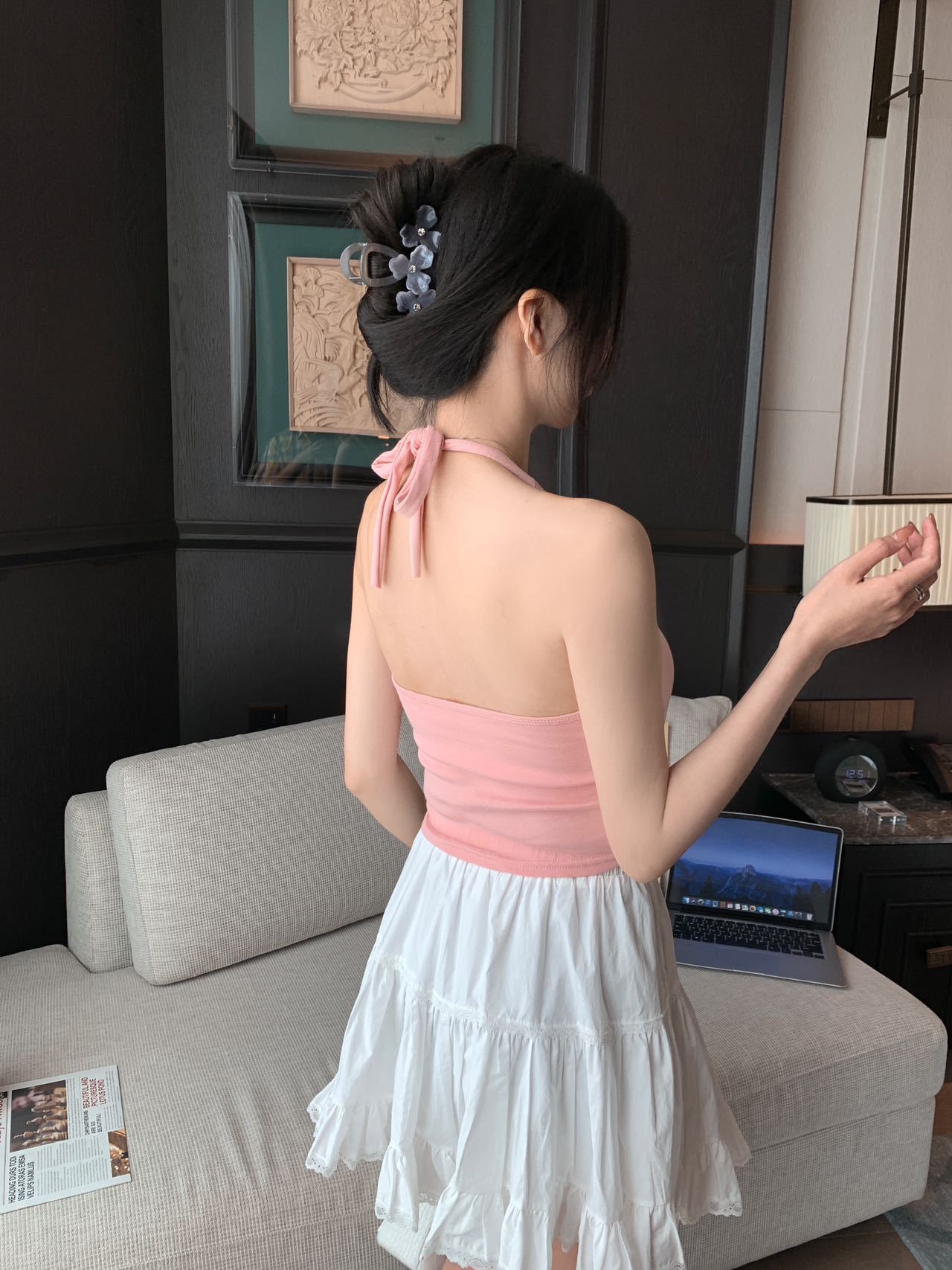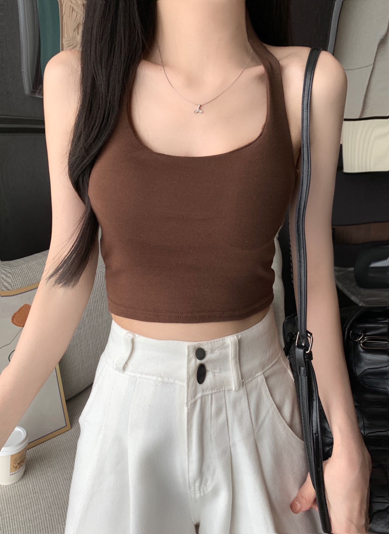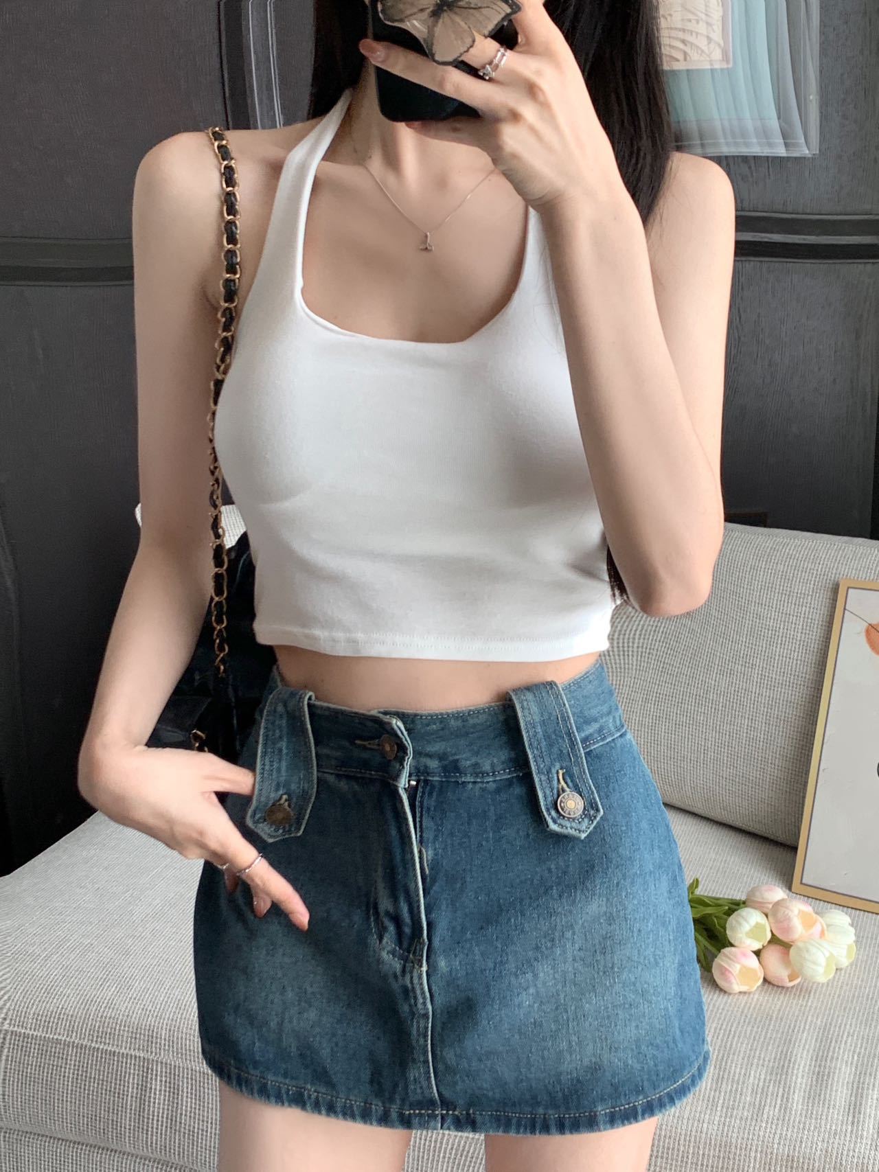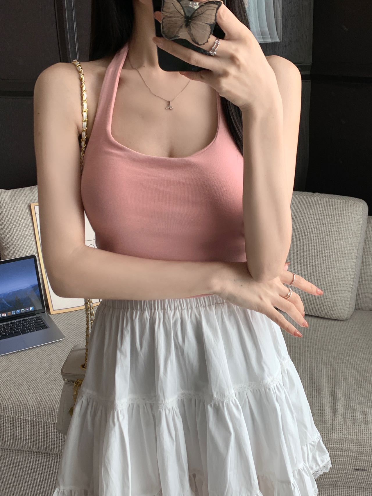 A070 # 레이온 홀터넥 넥 스트랩 캐미솔 여성 고정 컵 인기 핫 소녀 뷰티 백 슬리밍 탑 여름스토어 가기
