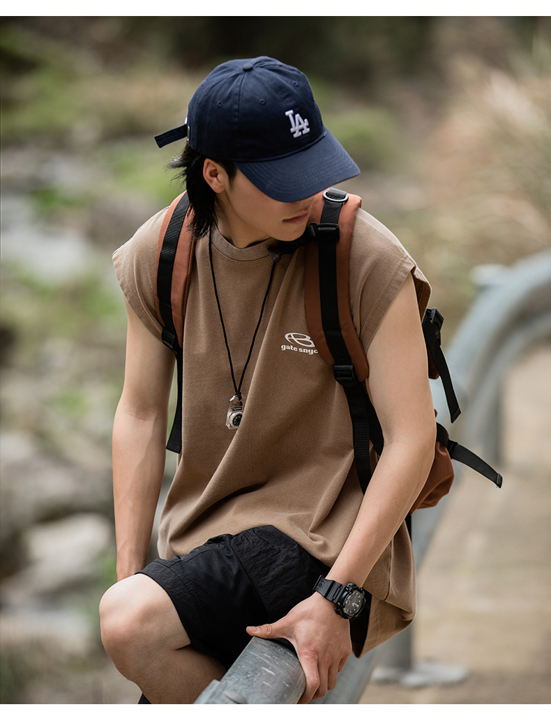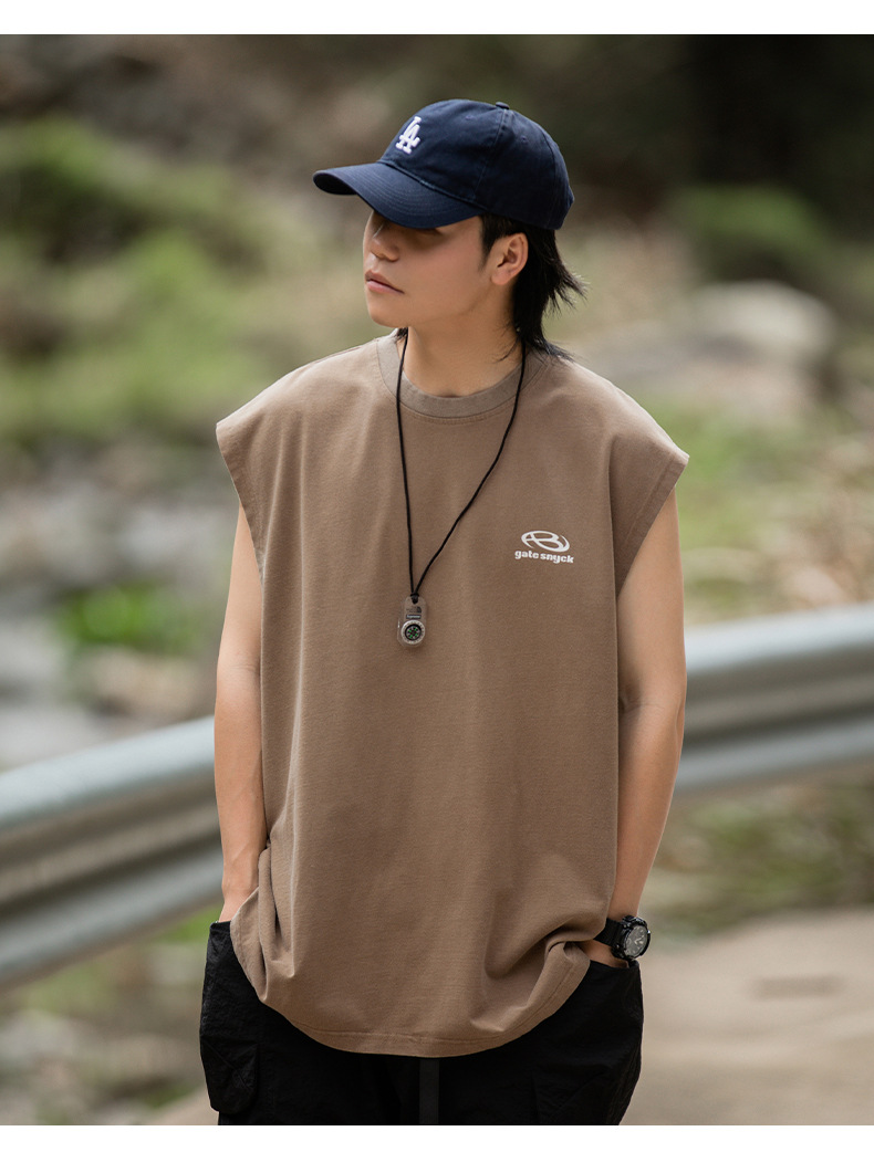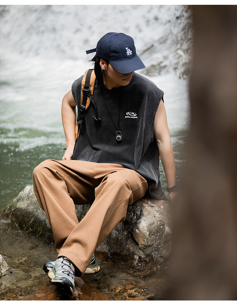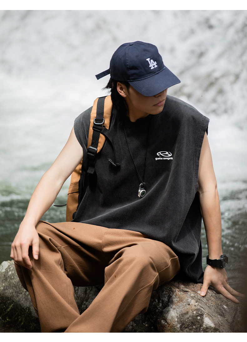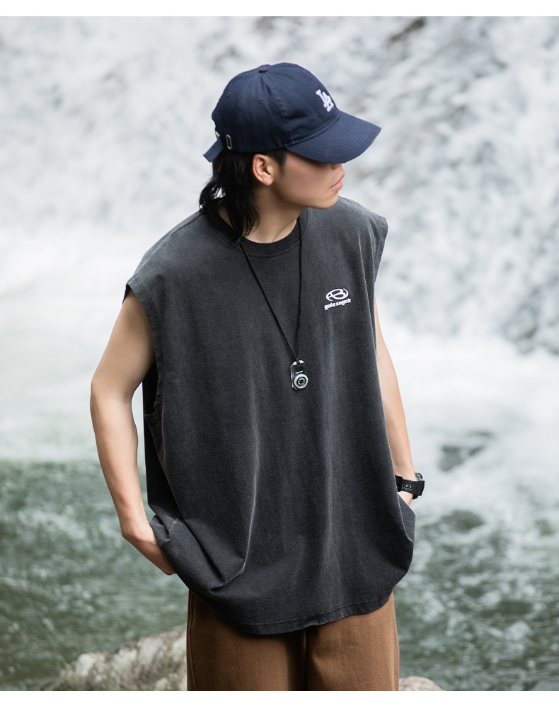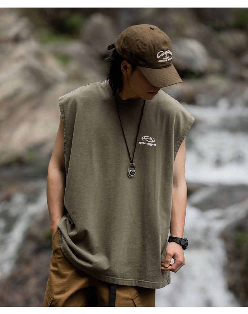 한로드 남성용 세탁 코튼 민소매 티셔츠 조끼 새로운 일본 레트로 트렌디 브랜드 인쇄 느슨한 웨이스트 코트 Q스토어 가기