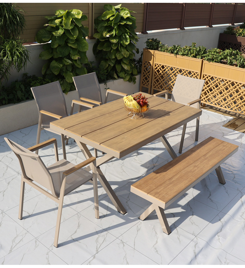 야외 테이블과 의자 조합 안뜰 정원 야외 방수 플라스틱 나무 긴 테이블 바베큐 테이블 외식 목재 발코니