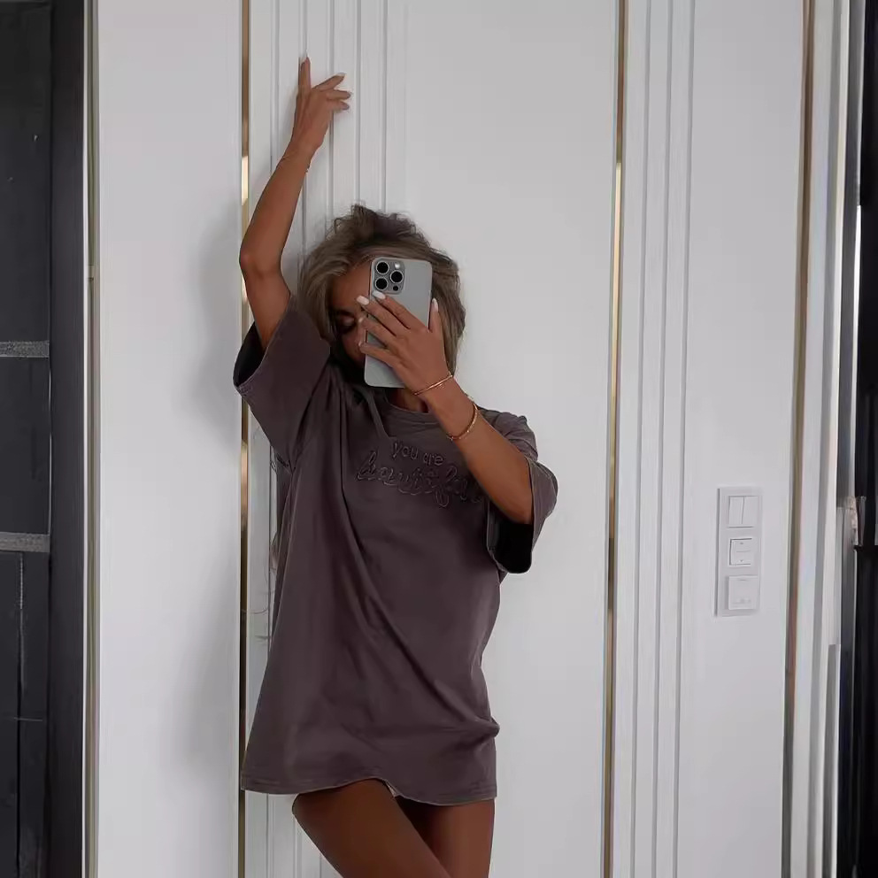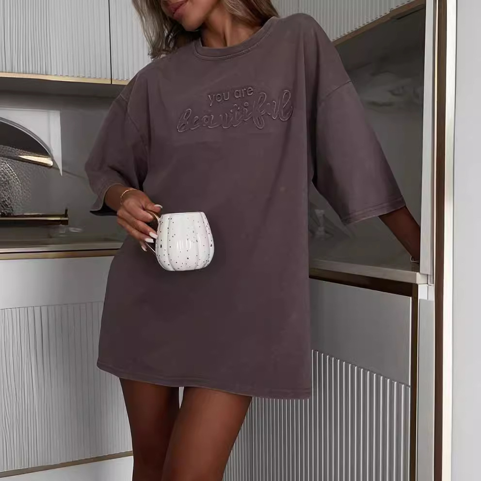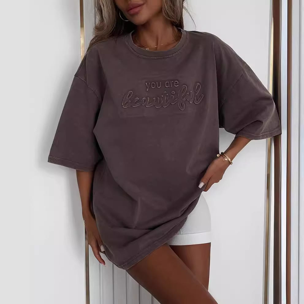 名称:2024新品字母发泡印花宽松遮肚显瘦上衣女春夏季ins百搭短袖T恤女