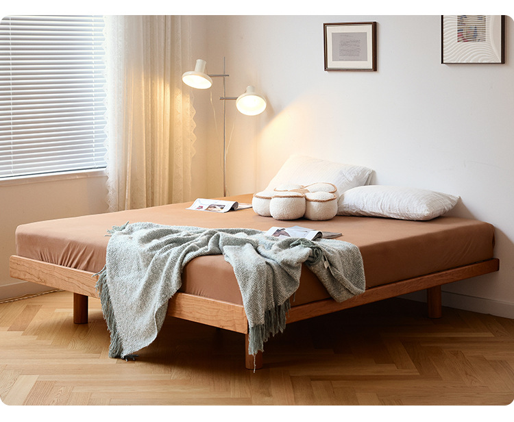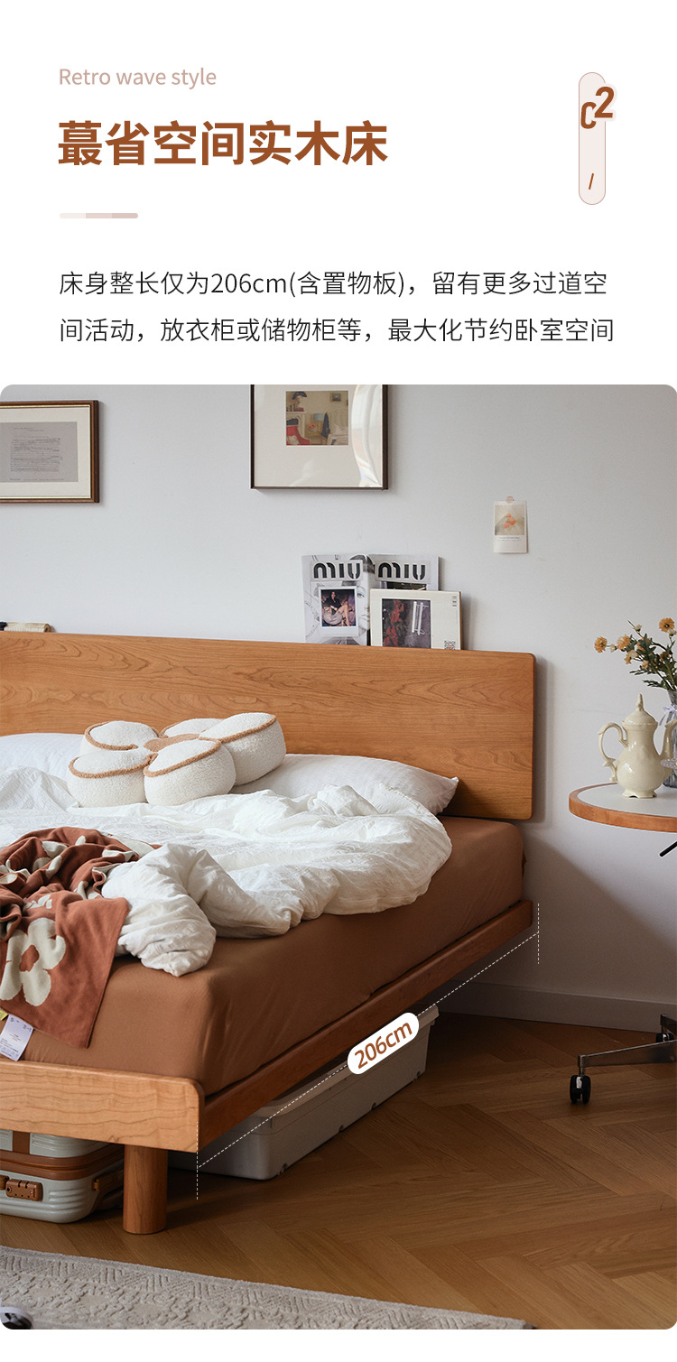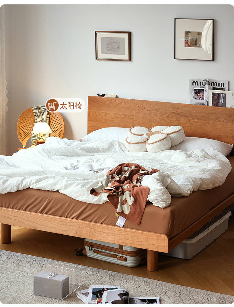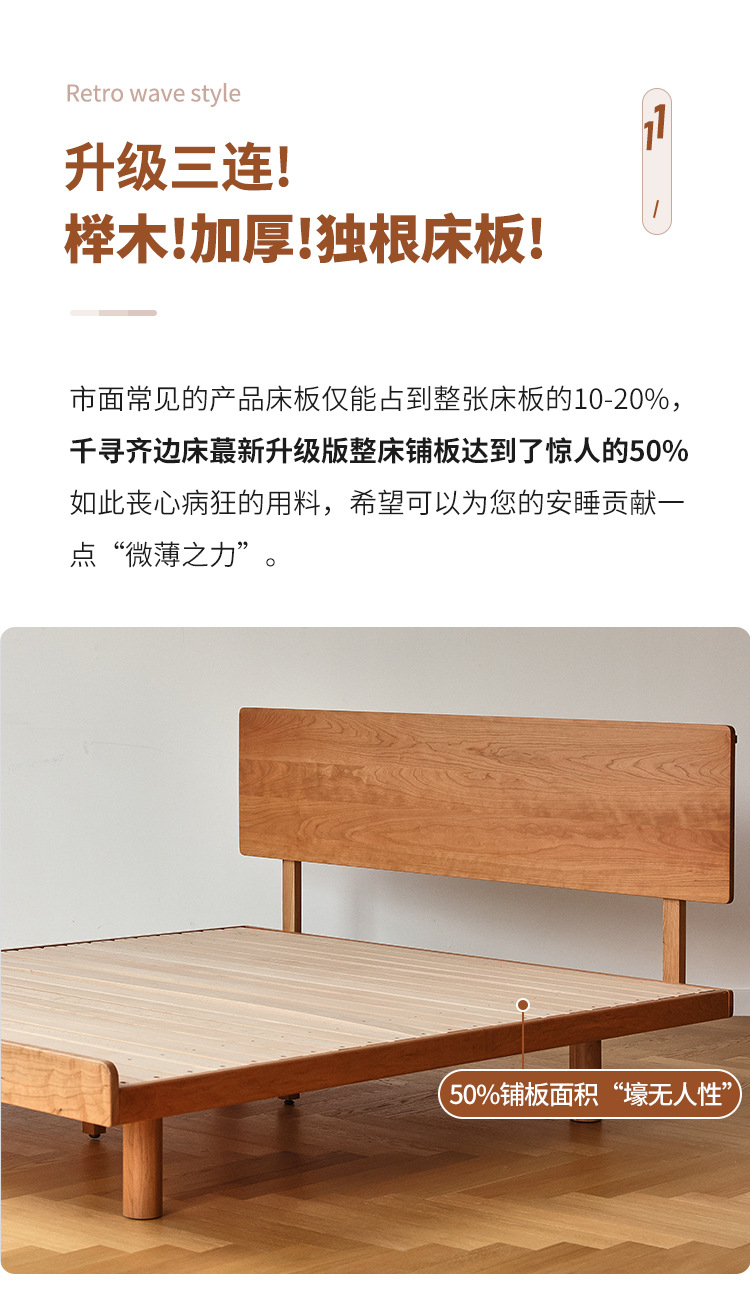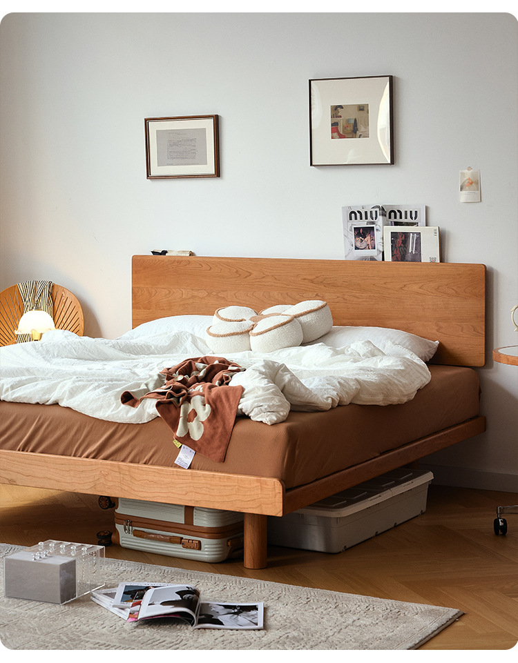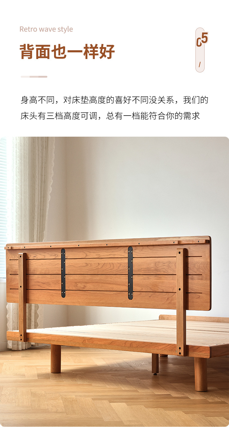 체리나무 침대, 소형 가구용 얇은 침대 헤드보드, 1.8m 침실용 침대, 더블 침대, 레트로 원목 침대, 목공 결합 구조스토어 가기