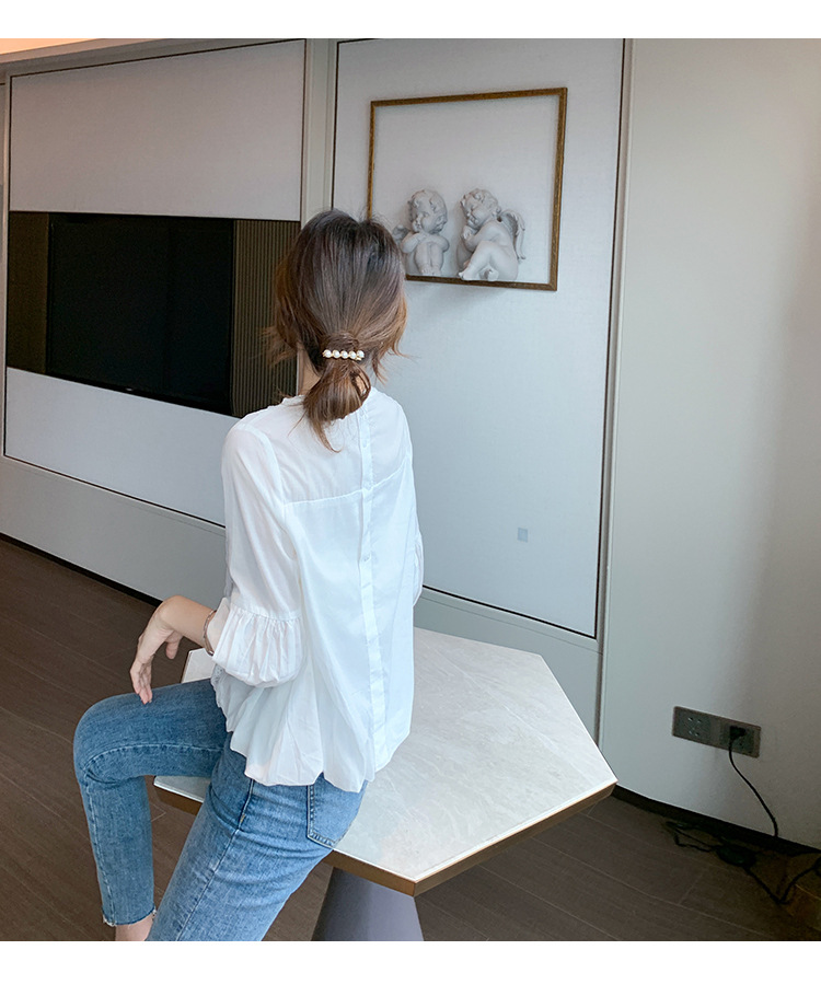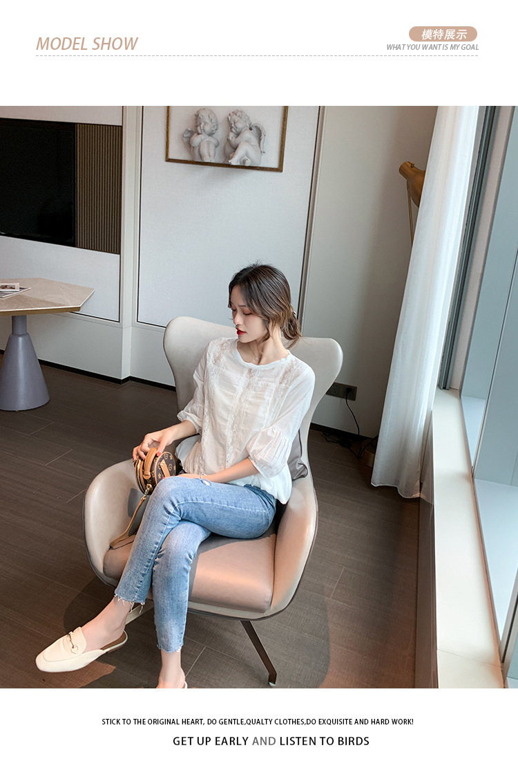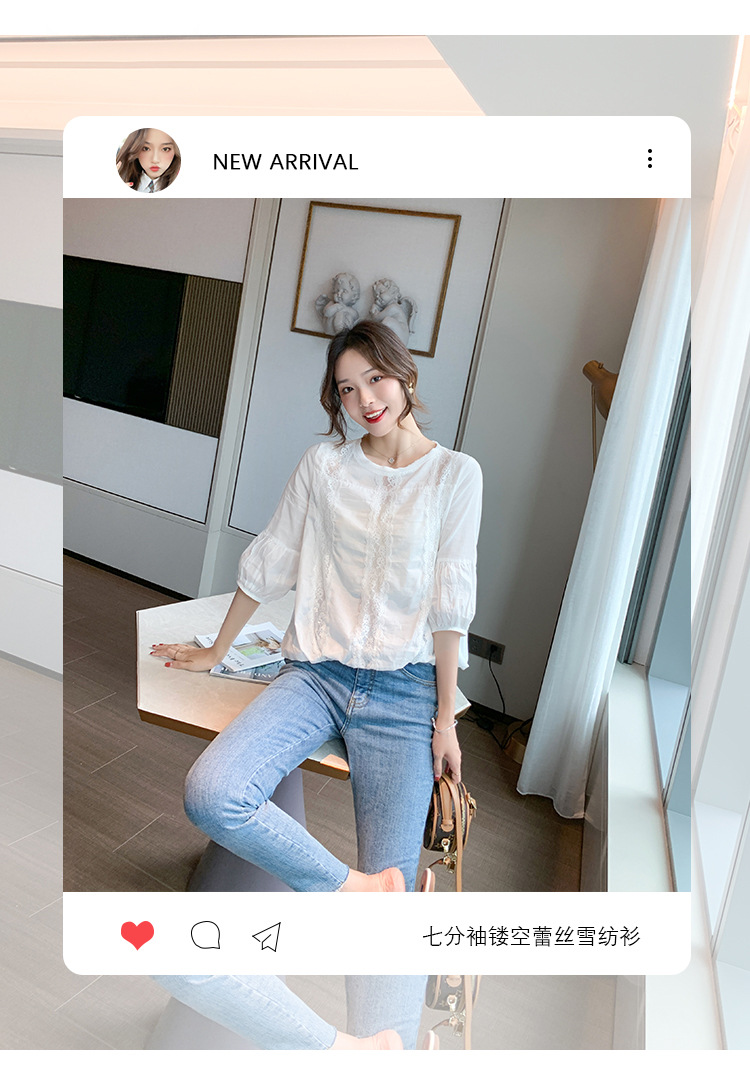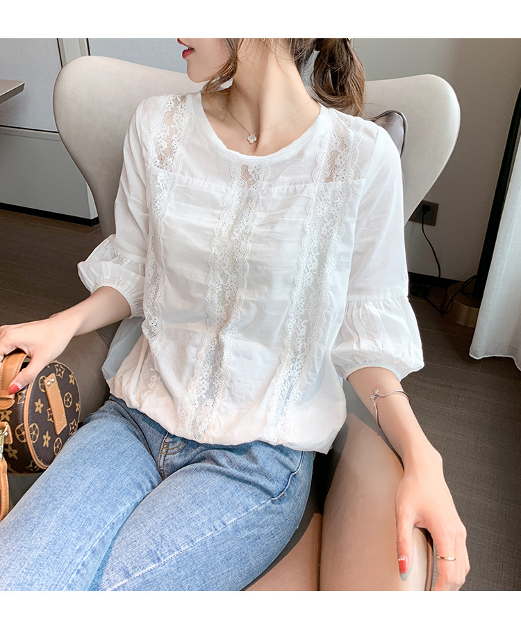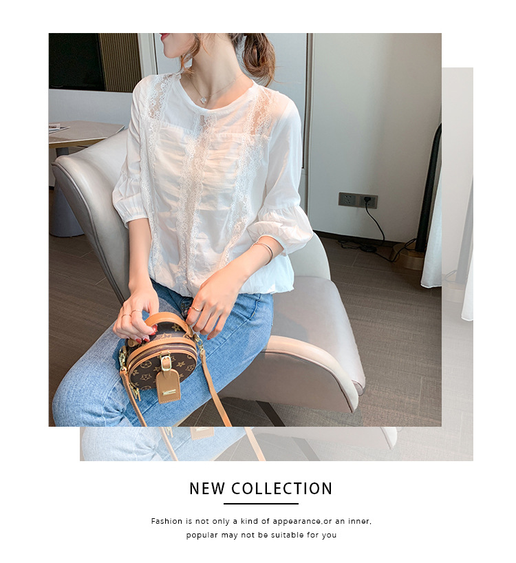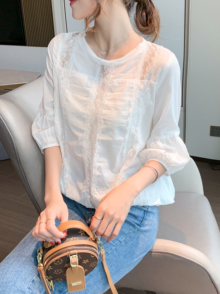 여성용 신상 여름옷 화이트 레이스 셔츠 디자인 감각이 돋보이는 패셔너블하고 고급스러운 레이스 디테일의 반팔 탑 쉬폰 셔츠스토어 가기