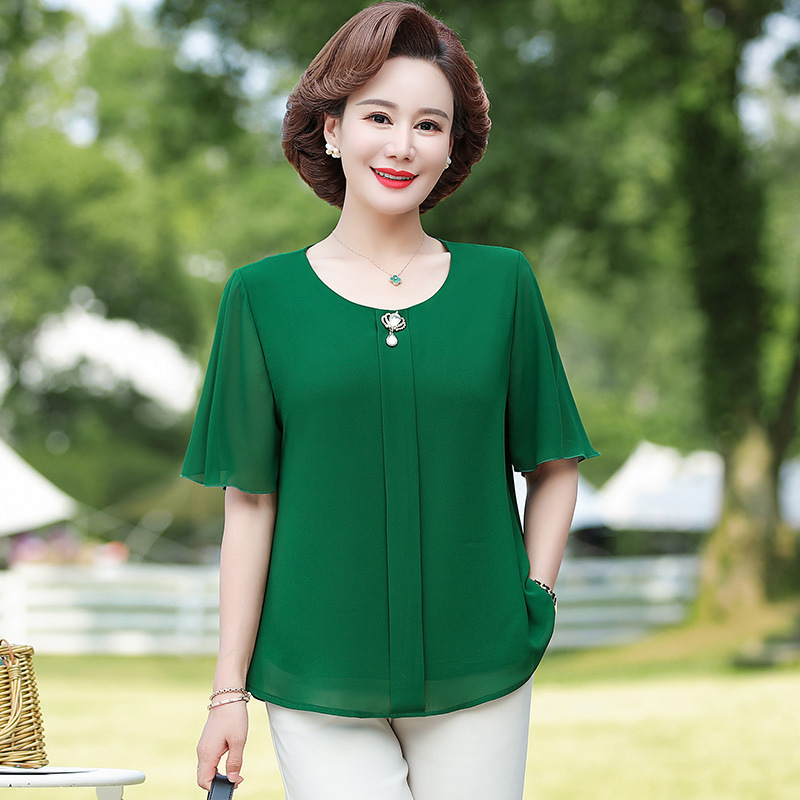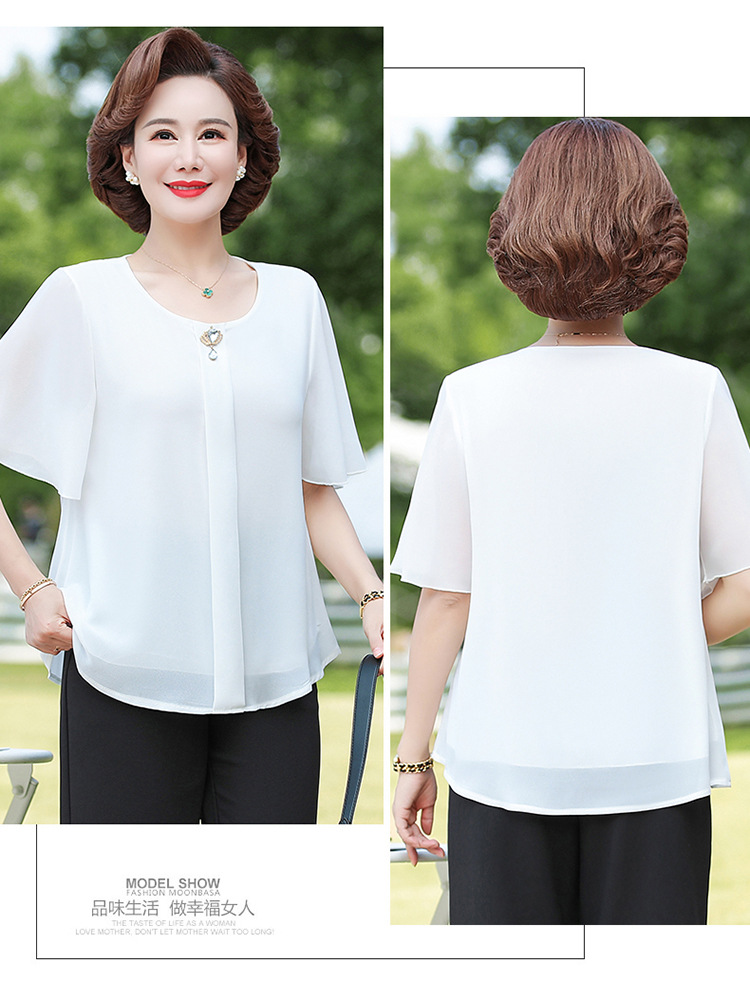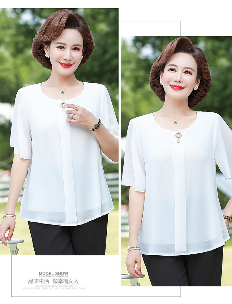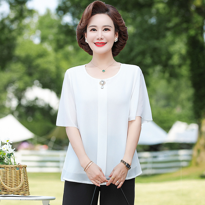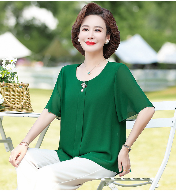 2024 여름 새로운 중년 및 노인 여성 의류 어머니 패션 반팔 풀오버 시폰 셔츠 비슷한 셔츠 풀오버