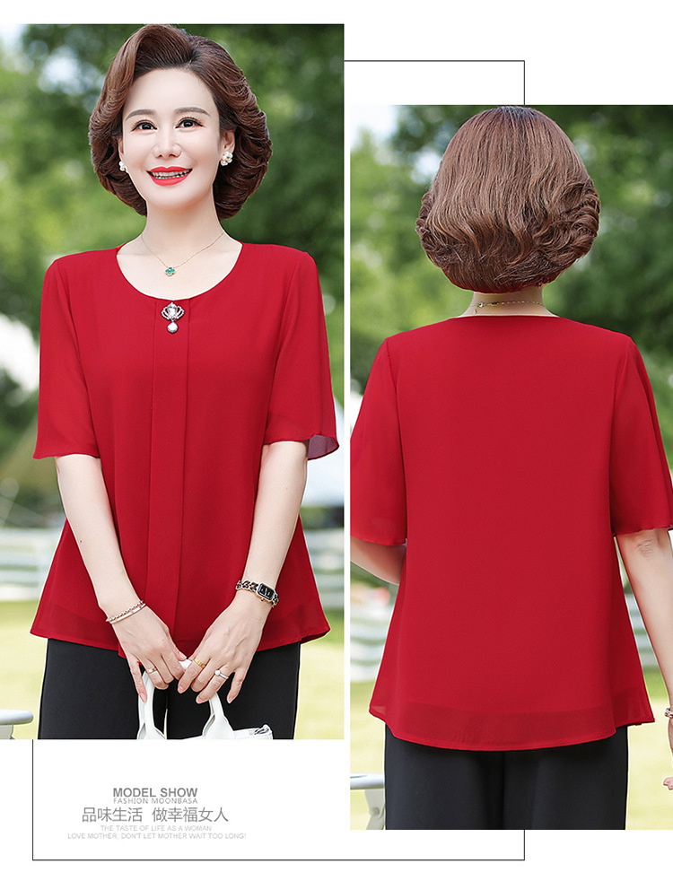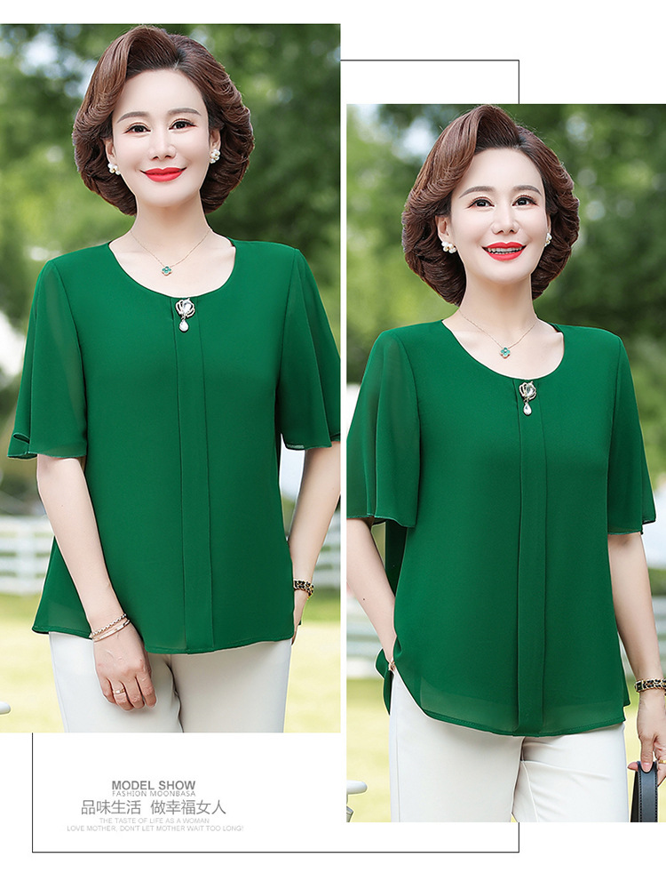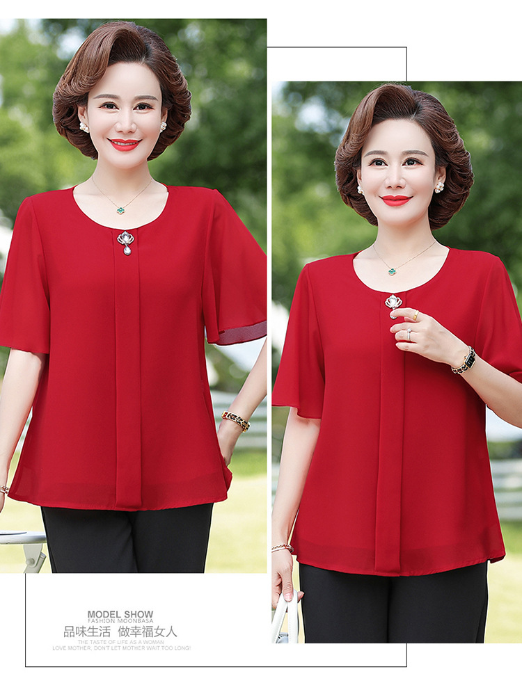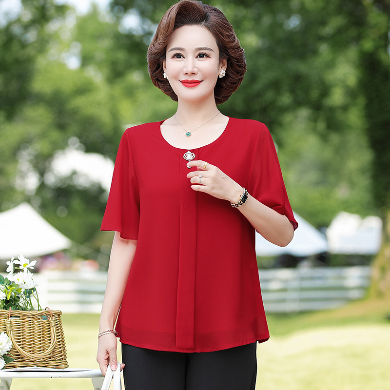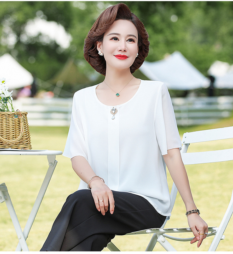 2024 여름 새로운 중년 및 노인 여성 의류 어머니 패션 반팔 풀오버 시폰 셔츠 비슷한 셔츠 풀오버