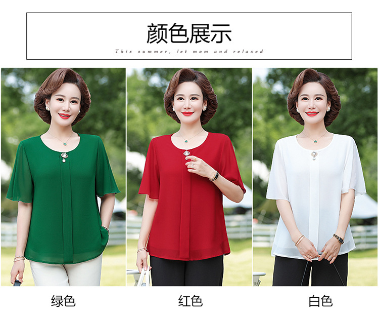 2024 여름 새로운 중년 및 노인 여성 의류 어머니 패션 반팔 풀오버 시폰 셔츠 비슷한 셔츠 풀오버스토어 가기