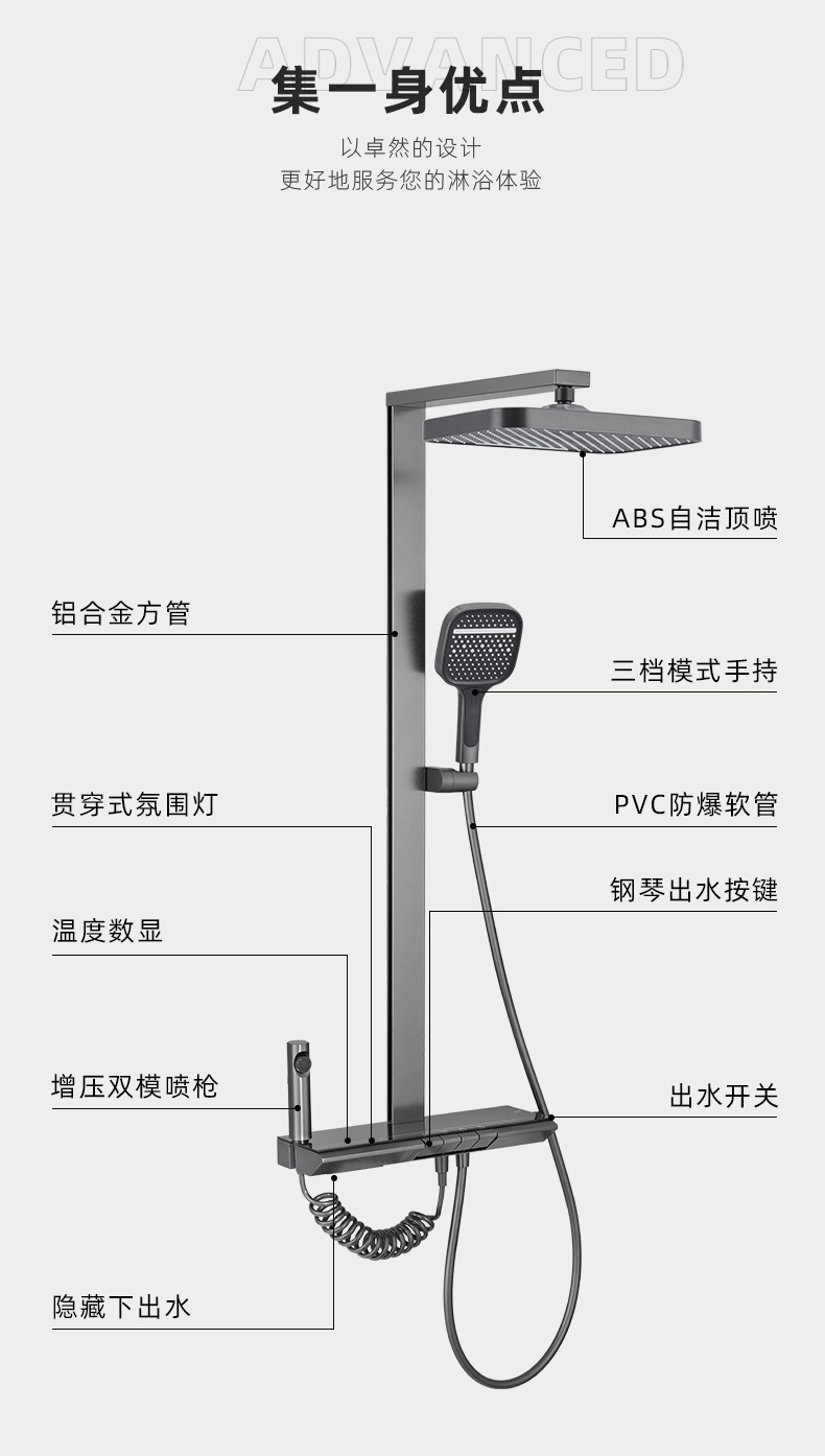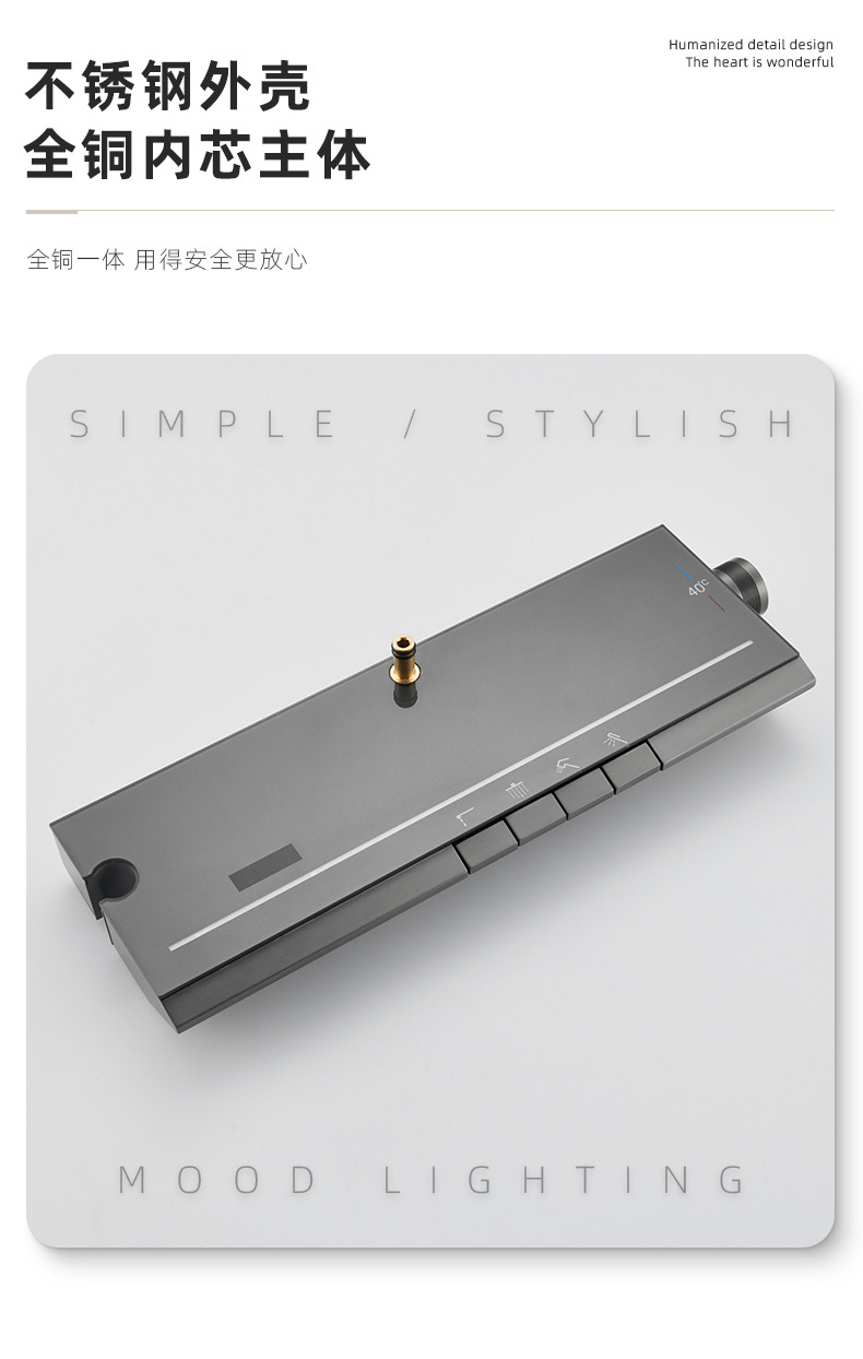 • 디지털 디스플레이 주변 조명을 갖춘 브러시드 건 그레이 사각형 막대 4가지 기능 범용 모델