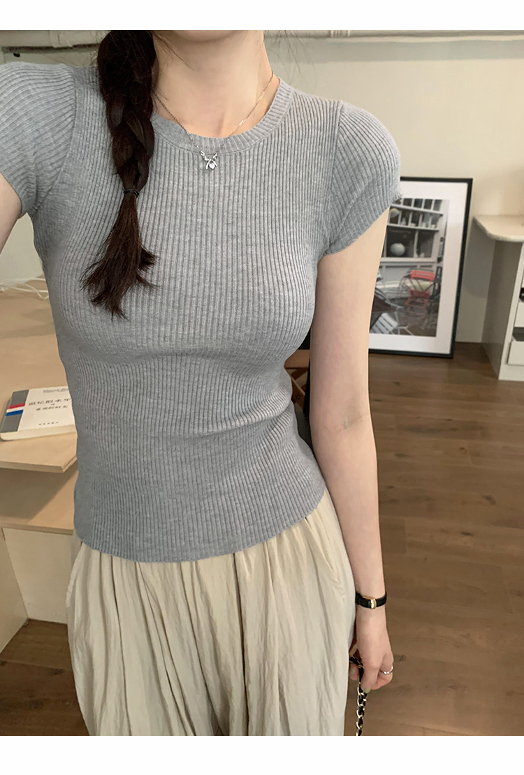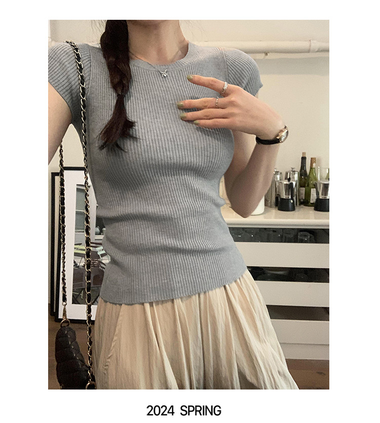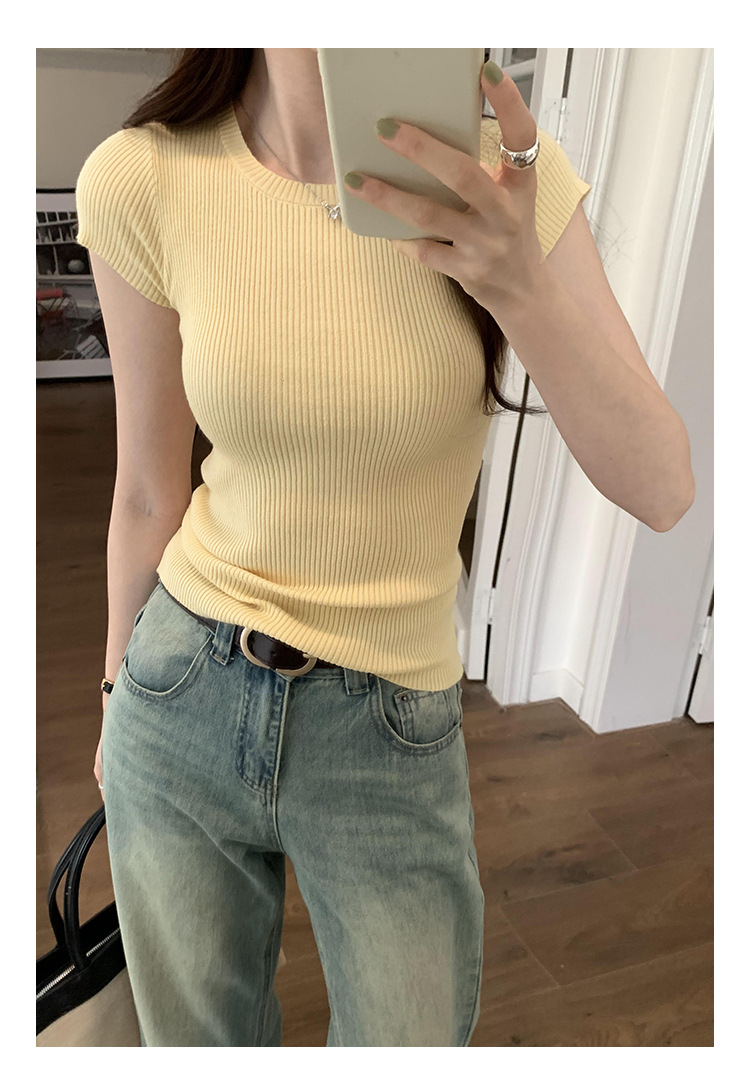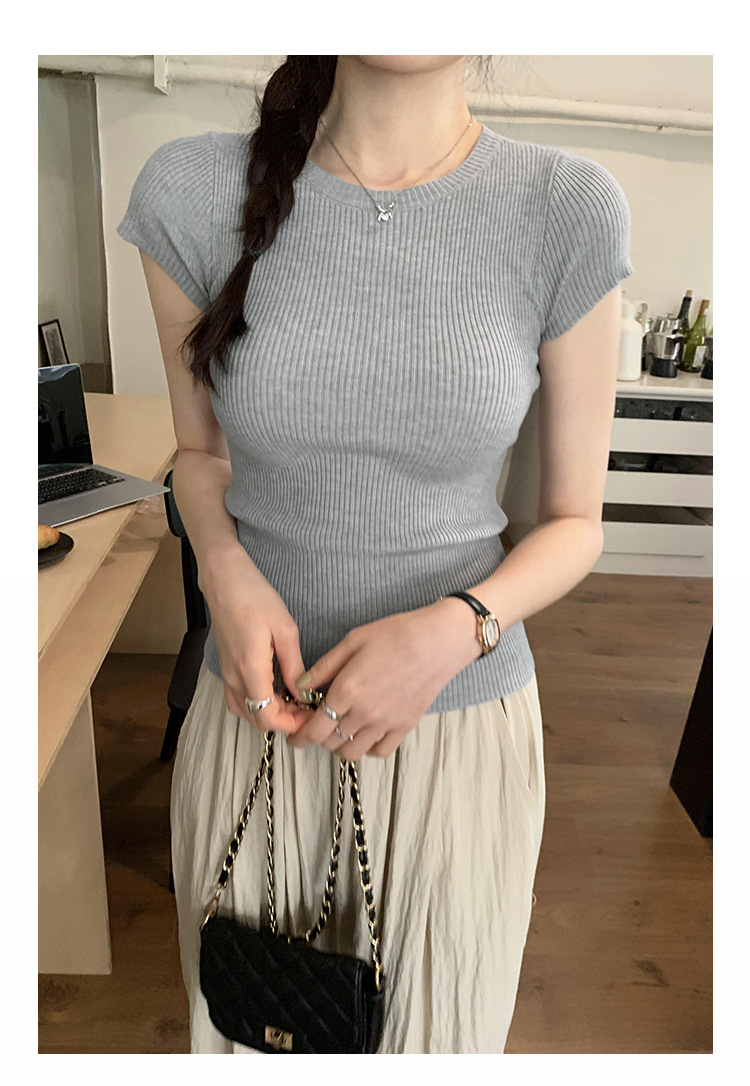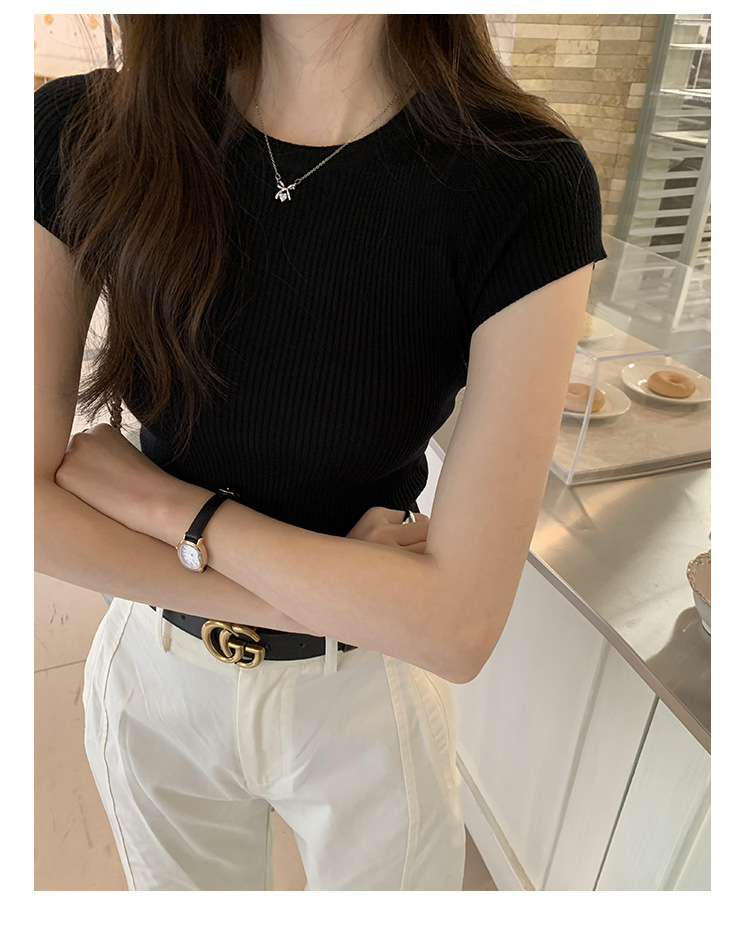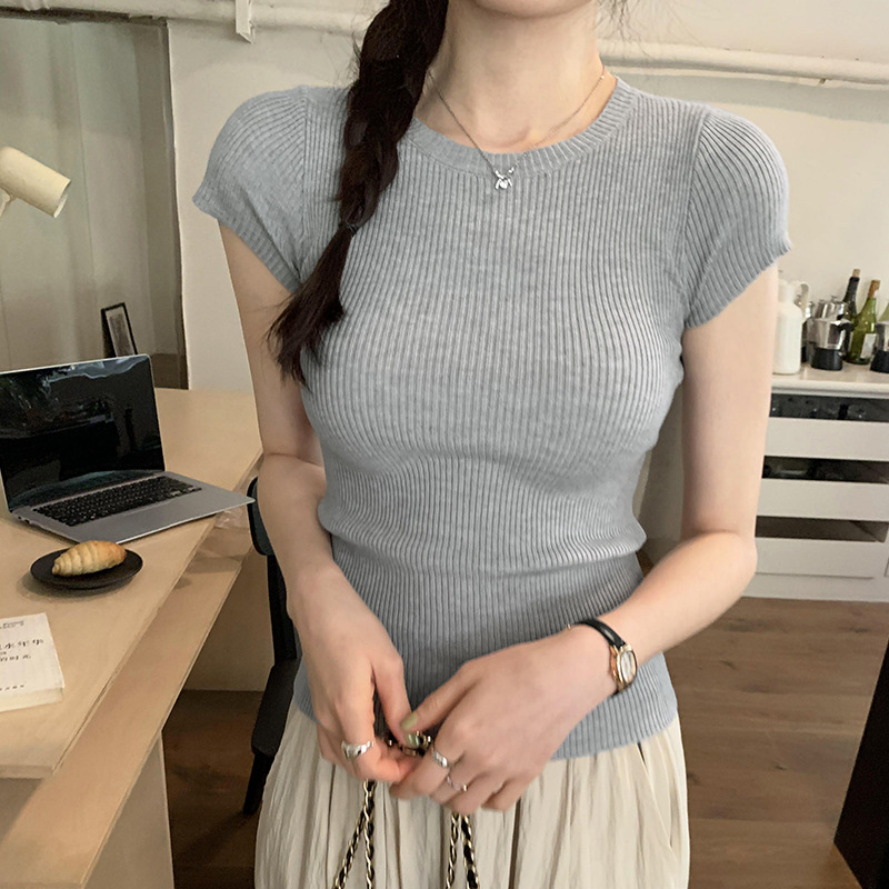 새로운 스타일 간단한 올 매치 반팔 티셔츠 여성용 최고 솔리드 컬러 라운드 넥 슬림 핏 슬리밍 탄성 니트 셔츠 탑스토어 가기