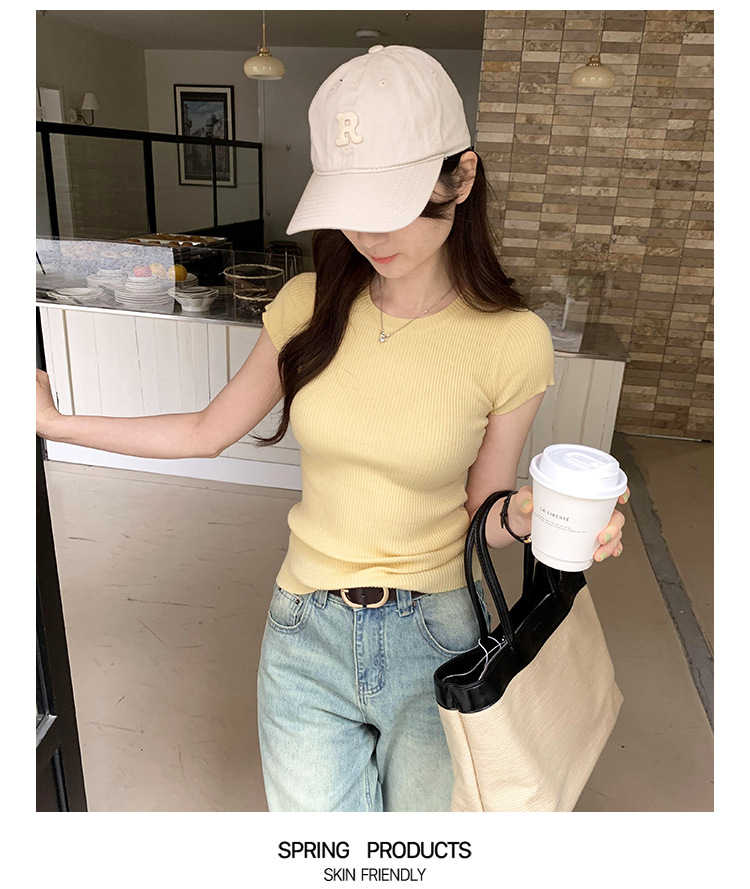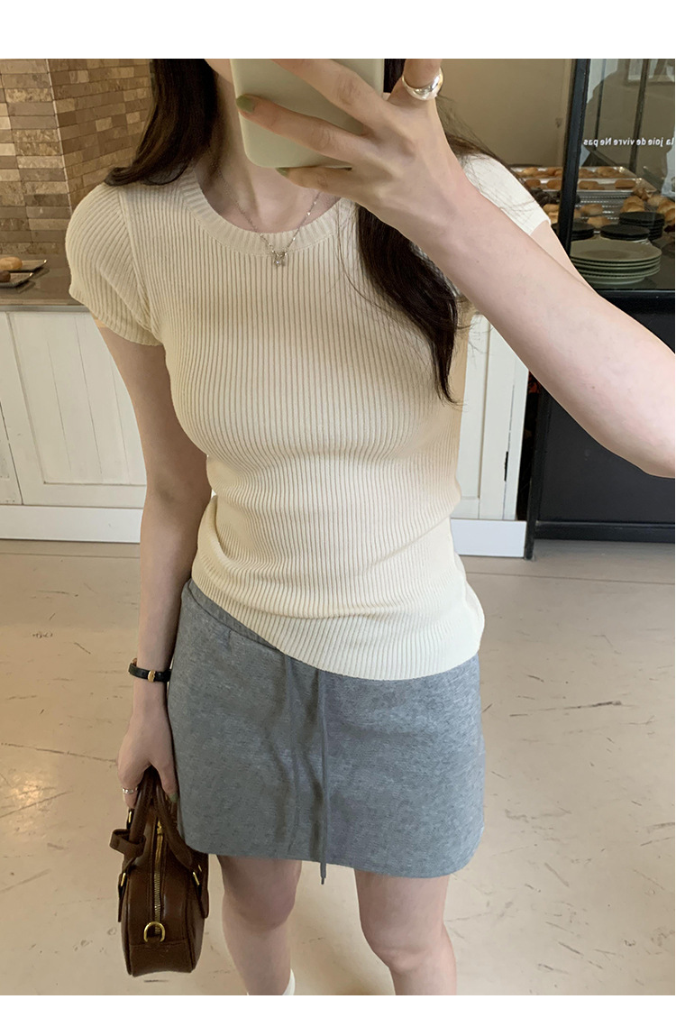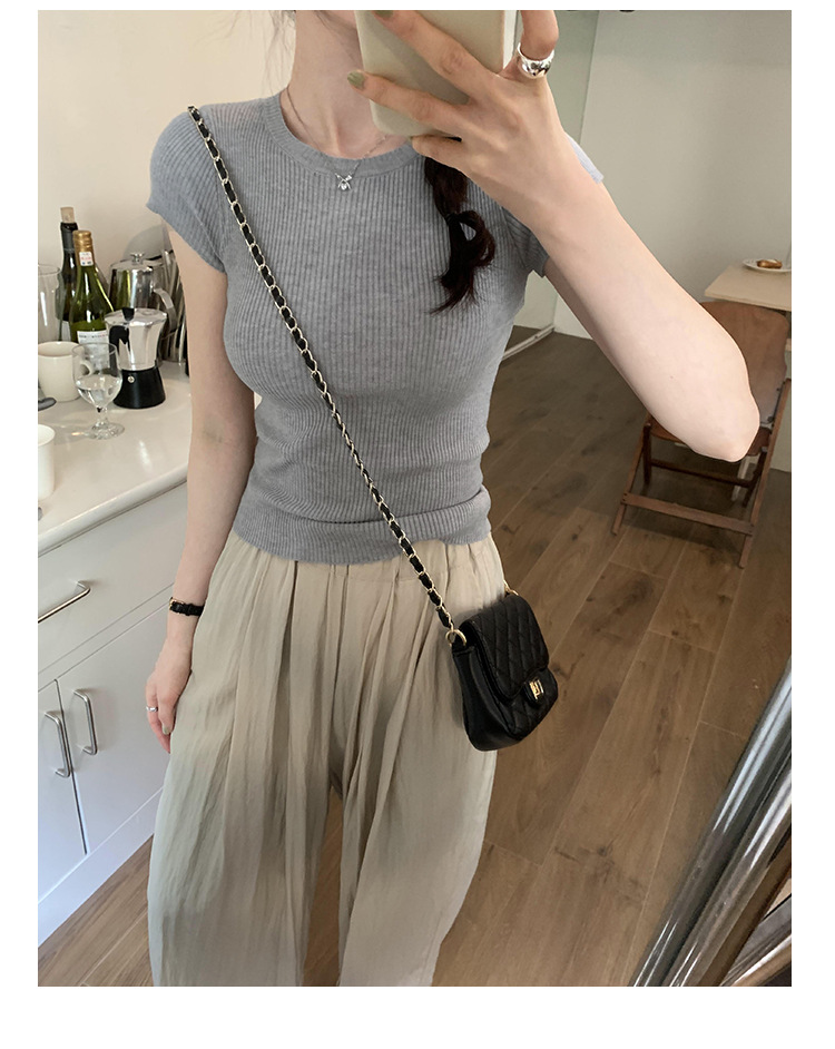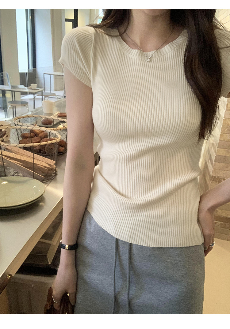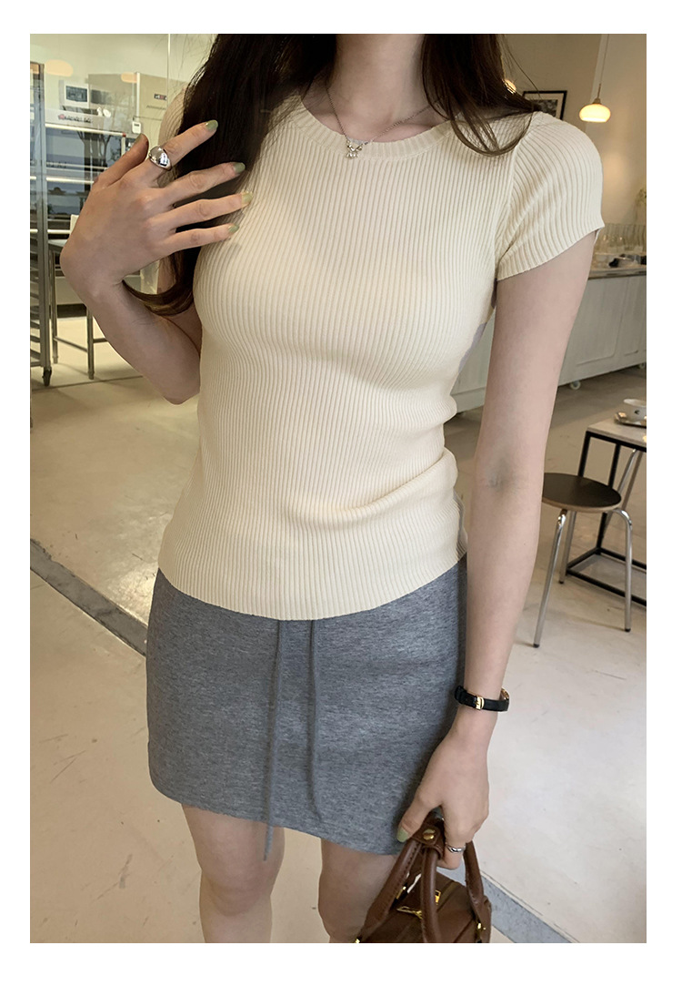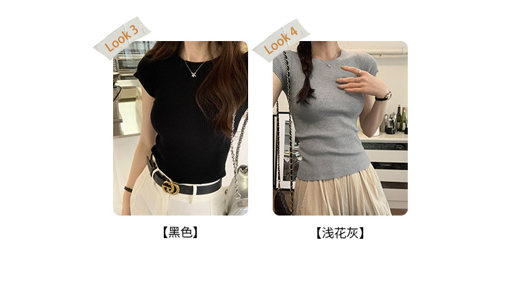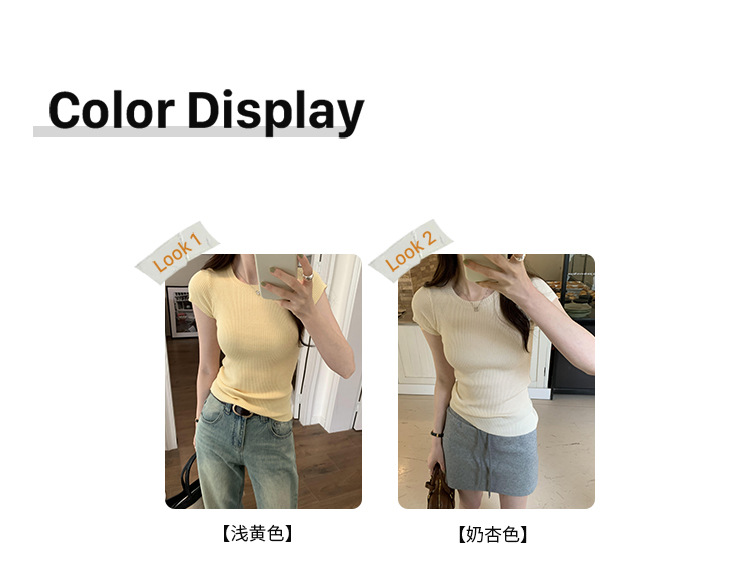 새로운 스타일 간단한 올 매치 반팔 티셔츠 여성용 최고 솔리드 컬러 라운드 넥 슬림 핏 슬리밍 탄성 니트 셔츠 탑스토어 가기