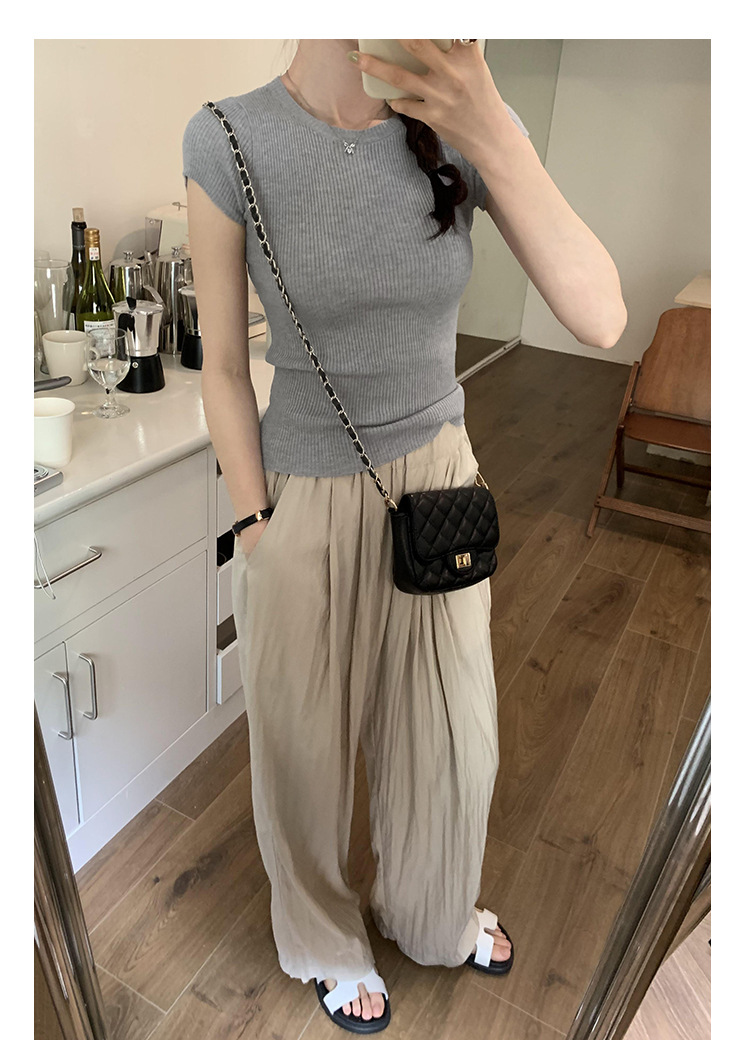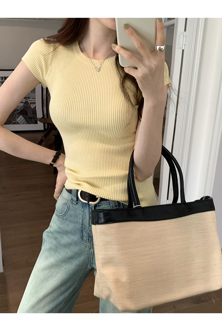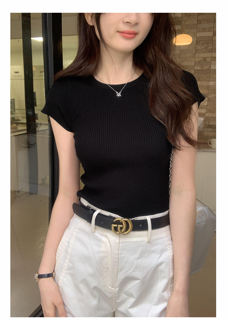 새로운 스타일 간단한 올 매치 반팔 티셔츠 여성용 최고 솔리드 컬러 라운드 넥 슬림 핏 슬리밍 탄성 니트 셔츠 탑